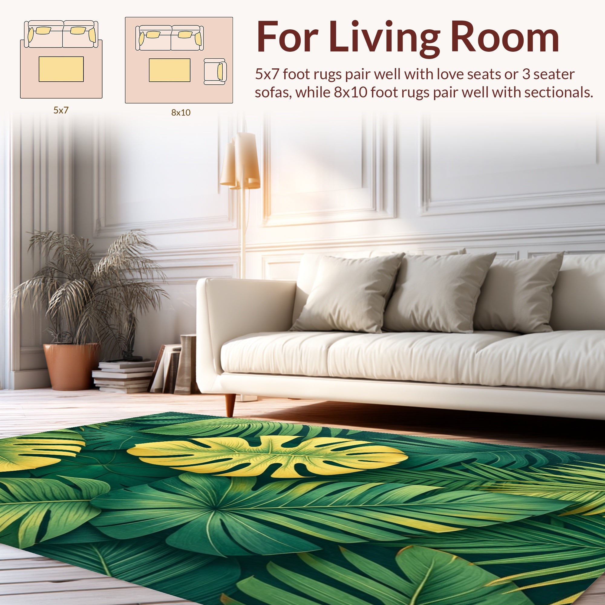 Flatwoven High Traffic Area Rug, Lush Monstera Inspired, Non Slip, Stain Resistant, Washable Area Rugs for Living Room, Bedroom (Green) Overview: