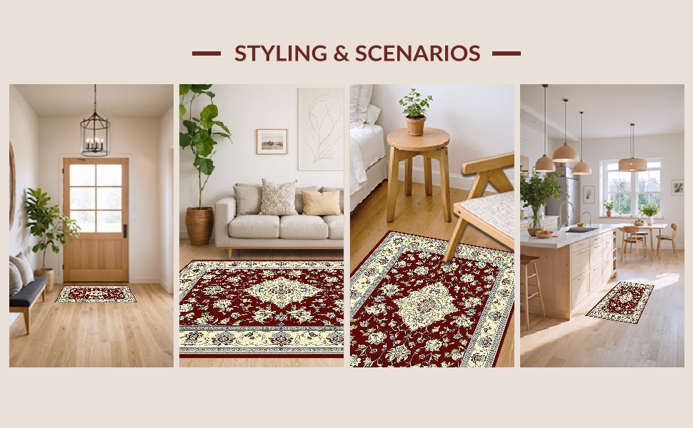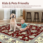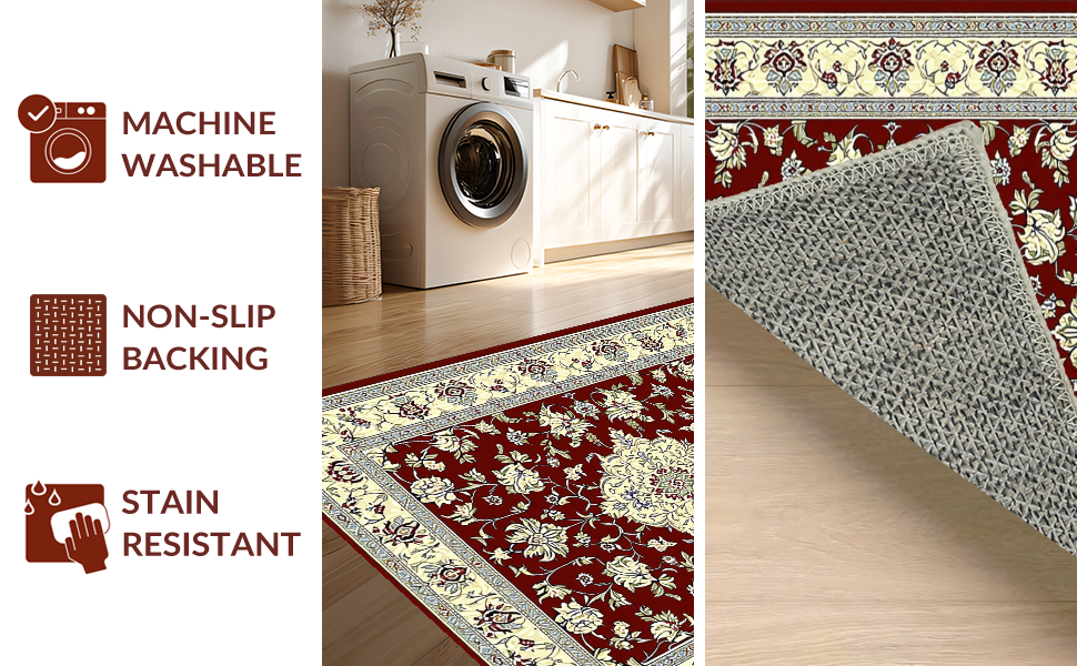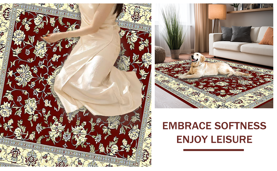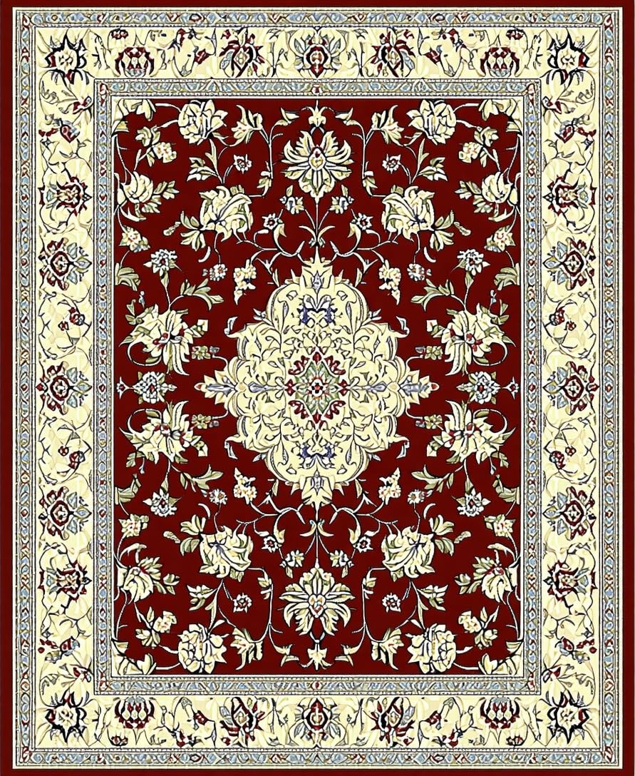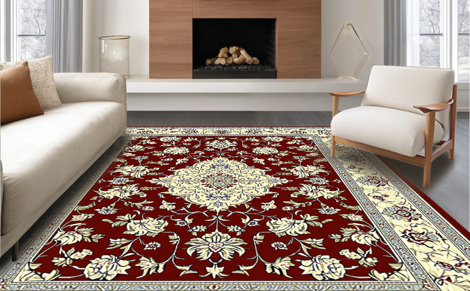 Ultra Soft Area Rug, Non Slip, Stain Resistant, Washable Area Rugs for Living Room, Bedroom, Luxurious Burgundy and Ivory Motif(Red) Overview: