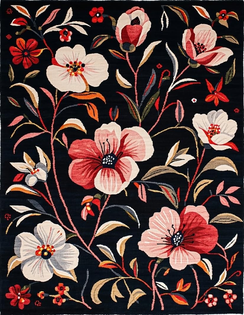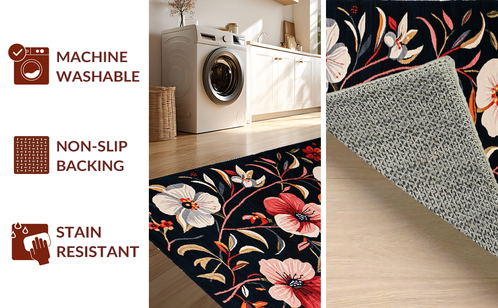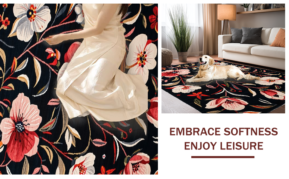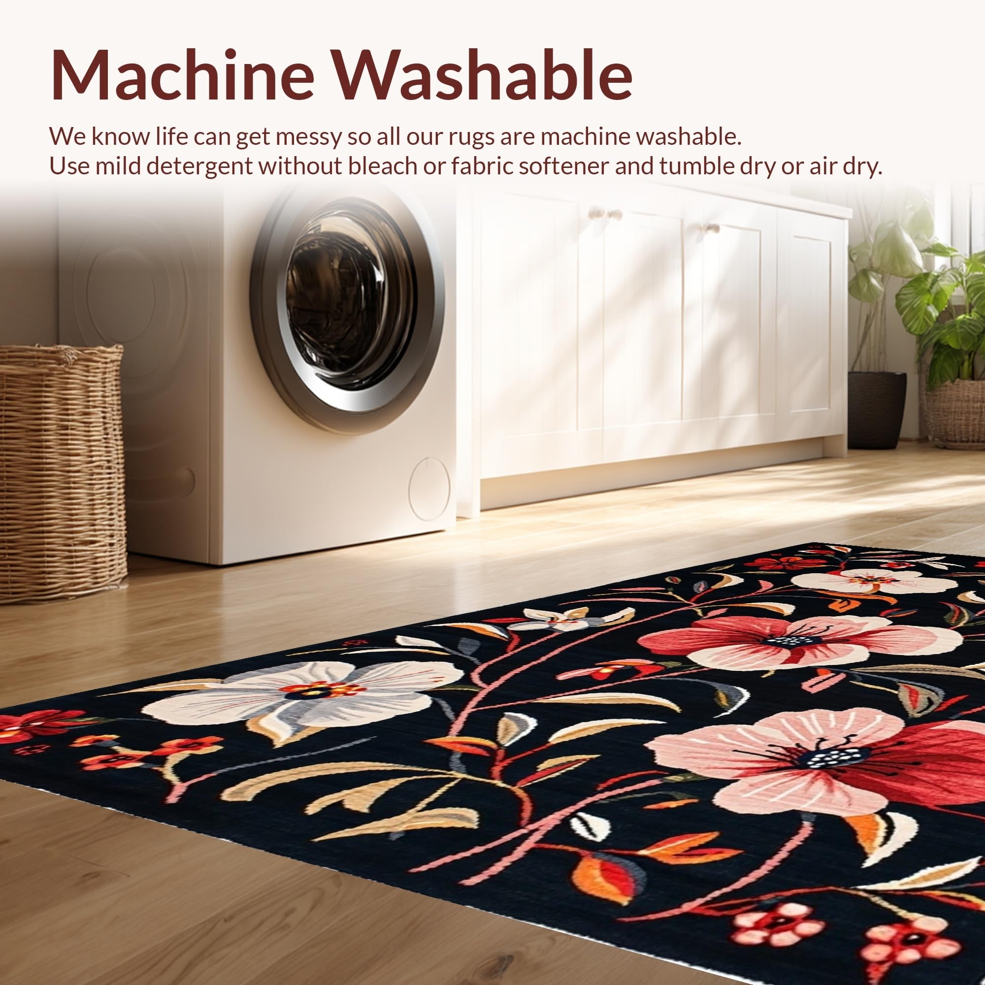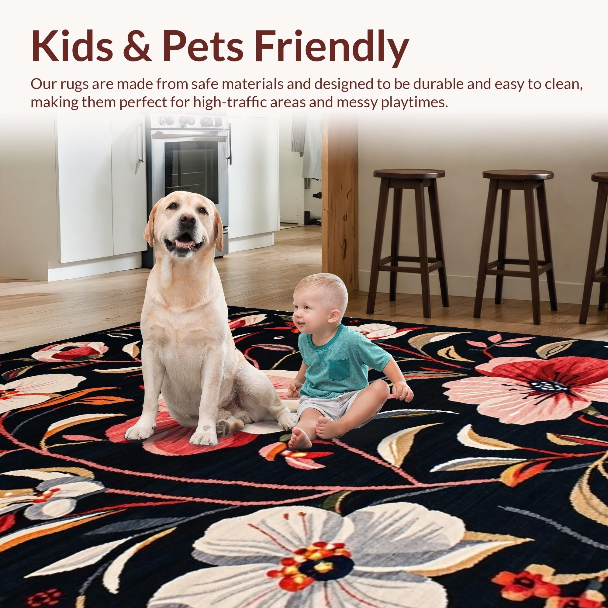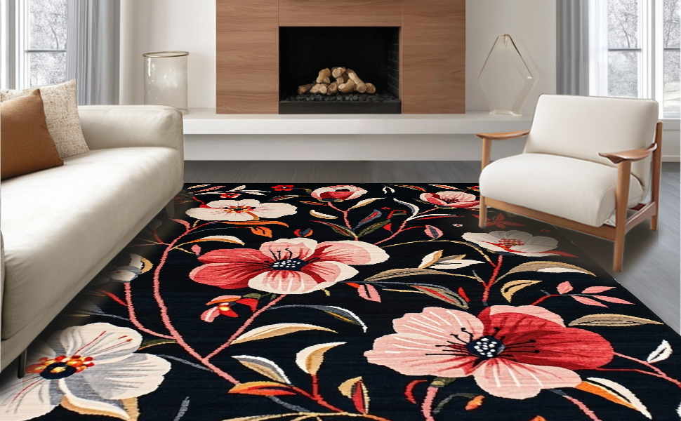 Ultra Soft Area Rug, Non Slip, Stain Resistant, Washable Area Rugs for Living Room, Bedroom, Luxurious Dark Floral Composition(Black) Overview:
