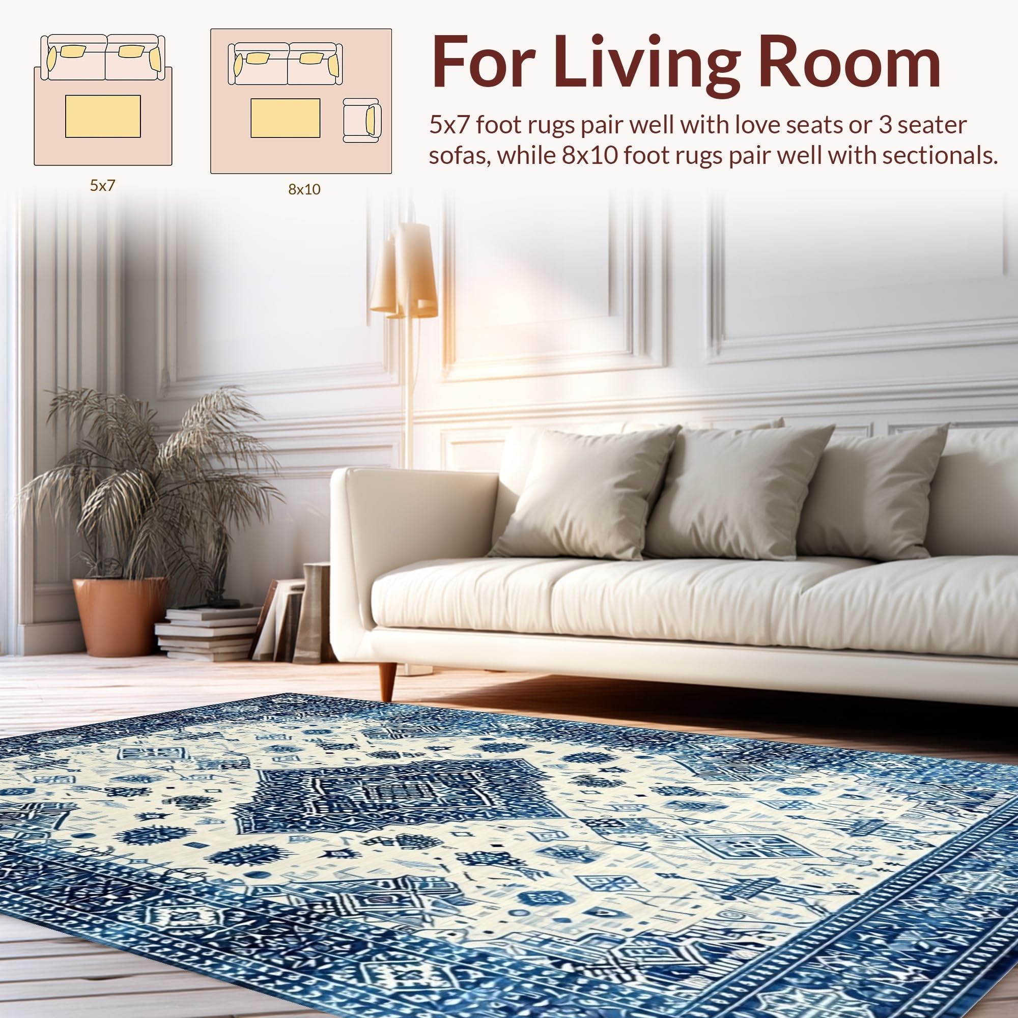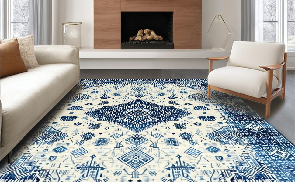 Ultra Soft Area Rug, Non Slip, Stain Resistant, Washable Area Rugs for Living Room, Bedroom, Luxurious Tiled Floral Aesthetic(Blue) Overview: