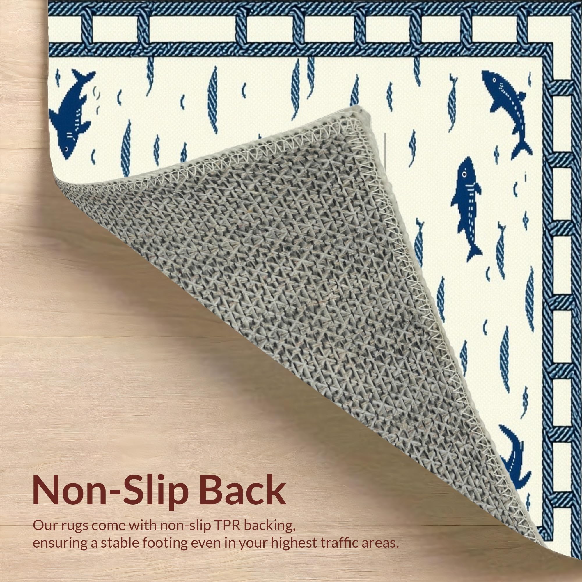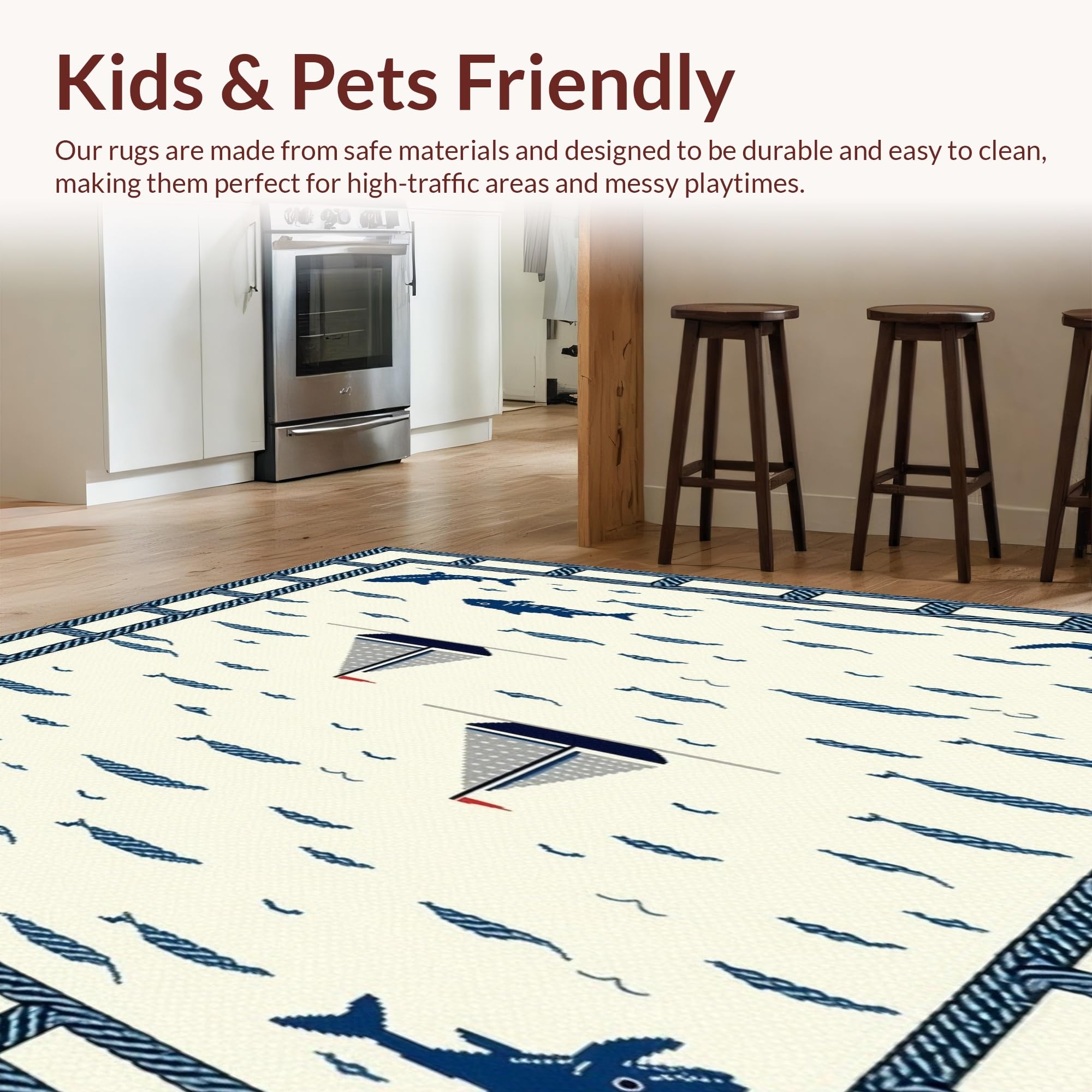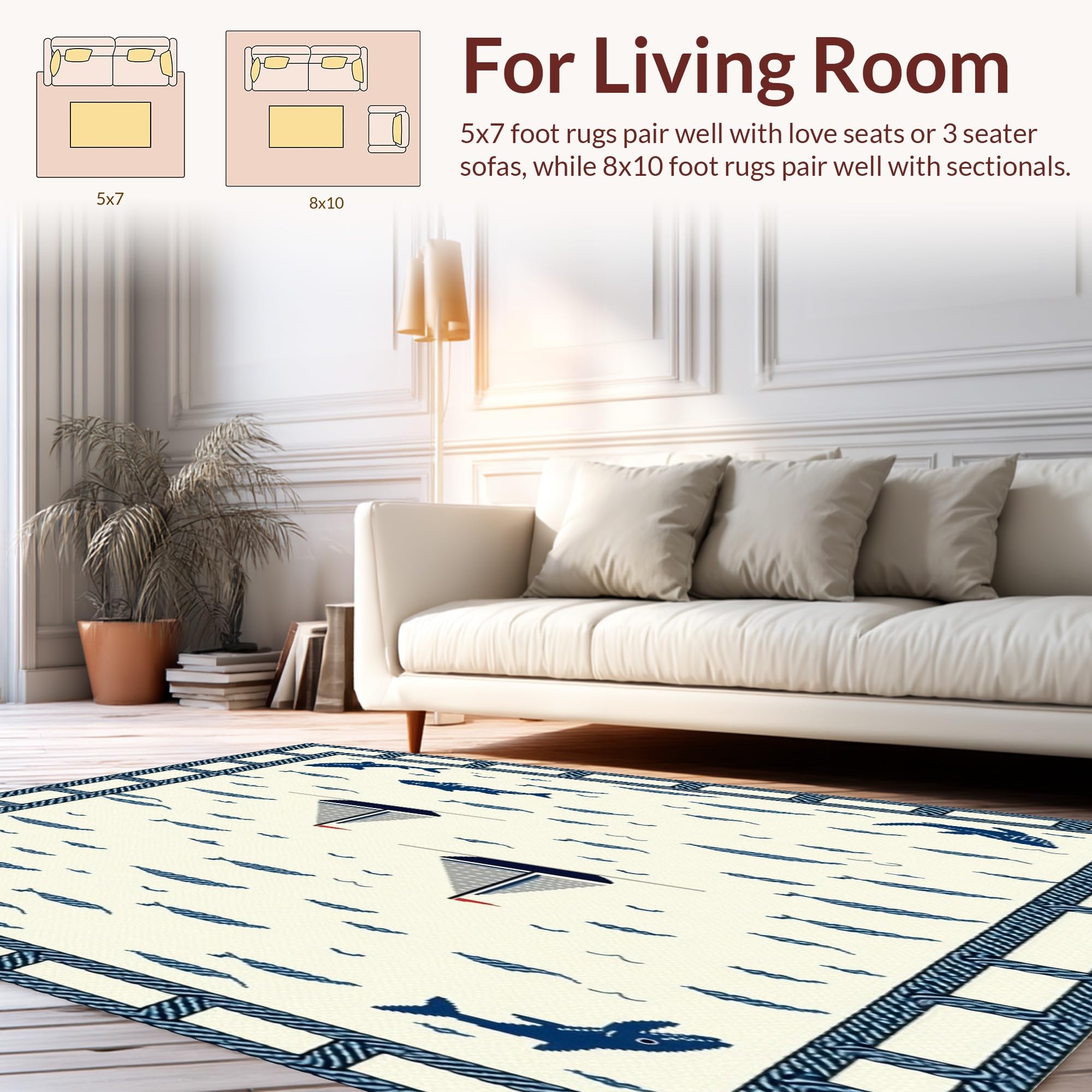 Ultra Soft Area Rug, Non Slip, Stain Resistant, Washable Area Rugs for Living Room, Bedroom, Marine Life Inspired Area Rug with Nautical Ropes and Sailboat Silhouettes(Beige) Overview: