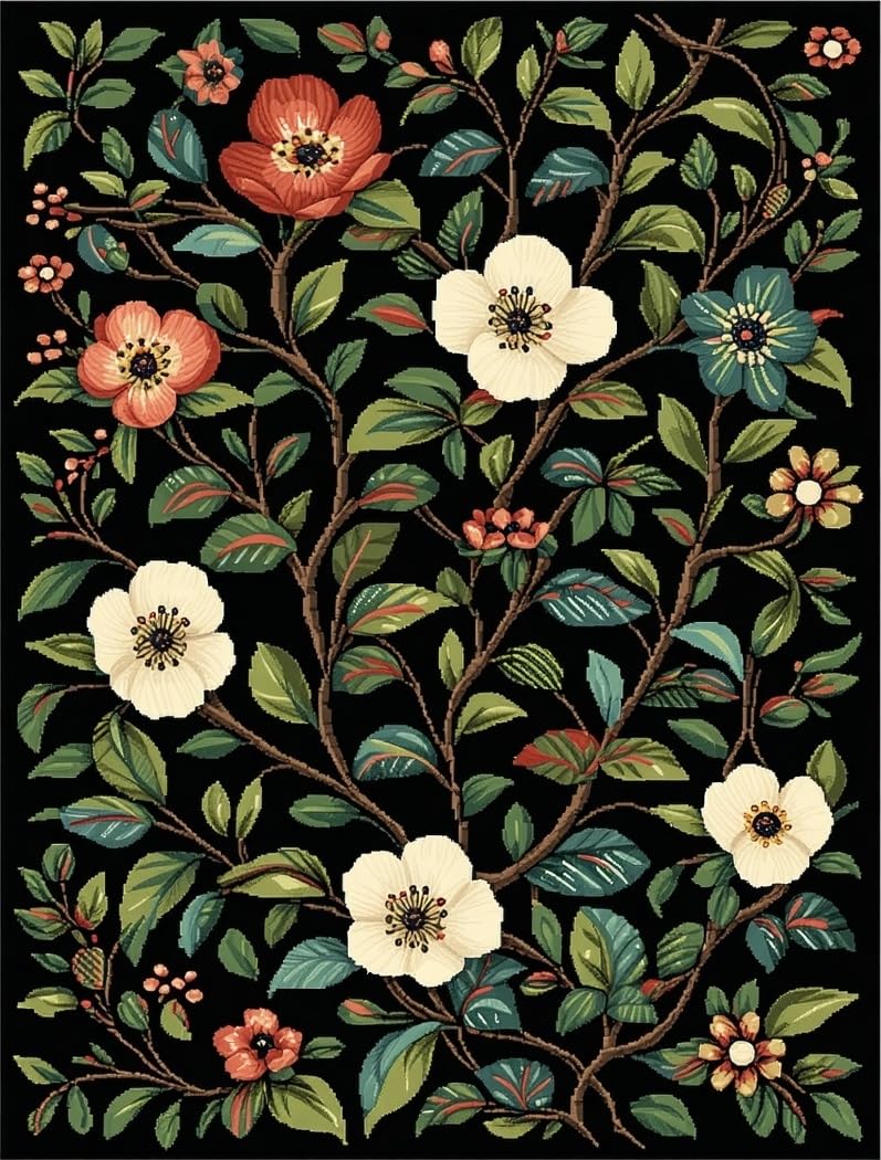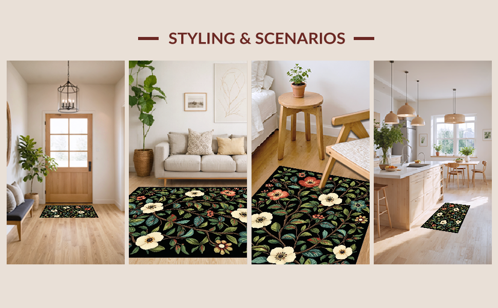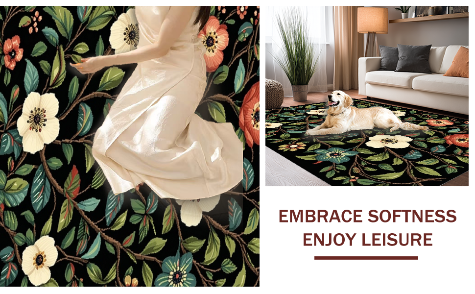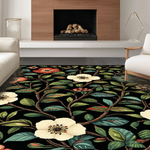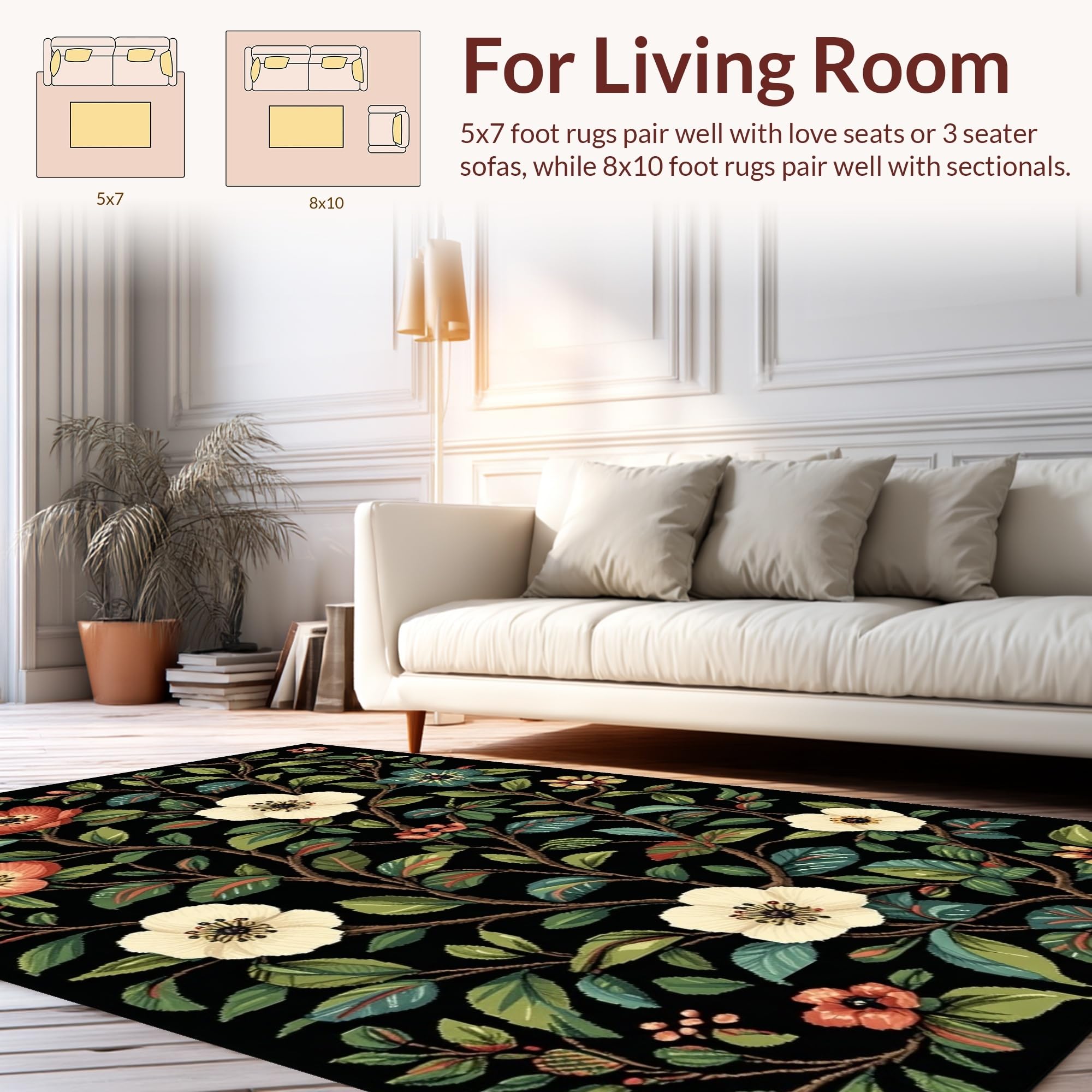 Ultra Soft Area Rug, Non Slip, Stain Resistant, Washable Area Rugs for Living Room, Bedroom, Maximalist Botanical Floral Fusion(Black) Overview: