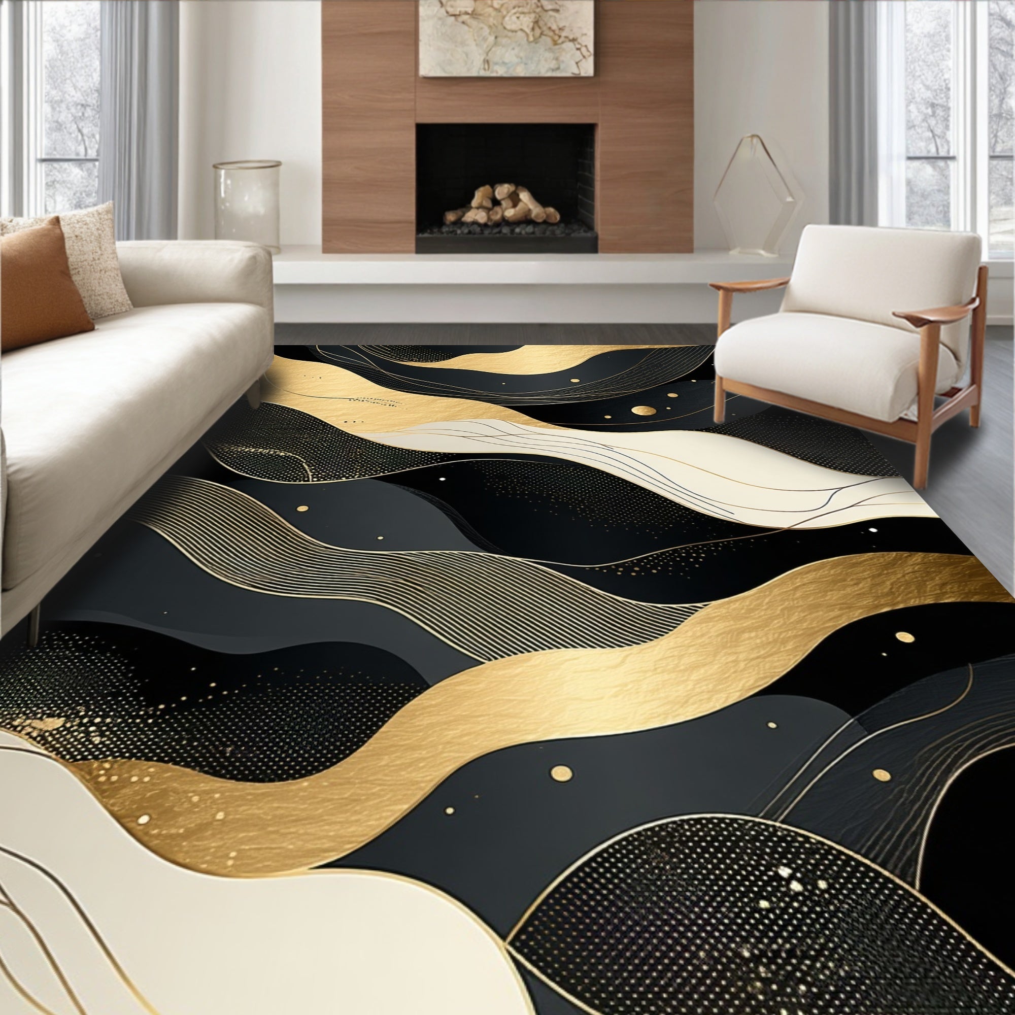 Flatwoven High Traffic Area Rug, Modern Abstract Black and Gold with Fluid Geometric Swirls Accents, Non Slip, Stain Resistant, Washable Area Rugs for Living Room, Bedroom (Black) Overview: