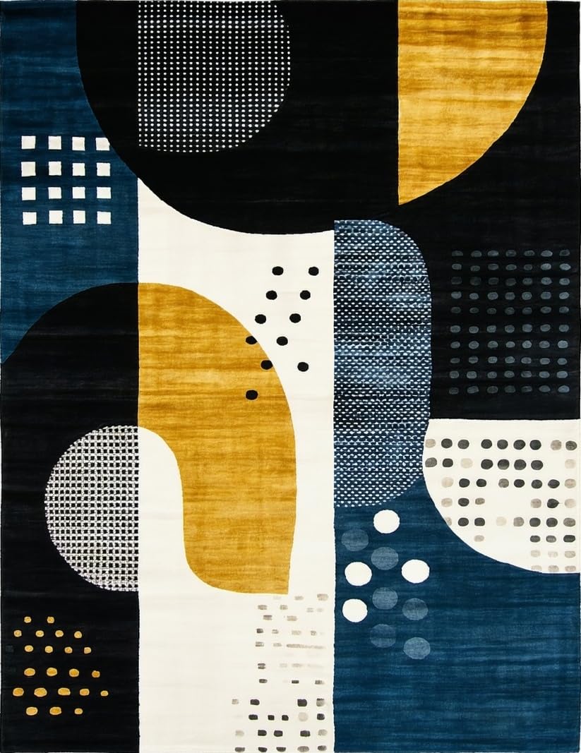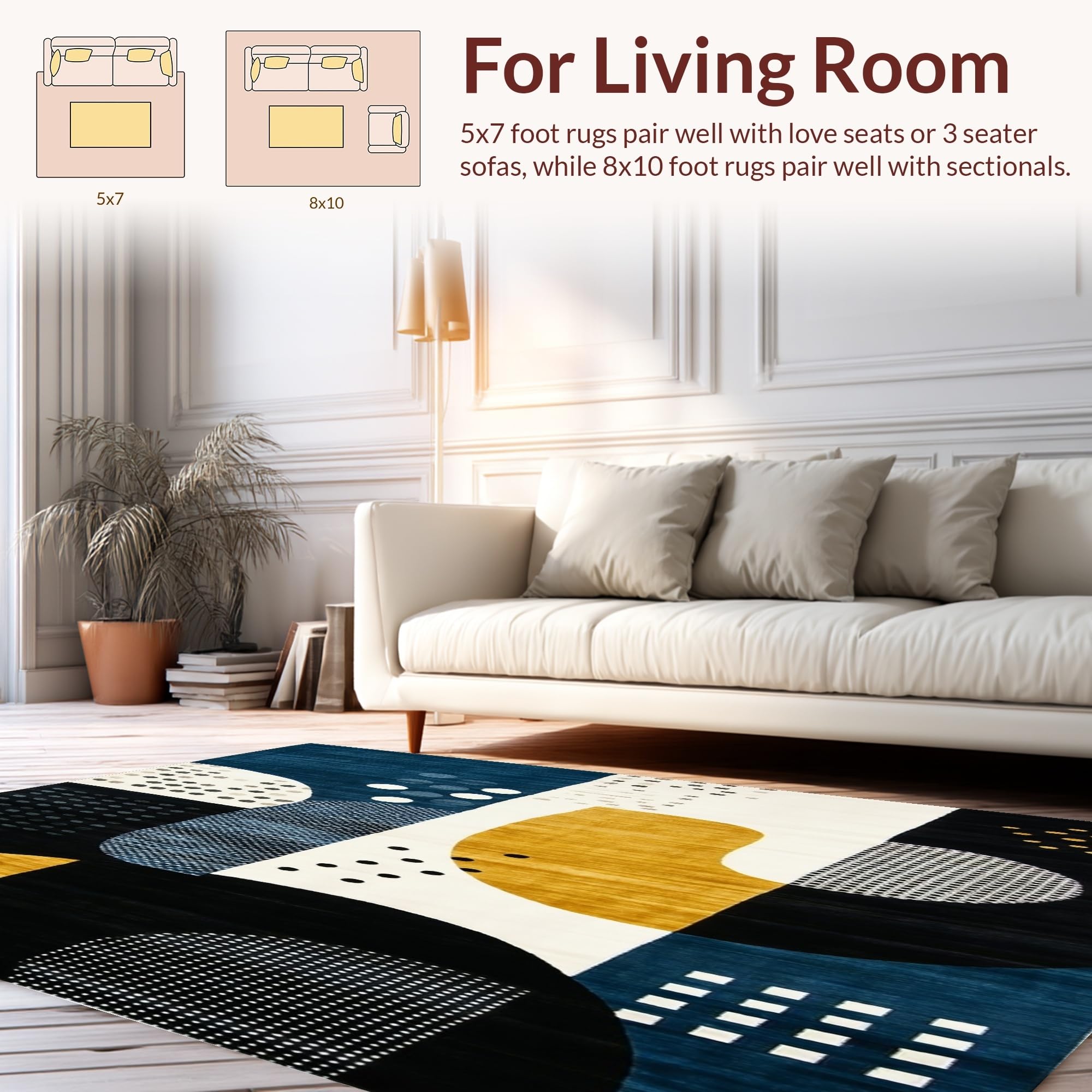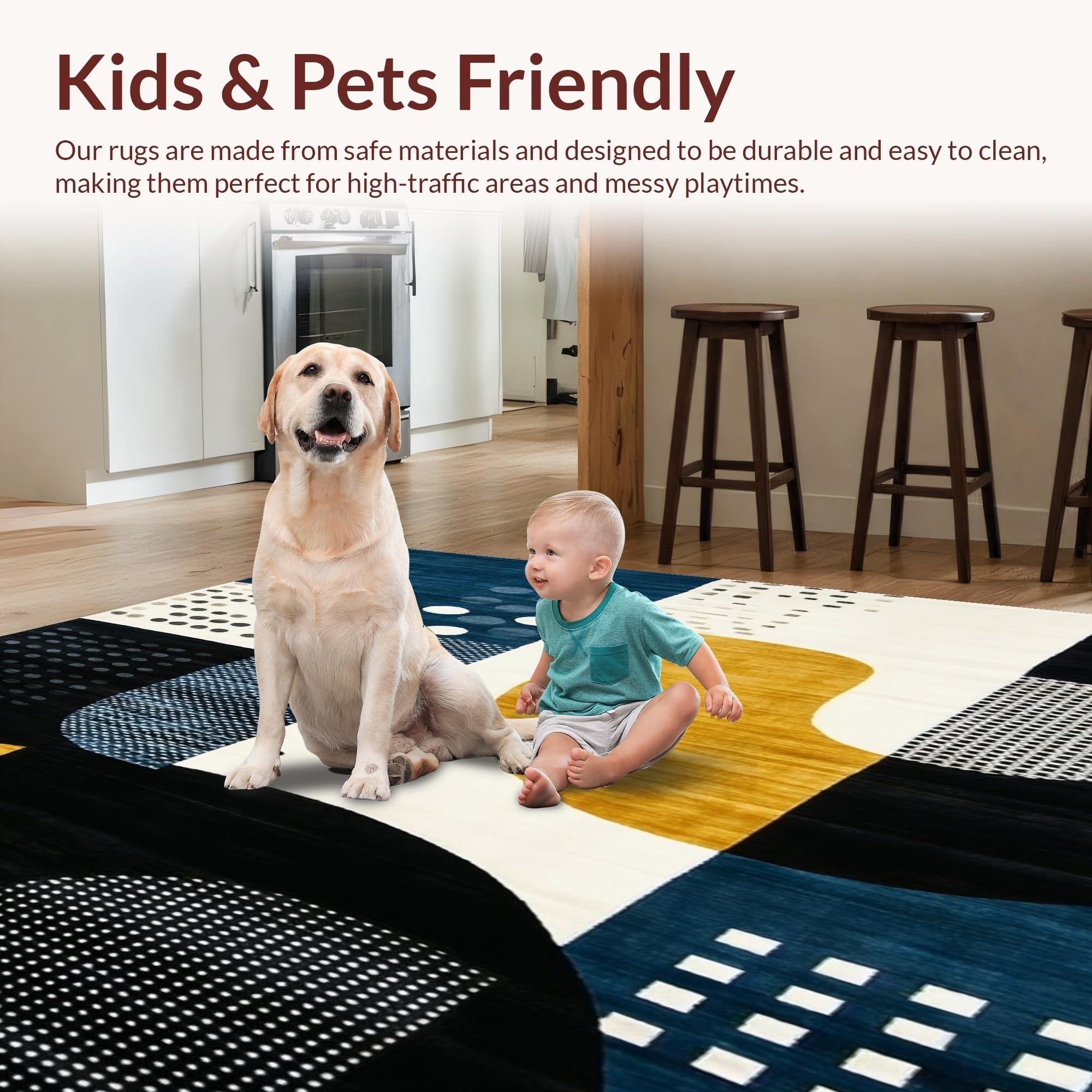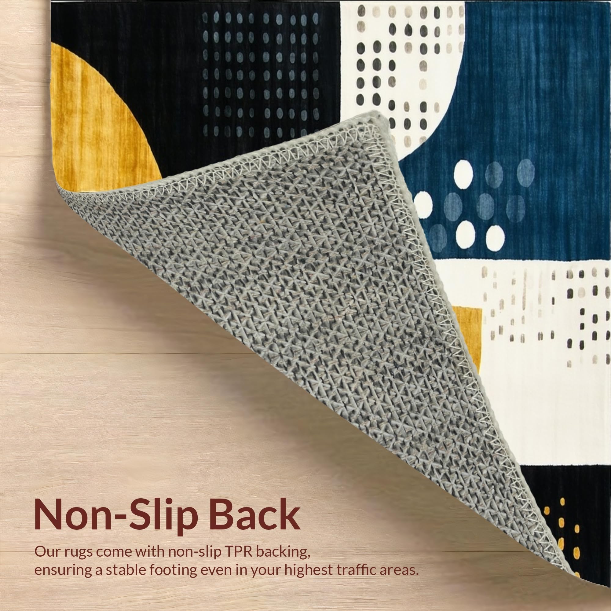 Ultra Soft Area Rug, Non Slip, Stain Resistant, Washable Area Rugs for Living Room, Bedroom, Modern Abstract Spotted Area with Navy and Mustard Accents(Gold) Overview: