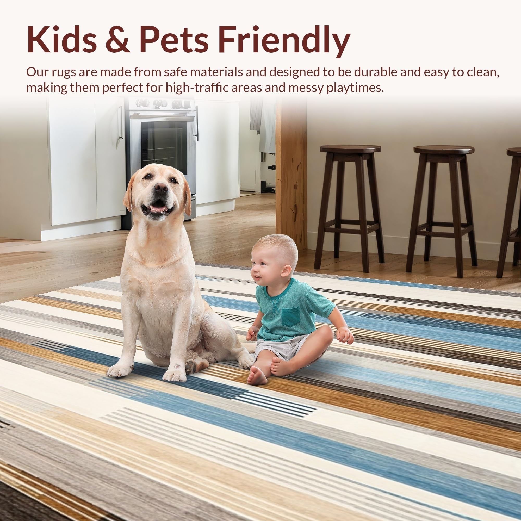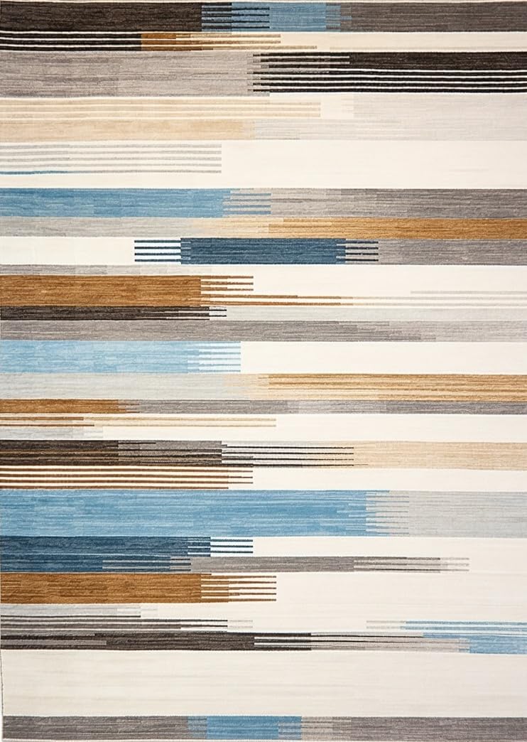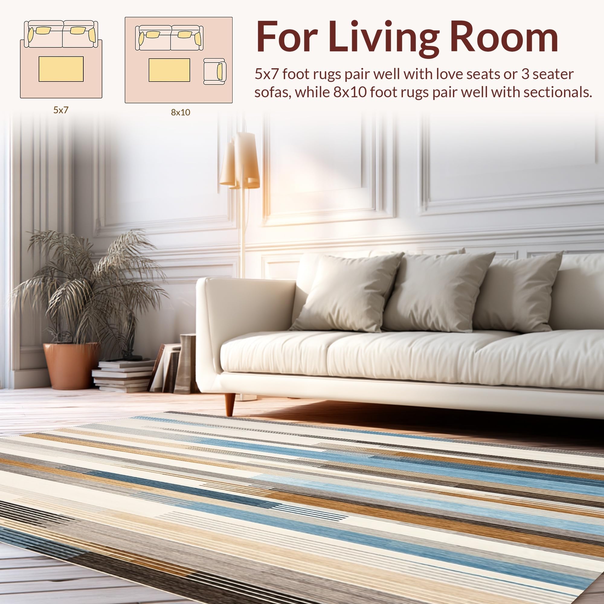 Ultra Soft Area Rug, Non Slip, Stain Resistant, Washable Area Rugs for Living Room, Bedroom, Modern Abstract Striped with Cream Brown Blue and Gray Bands(Beige) Overview: