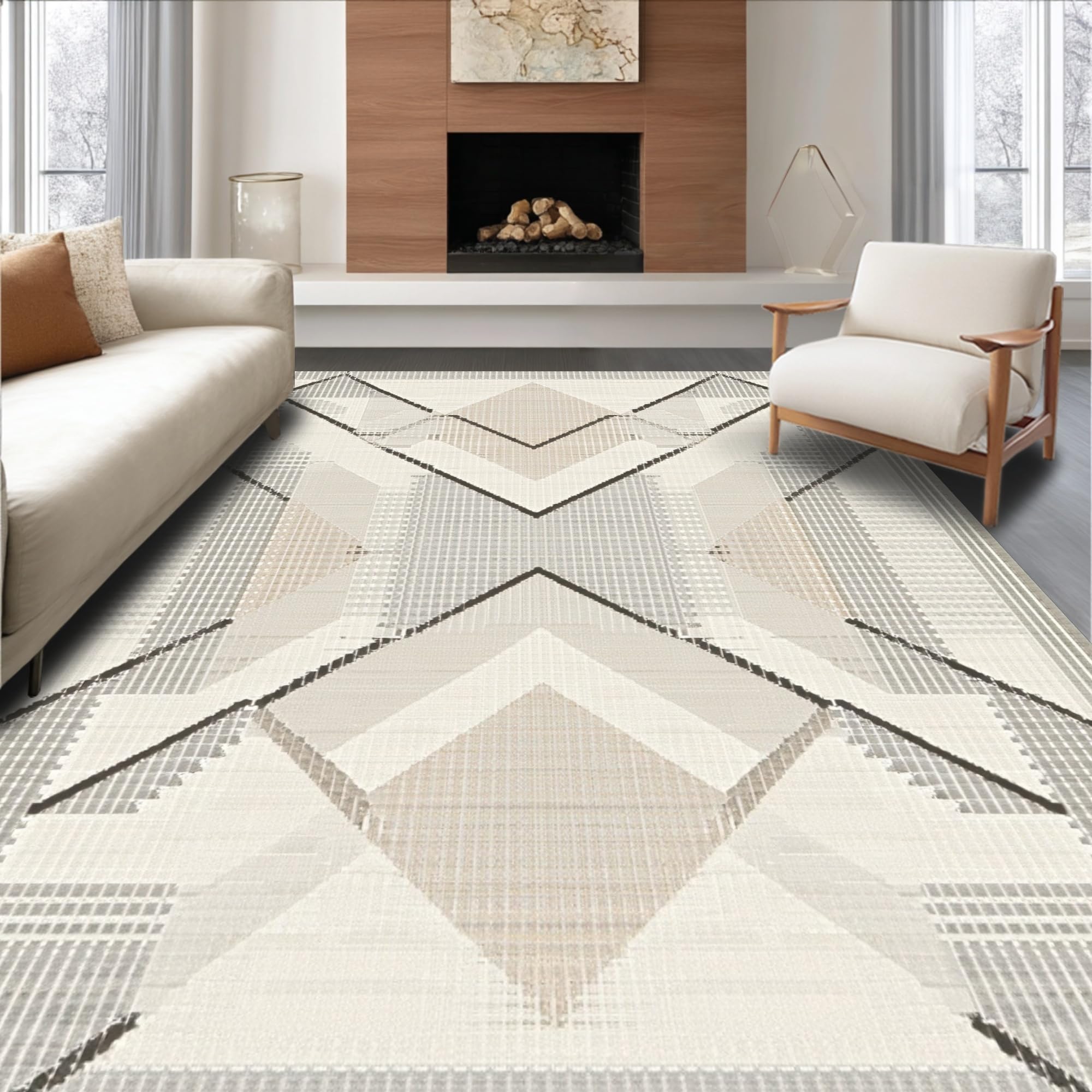 Ultra Soft Area Rug, Non Slip, Stain Resistant, Washable Area Rugs for Living Room, Bedroom, Modern Beige Geometric Diamond Patterned(Beige) Overview: