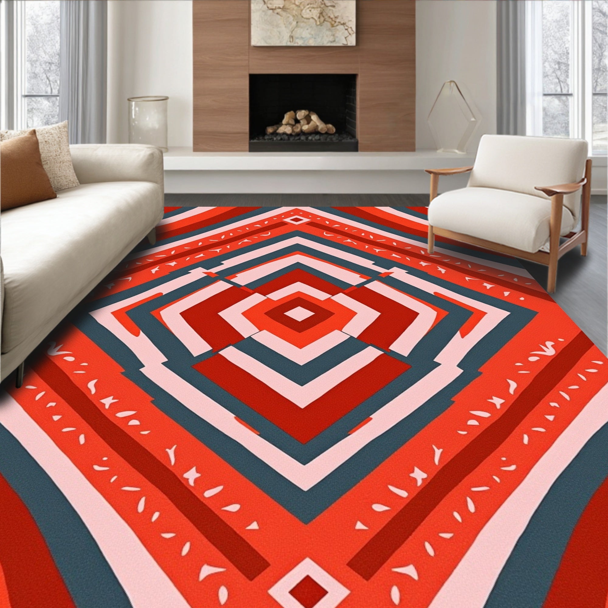 Ultra Soft Area Rug, Non Slip, Stain Resistant, Washable Area Rugs for Living Room, Bedroom, Modern Boho Chevron with Interlocking Zigzag and Accents(Red) Overview: