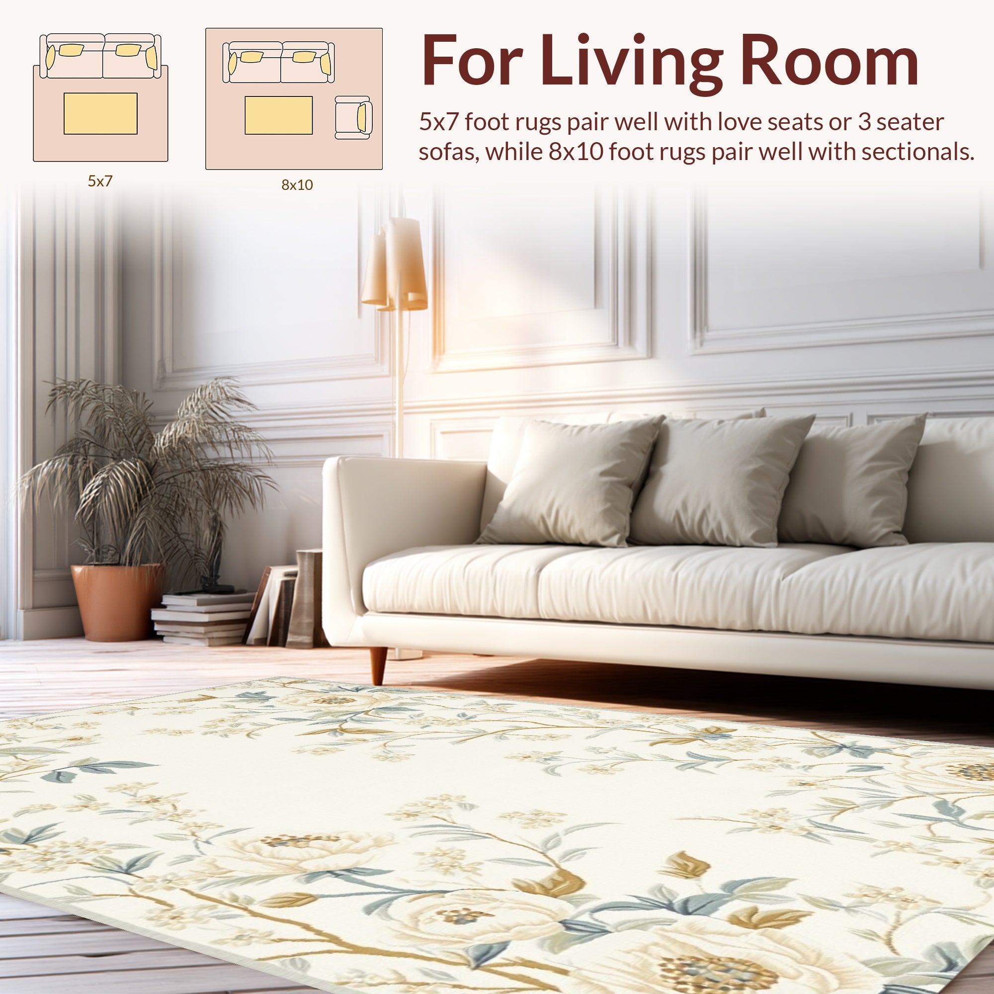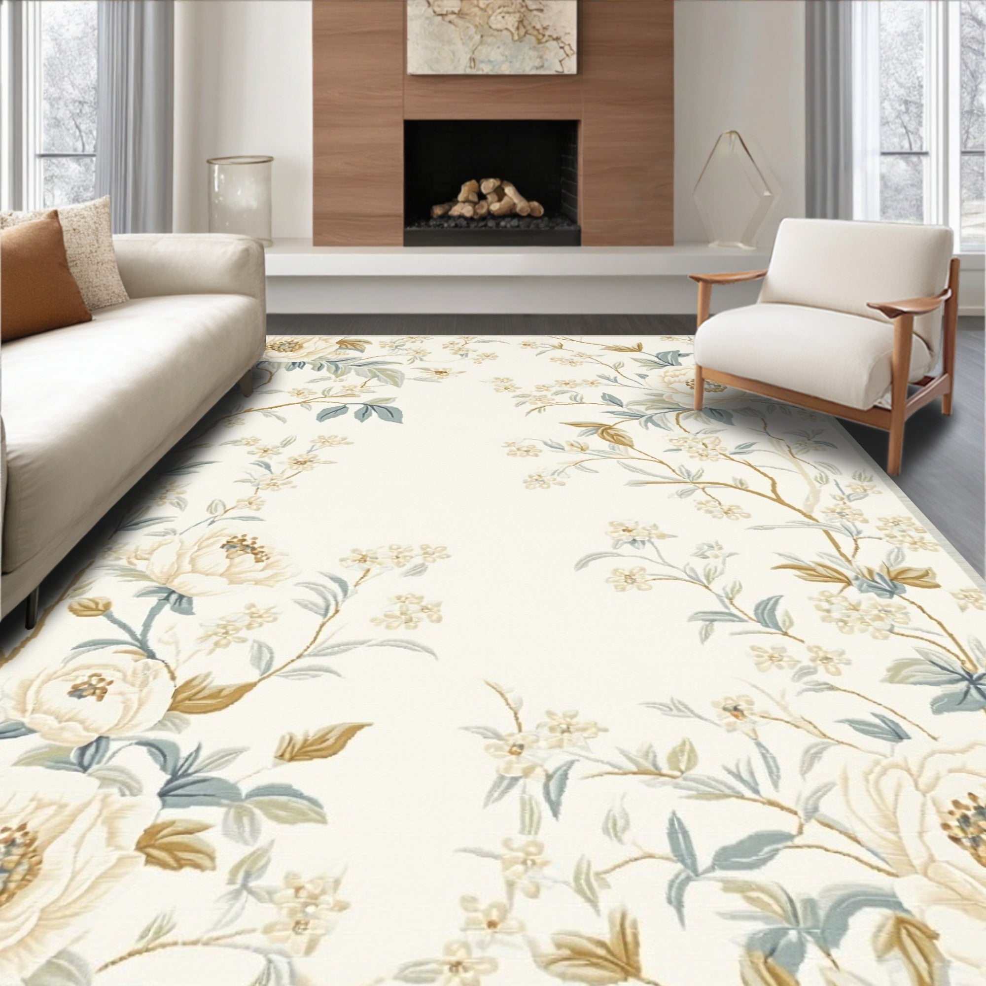 Flatwoven High Traffic Area Rug, Modern Botanical Garden Elegant Floral Design, Non Slip, Stain Resistant, Washable Area Rugs for Living Room, Bedroom (Ivory) Overview: