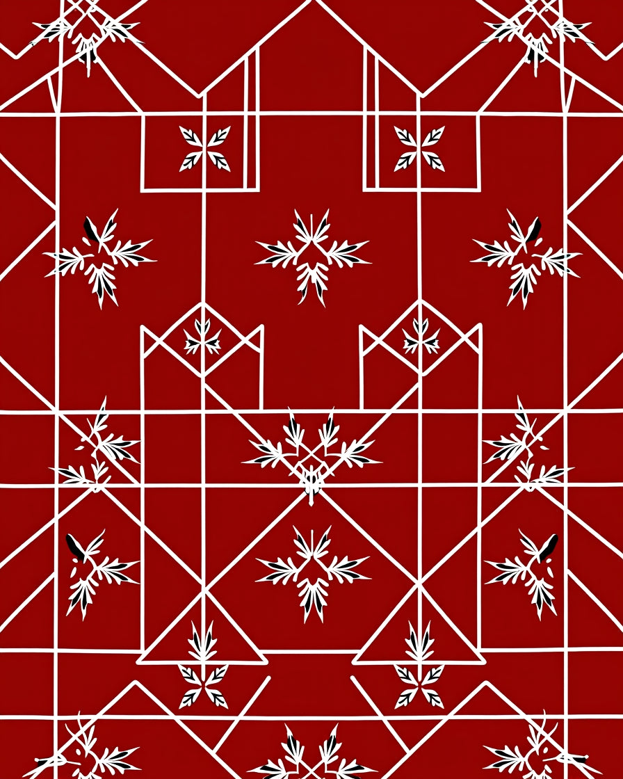 Modern Festive Checkered Grid with Minimalist Holly Leaf and Interlocking Lines(Red)