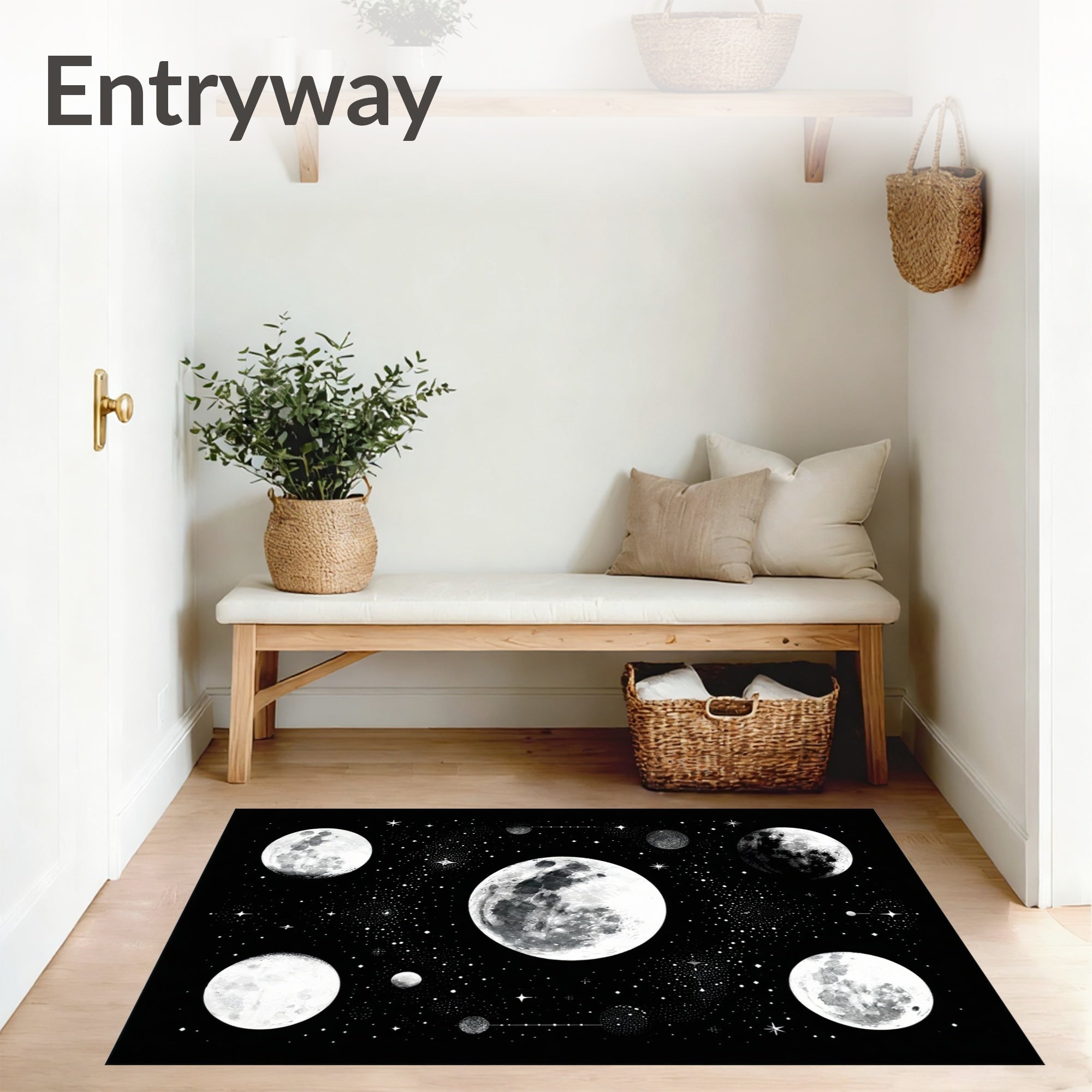 Flatwoven High Traffic Area Rug, Mystic Moonbeam Black & Lunar Phase Bath Boho, Non Slip, Stain Resistant, Washable Area Rugs for Living Room, Bedroom (White) Overview: