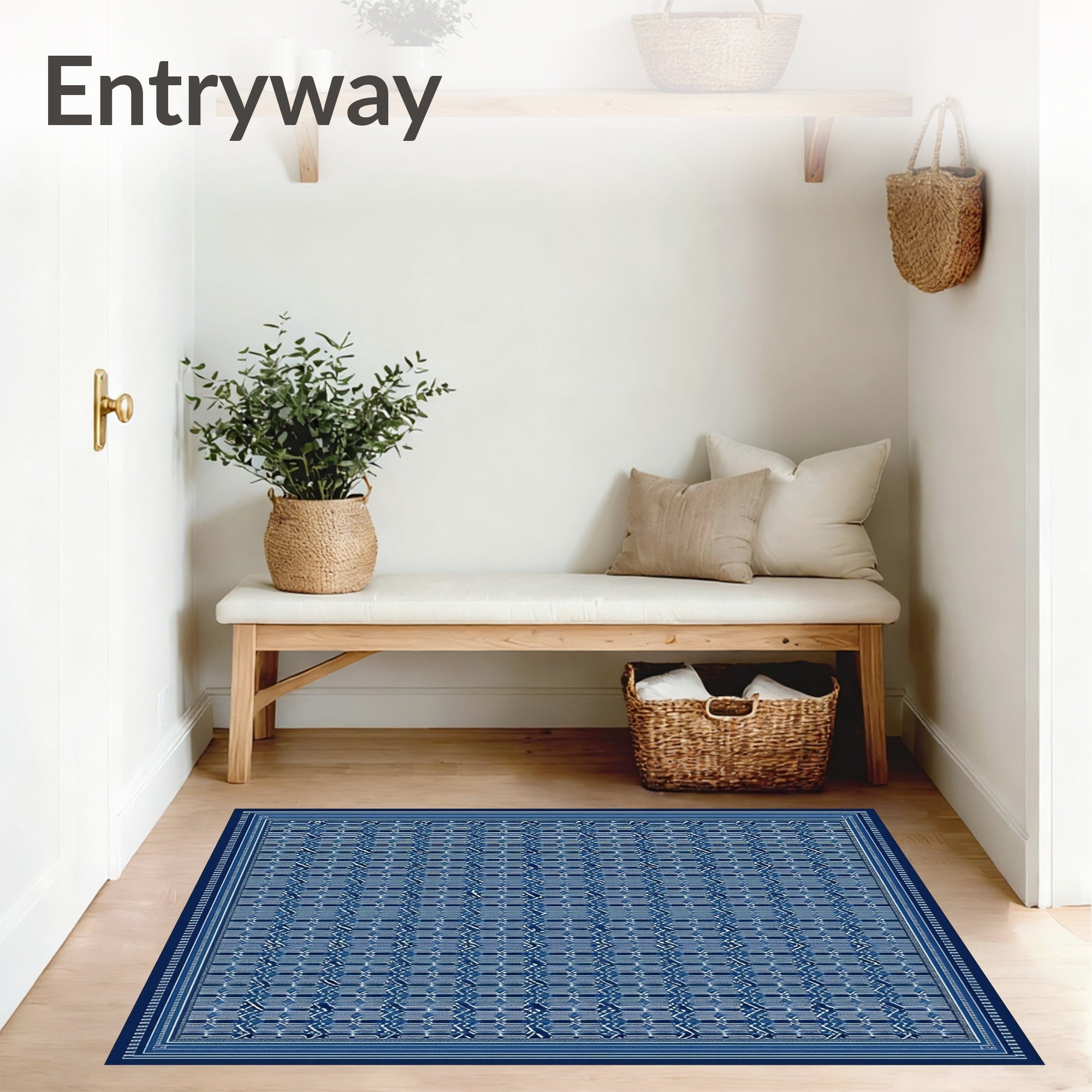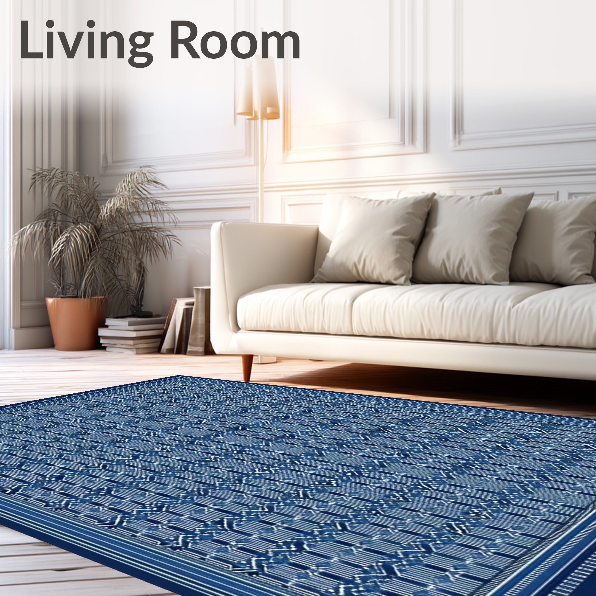 Flatwoven High Traffic Area Rug, Navy Trellis Patio Easy Clean, Non Slip, Stain Resistant, Washable Area Rugs for Living Room, Bedroom (Blue) Overview: