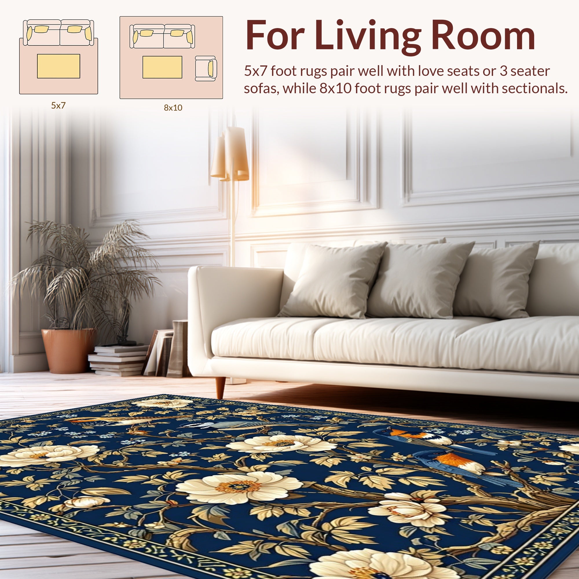 Flatwoven High Traffic Area Rug, Navy Toned Floral Elegance, Non Slip, Stain Resistant, Washable Area Rugs for Living Room, Bedroom (Blue) Overview: