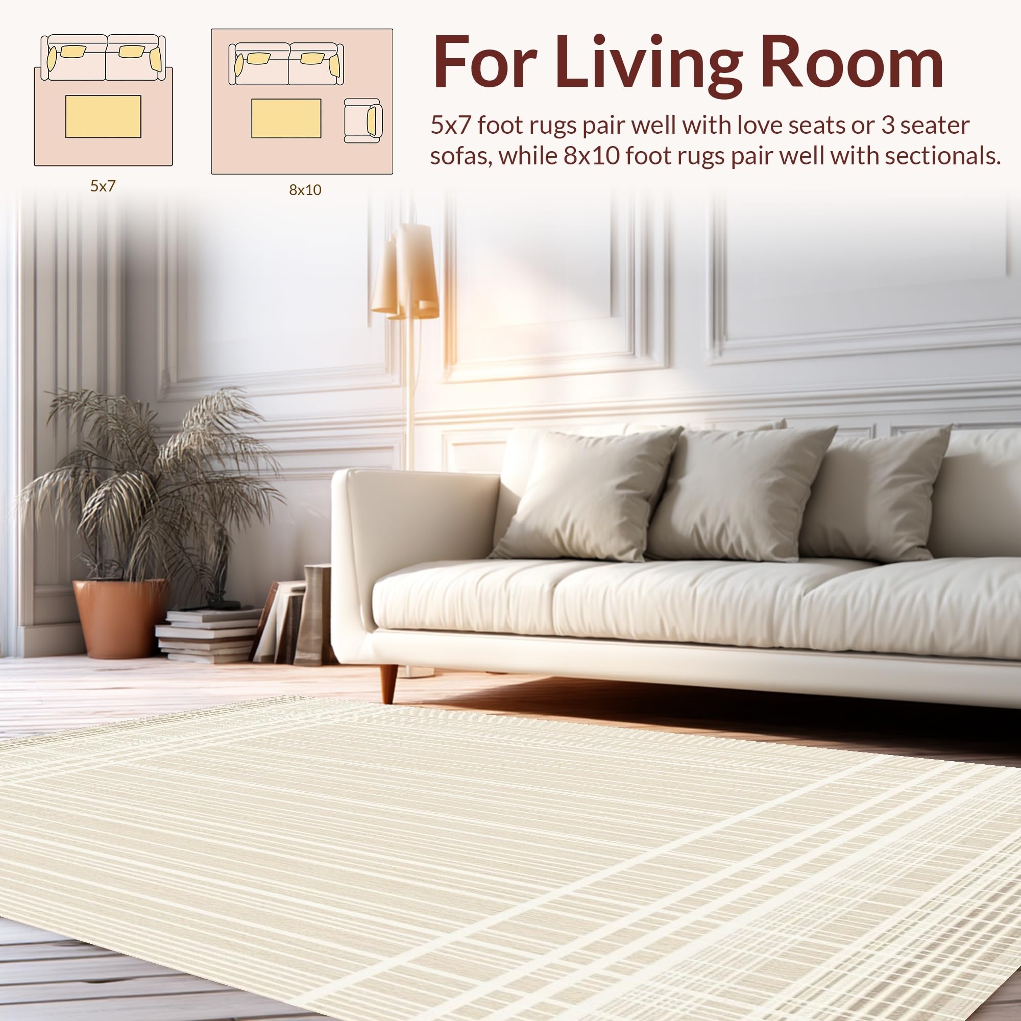 Ultra Soft Area Rug, Non Slip, Stain Resistant, Washable Area Rugs for Living Room, Bedroom, Neutral Beige Contemporary Lines & Boho Charm(Beige) Overview: