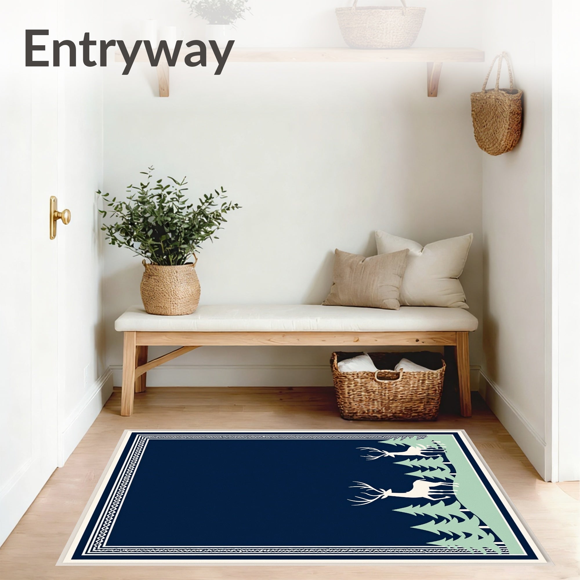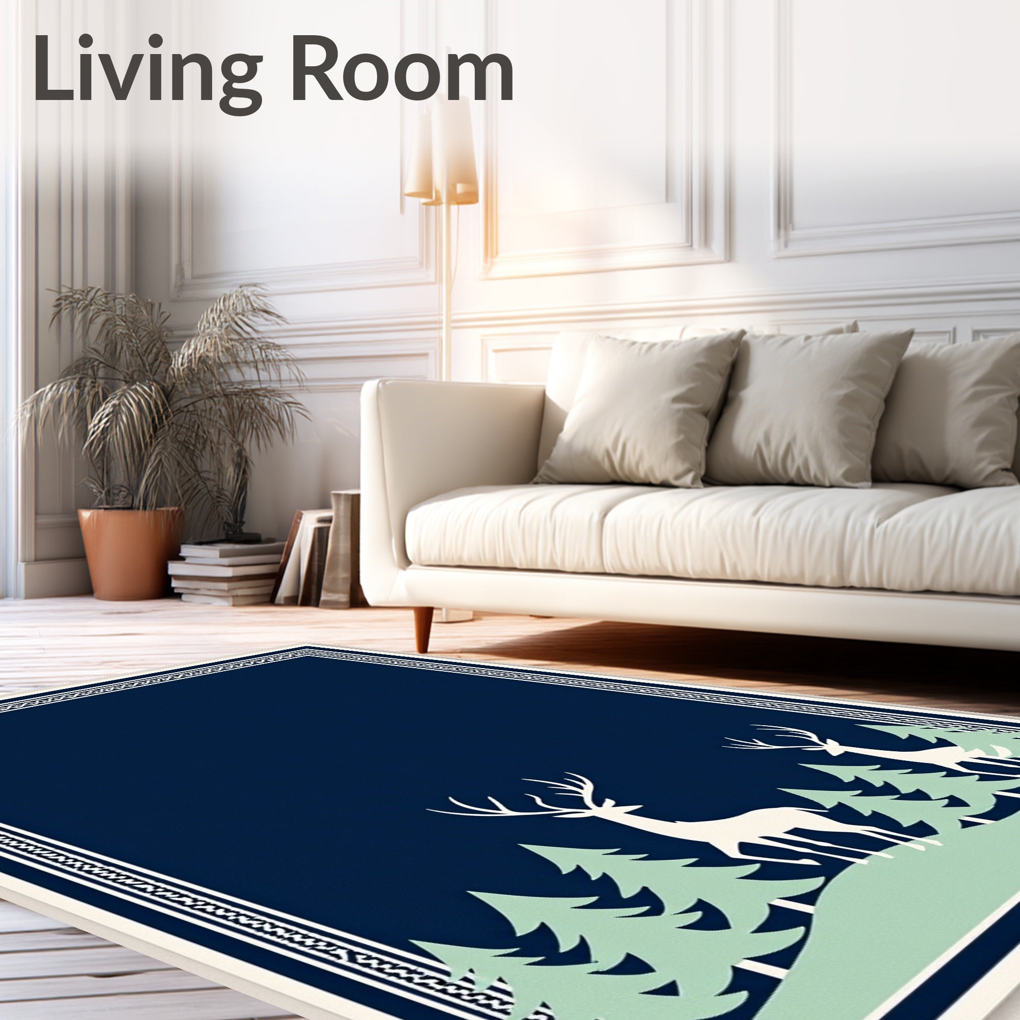 Ultra Soft Area Rug, Non Slip, Stain Resistant, Washable Area Rugs for Living Room, Bedroom, Nordic Caribou Doormat with Evergreen Tree Border(Blue) Overview: