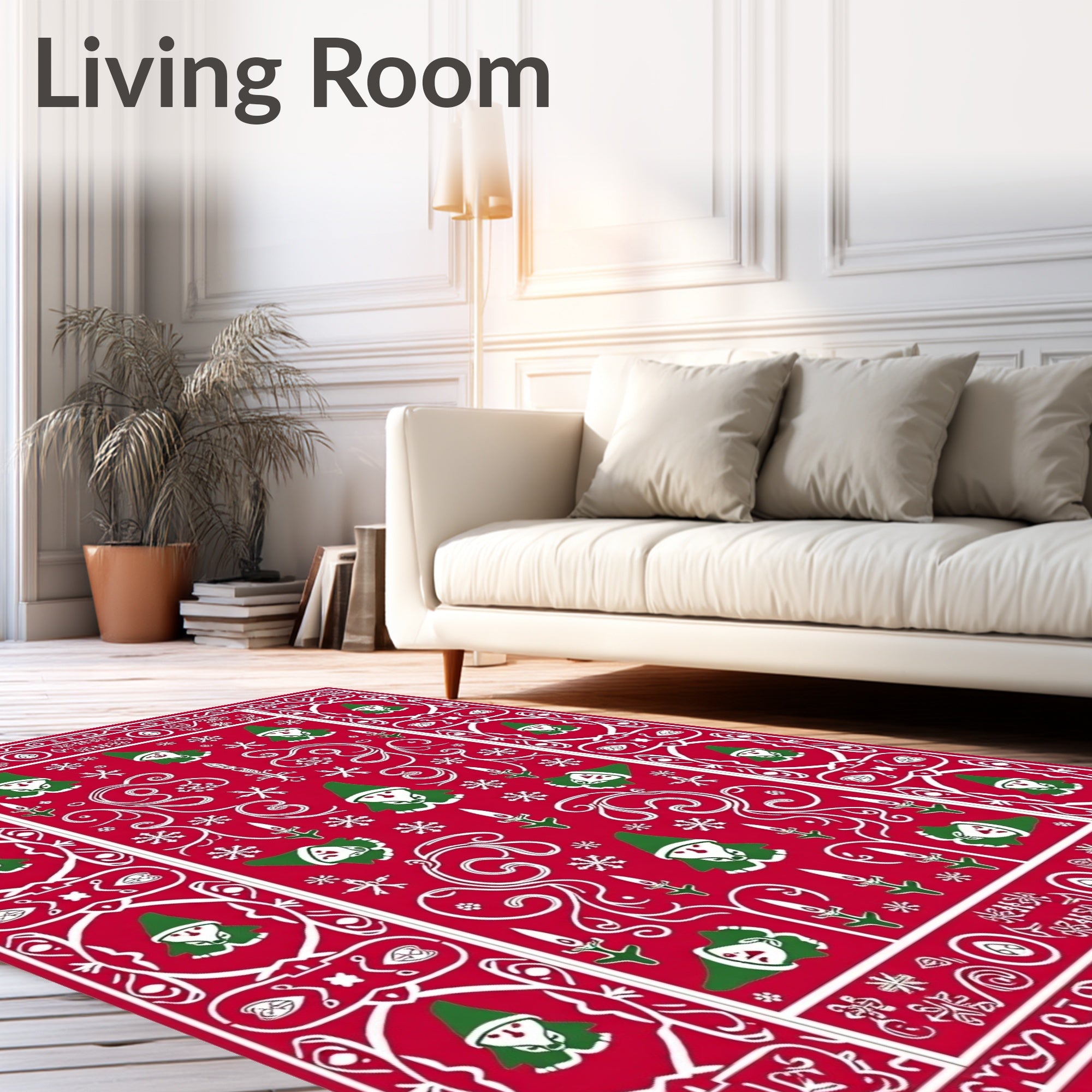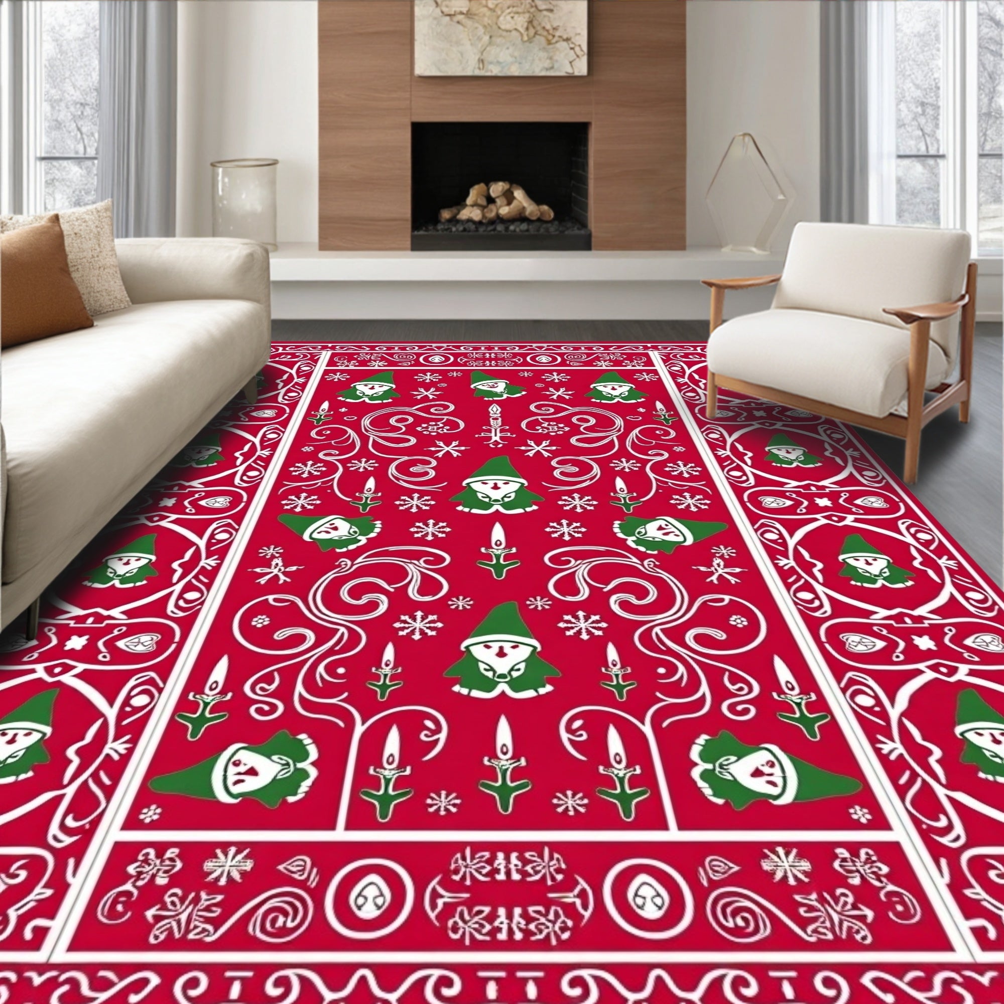 Ultra Soft Area Rug, Non Slip, Stain Resistant, Washable Area Rugs for Living Room, Bedroom, Nordic Gnome Holiday Gathering with Snowflake Motifs and Candle Accents(Red) Overview: