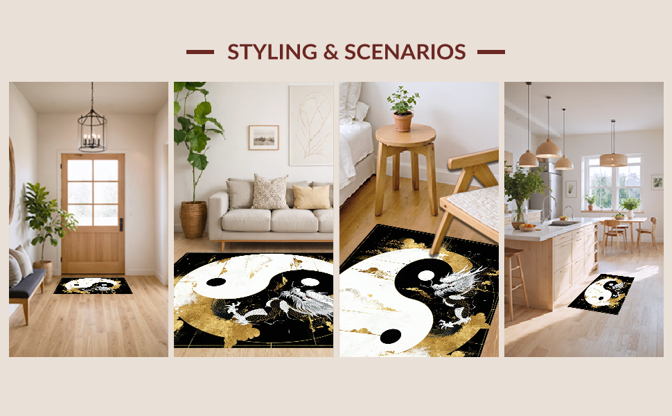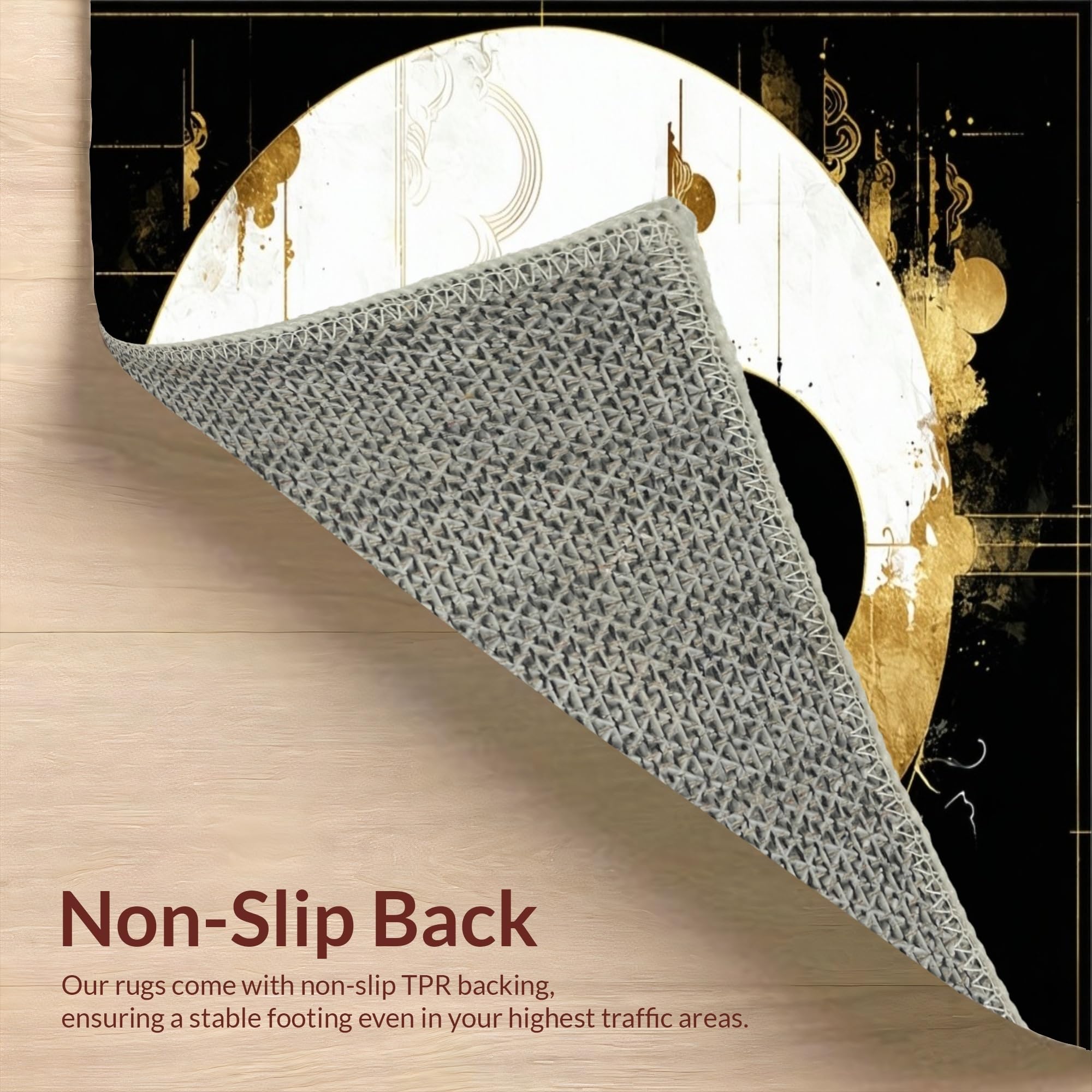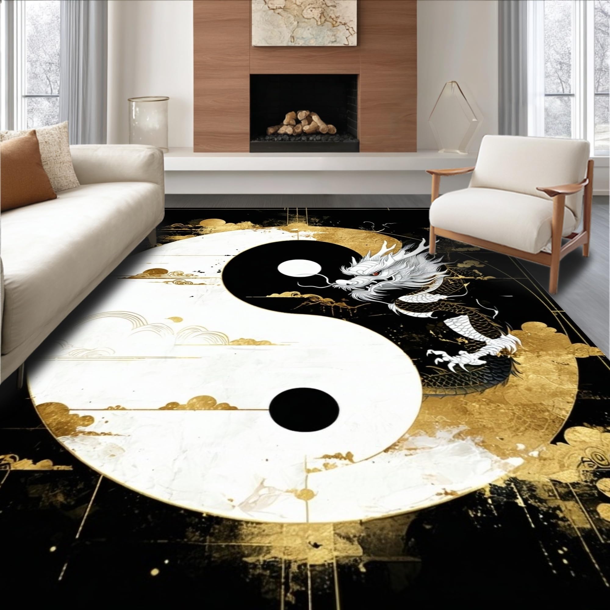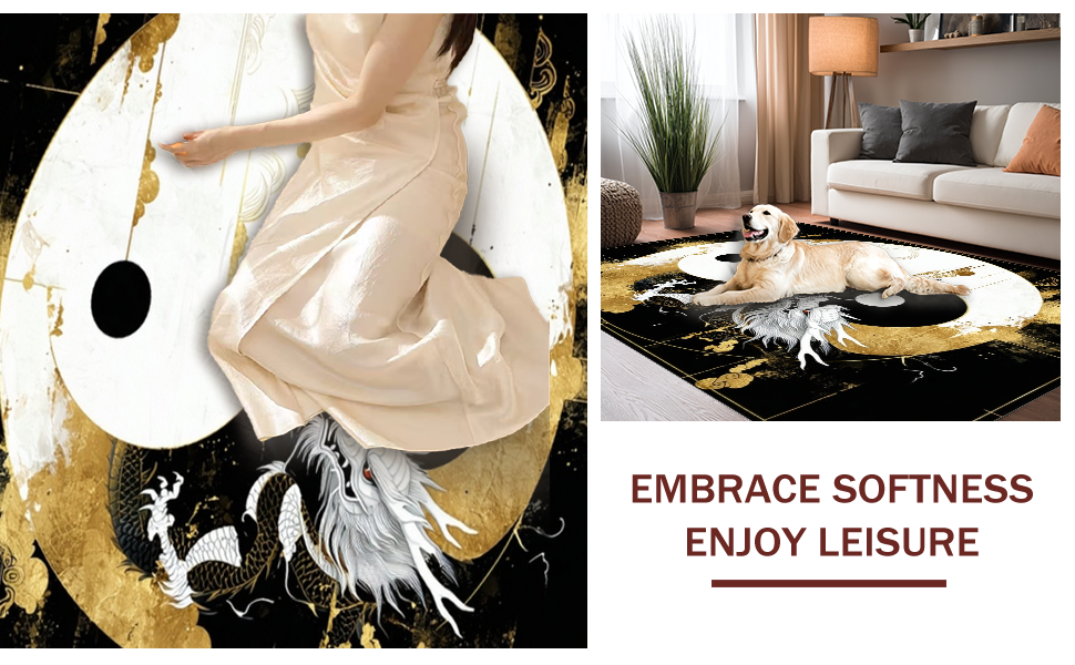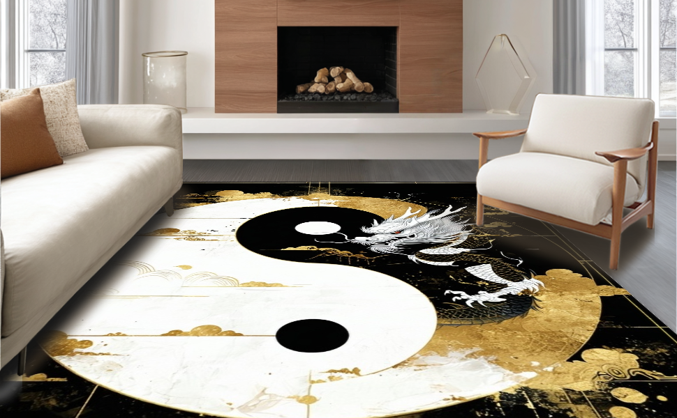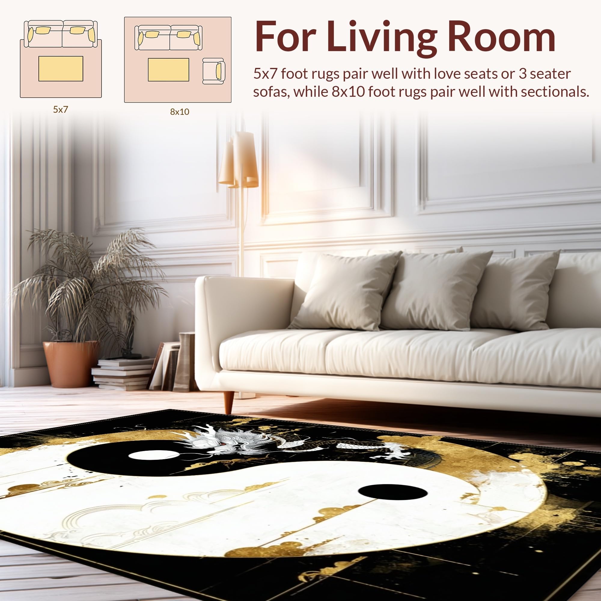 Ultra Soft Area Rug, Non Slip, Stain Resistant, Washable Area Rugs for Living Room, Bedroom, Opulent Gold Accented Dragon Imagery(Black) Overview: