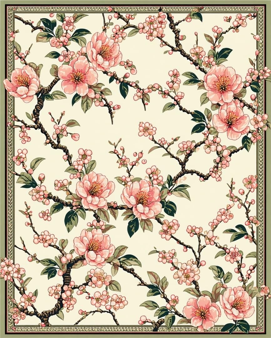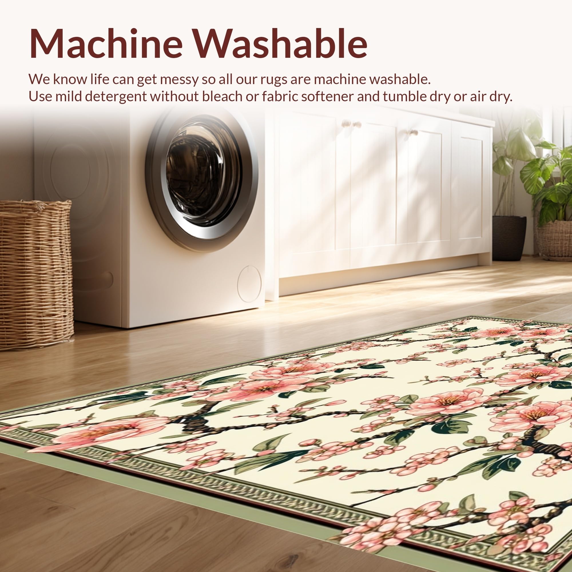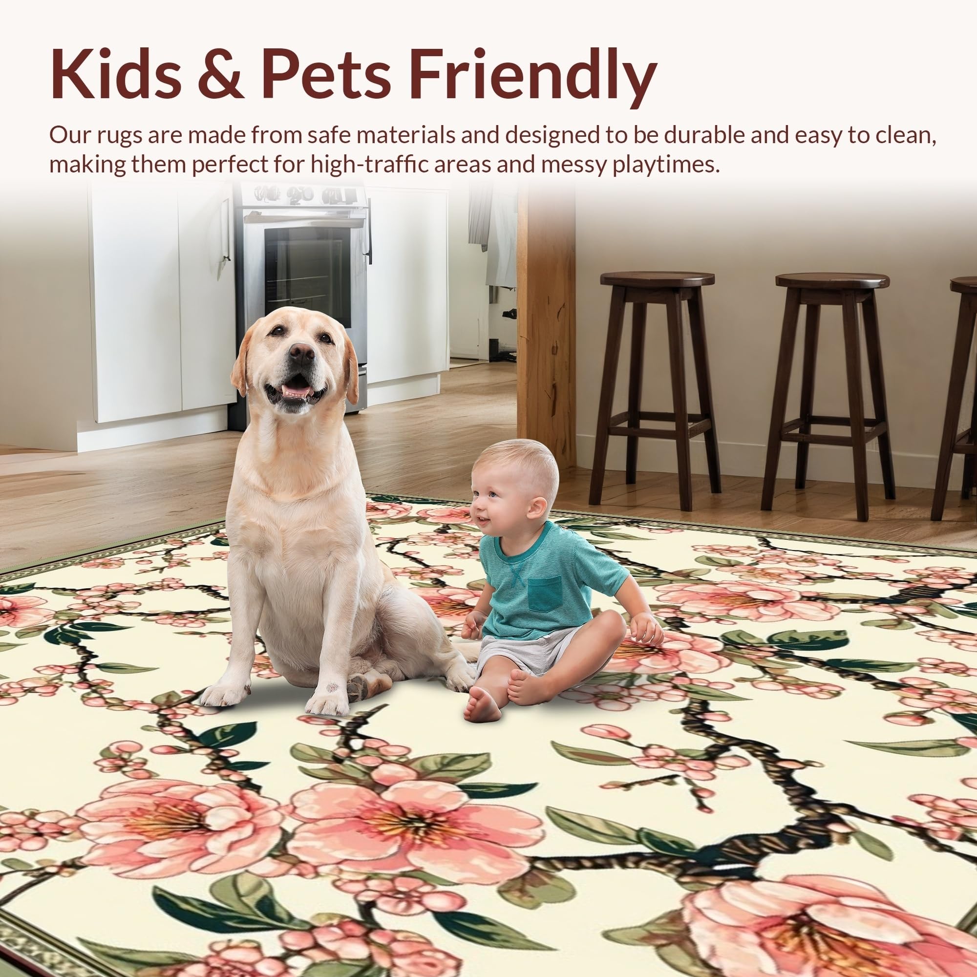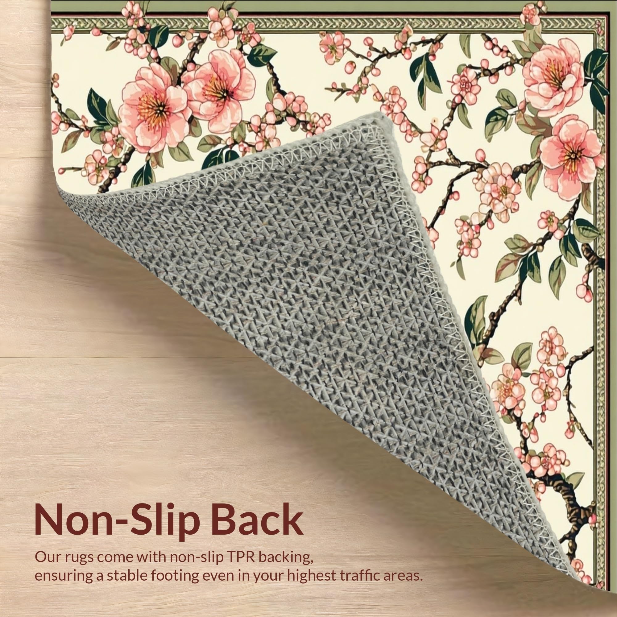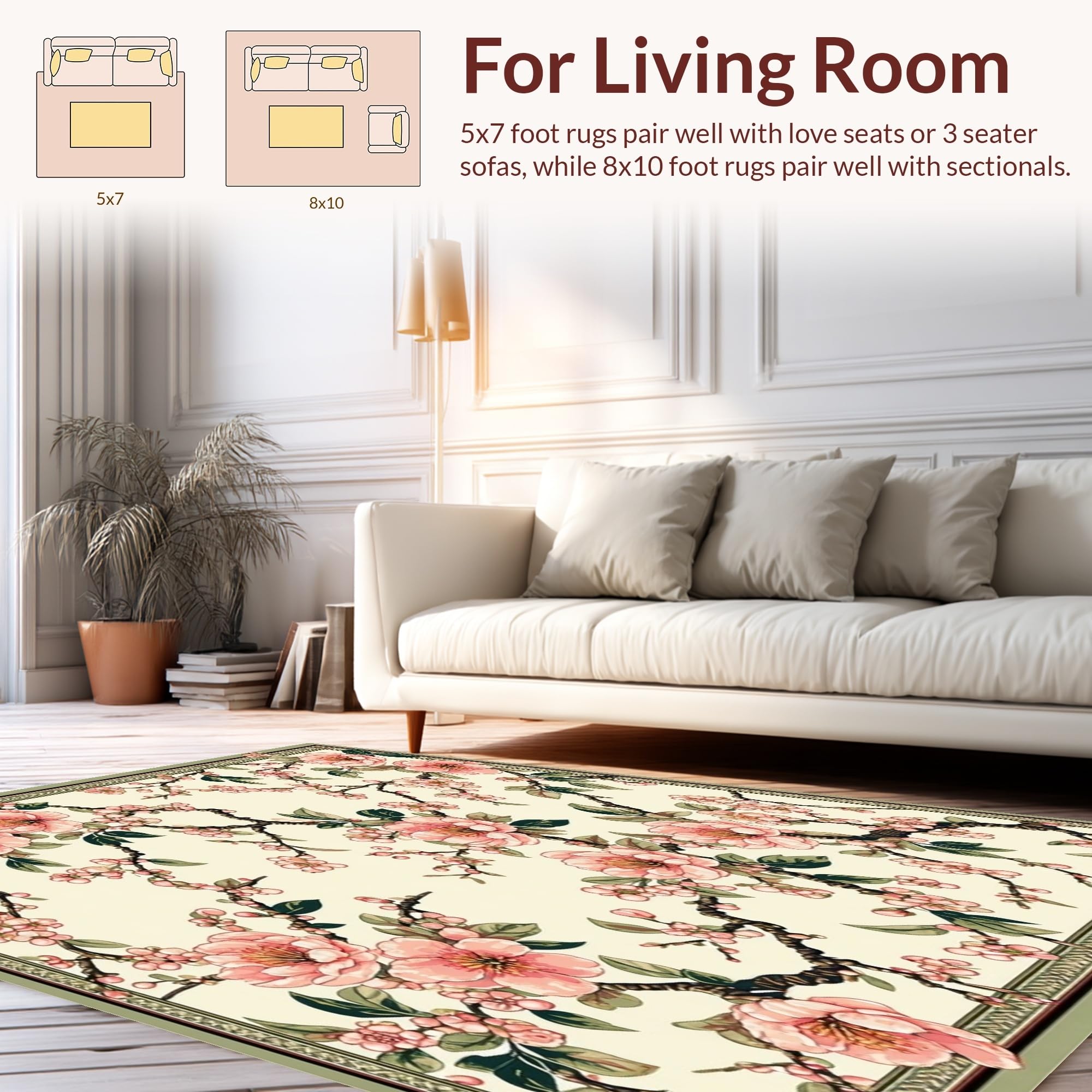 Ultra Soft Area Rug, Non Slip, Stain Resistant, Washable Area Rugs for Living Room, Bedroom, Pastel Boho Pink Cherry Blossoms Green Leafy Swirls(Ivory) Overview: