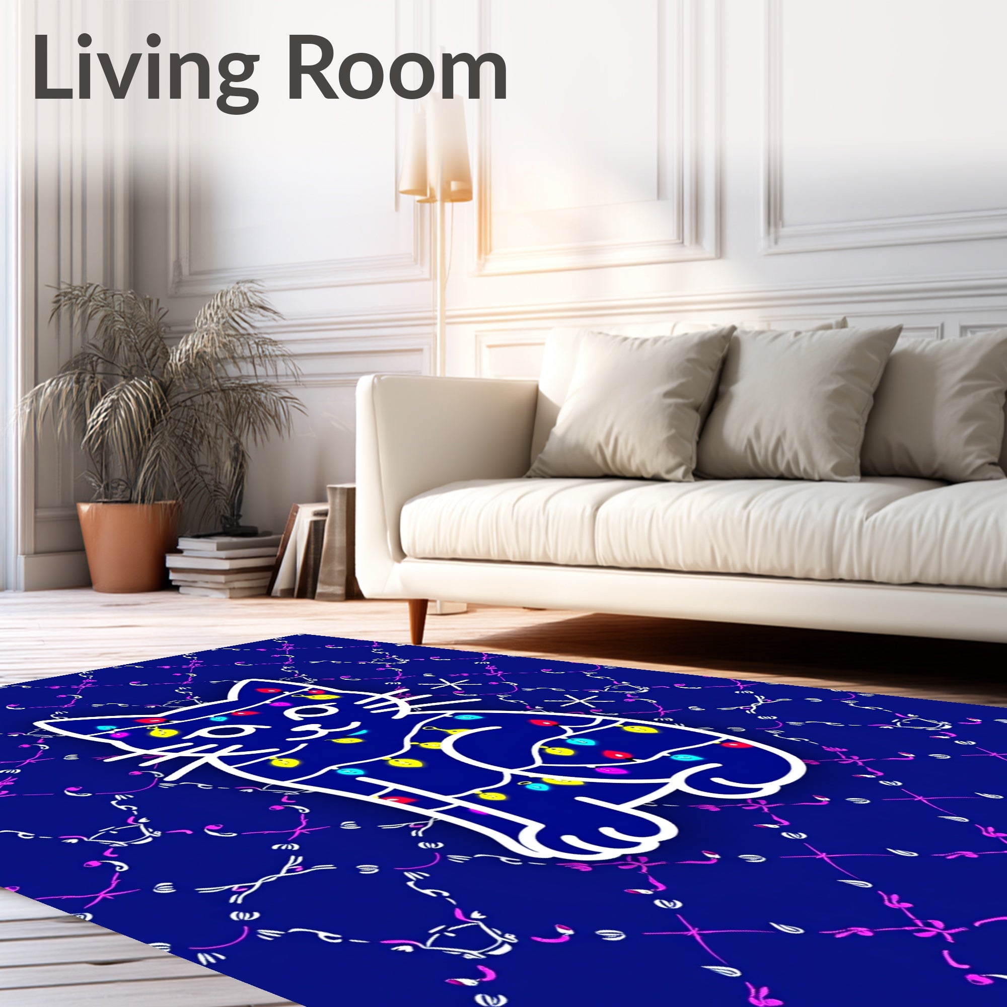 Ultra Soft Area Rug, Non Slip, Stain Resistant, Washable Area Rugs for Living Room, Bedroom, Playful Holiday Cat Trace with Sparkling Festive String Lights(Blue) Overview: