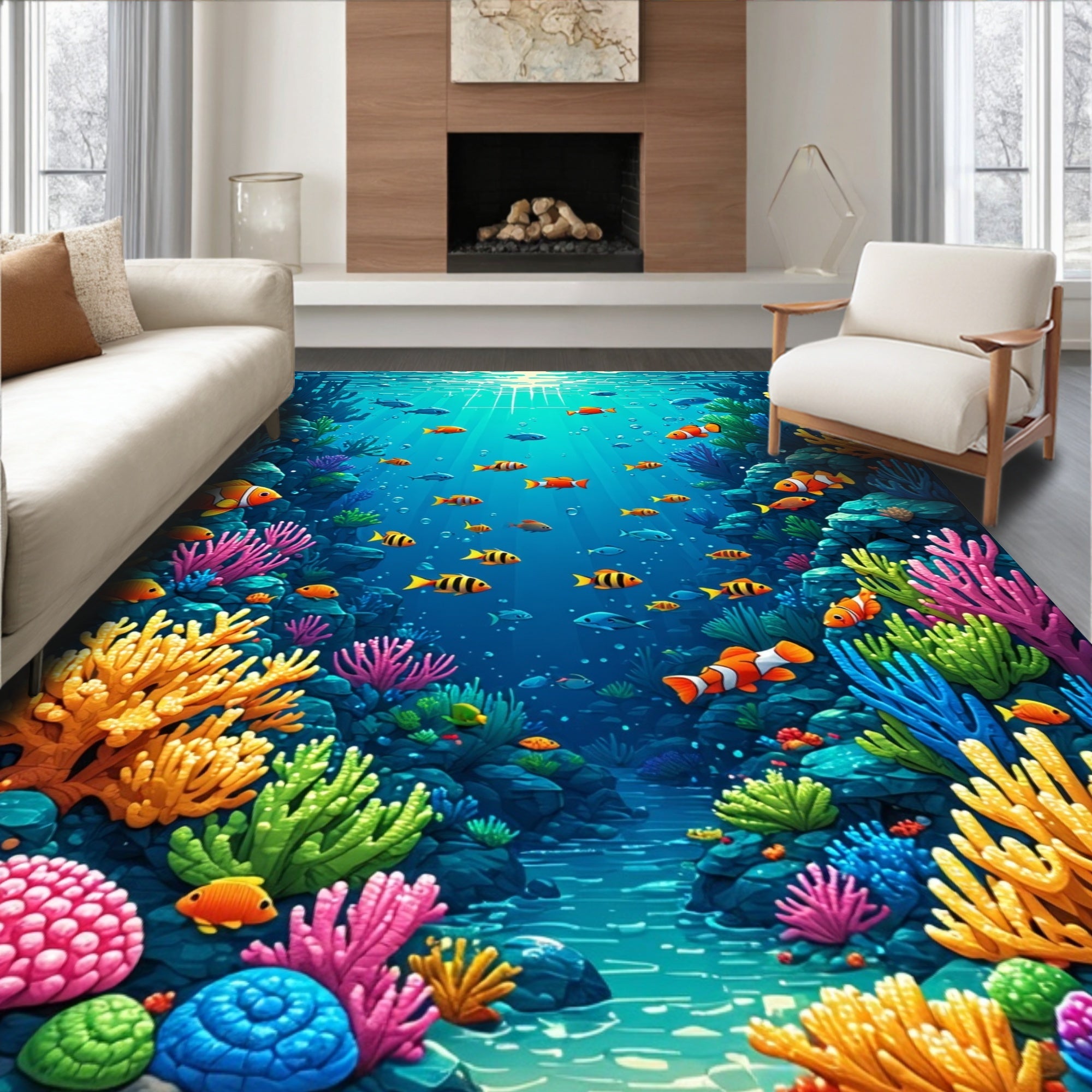Flatwoven High Traffic Area Rug, Playful Ocean Theme Kindergarten, Non Slip, Stain Resistant, Washable Area Rugs for Living Room, Bedroom (Blue) Overview: