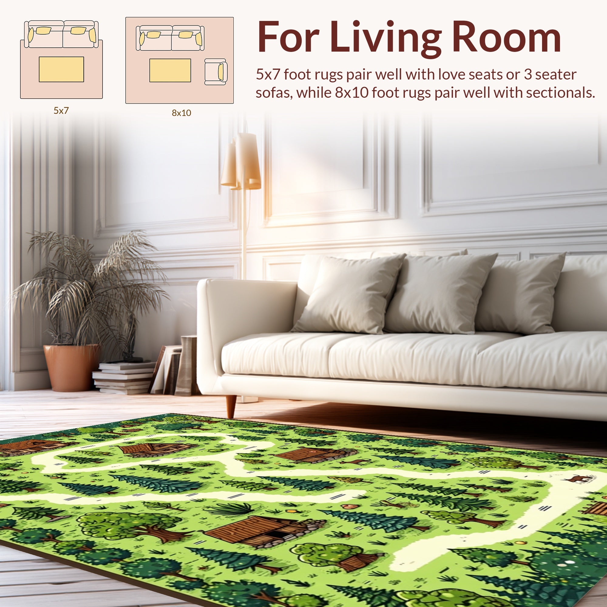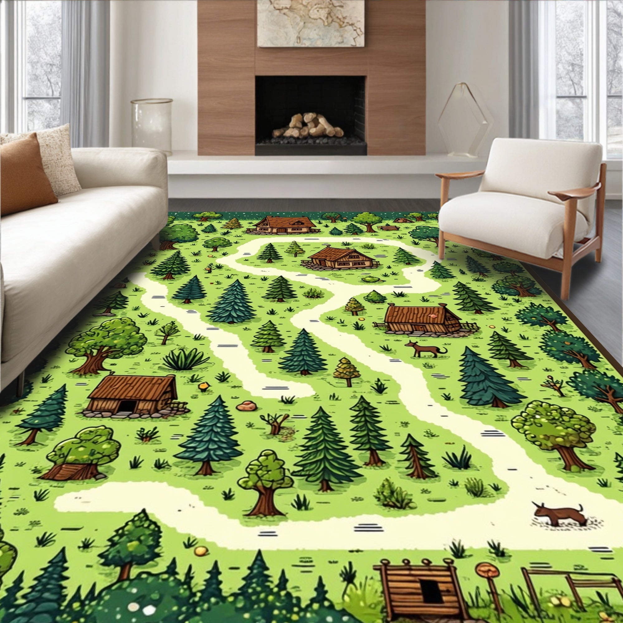 Flatwoven High Traffic Area Rug, Playful Retro Forest Map Design, Non Slip, Stain Resistant, Washable Area Rugs for Living Room, Bedroom (Green) Overview:
