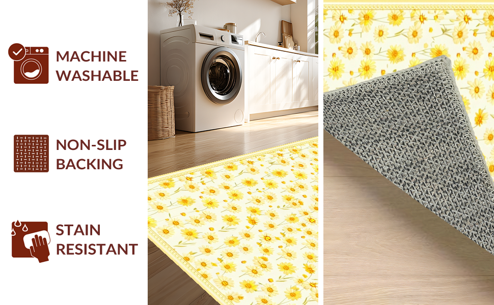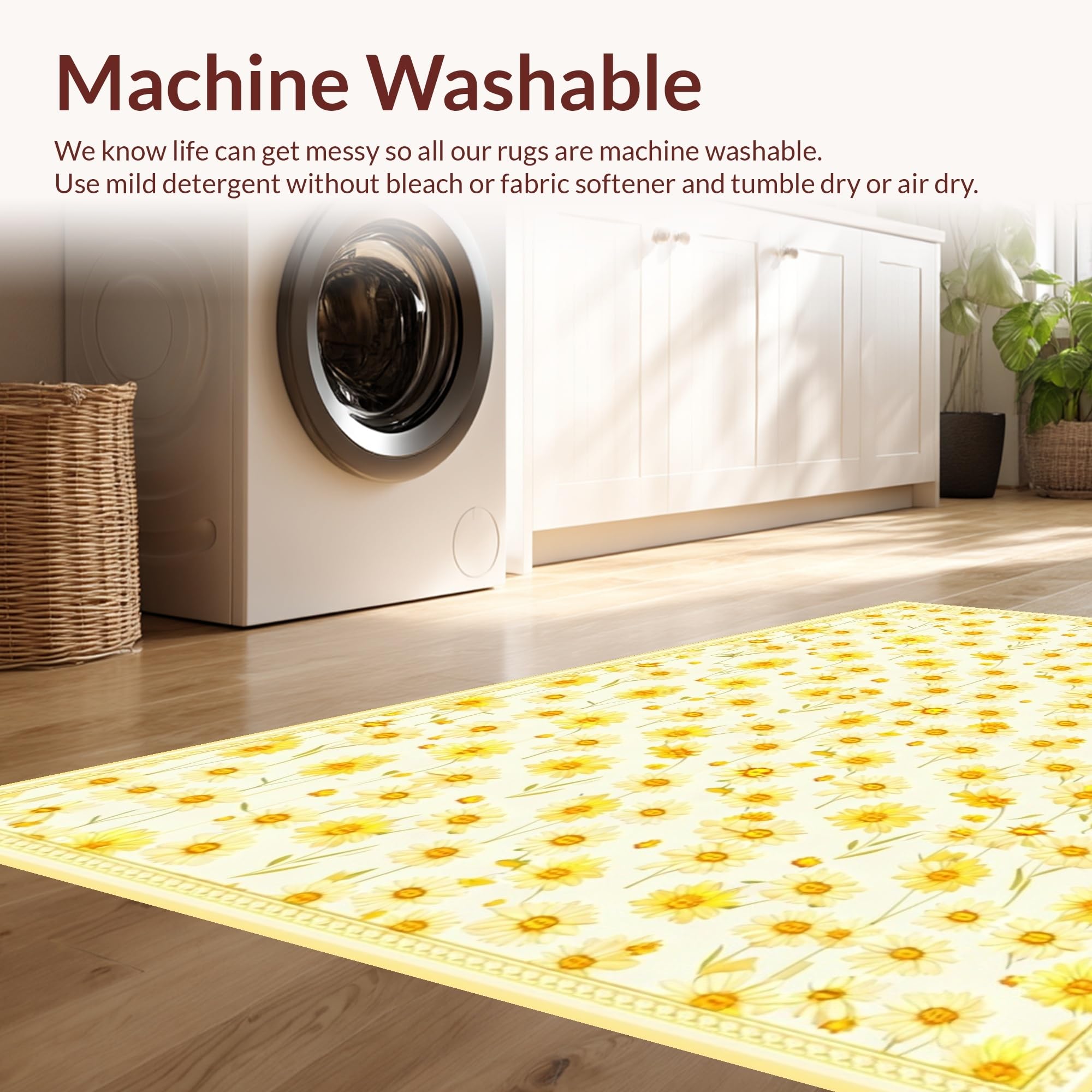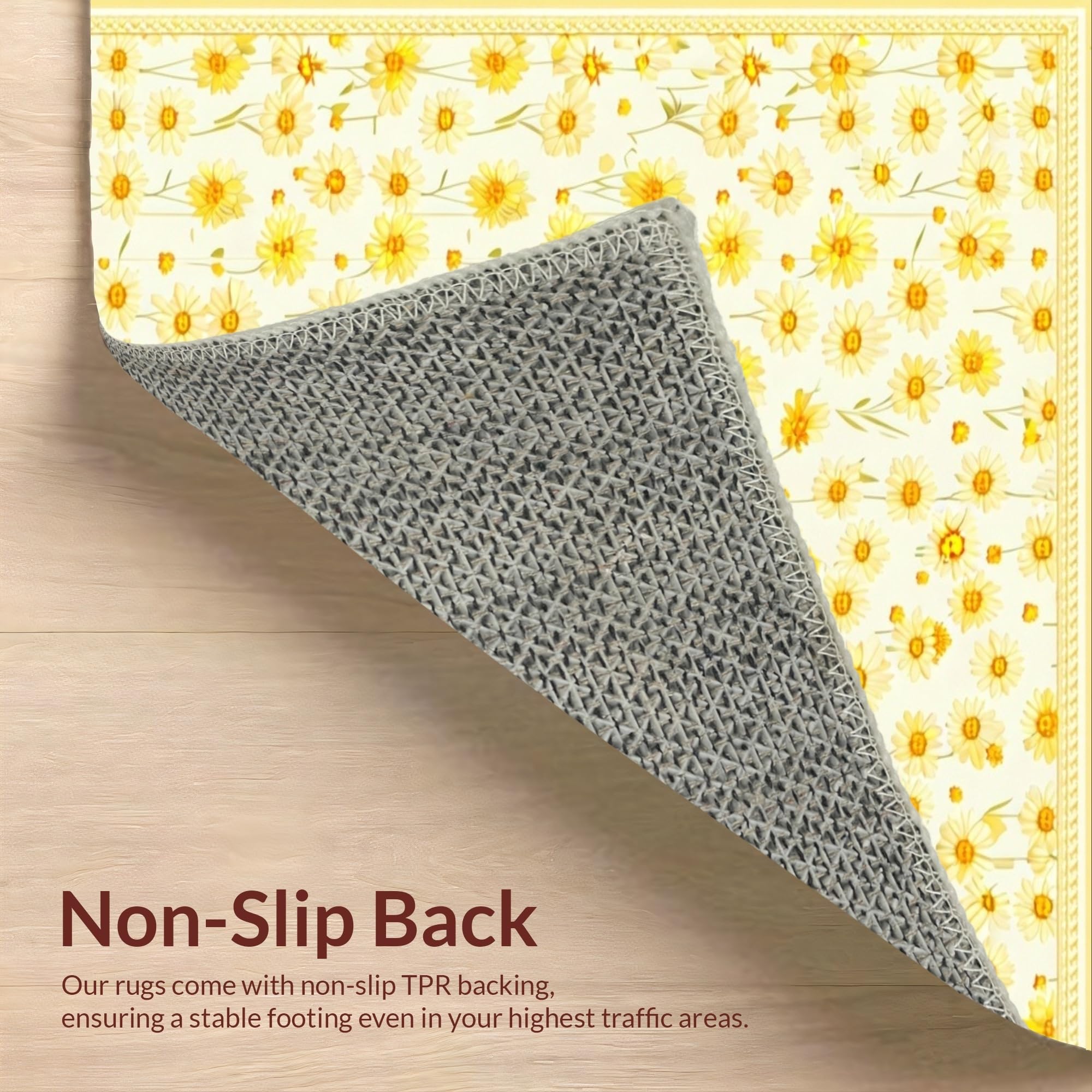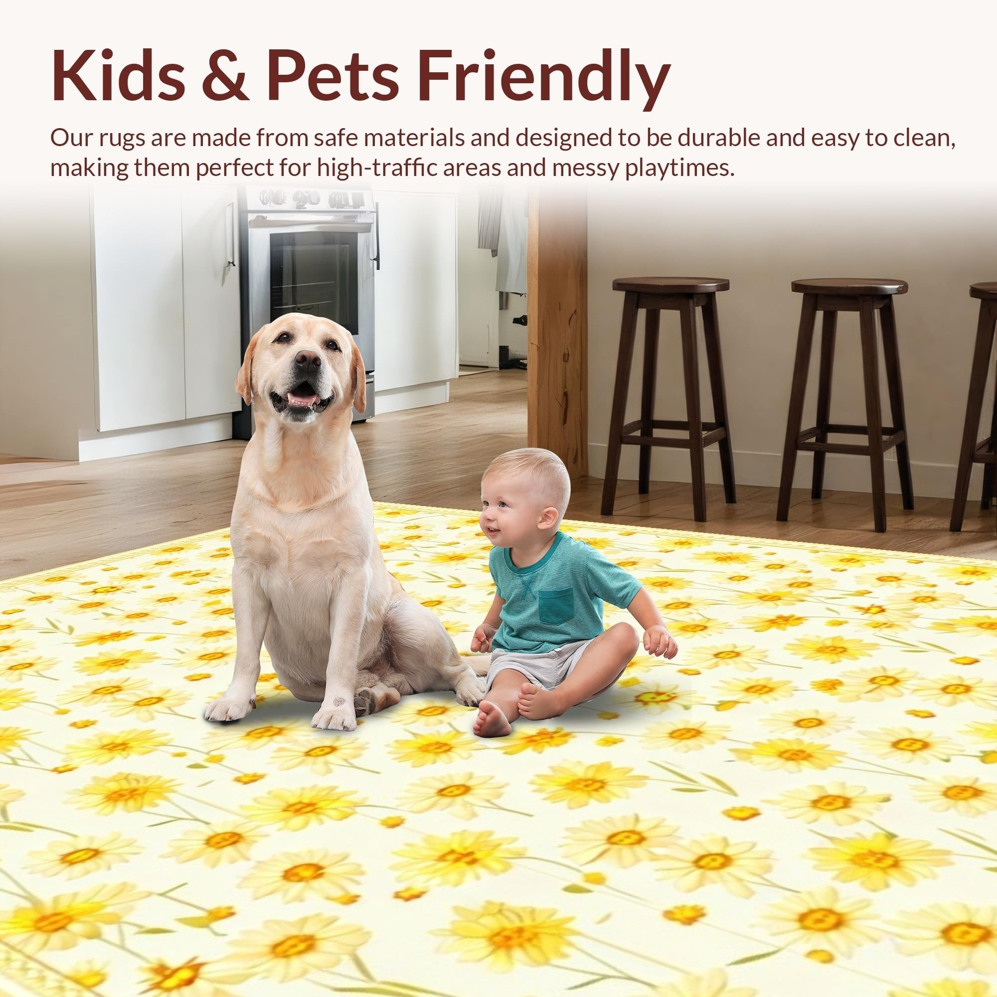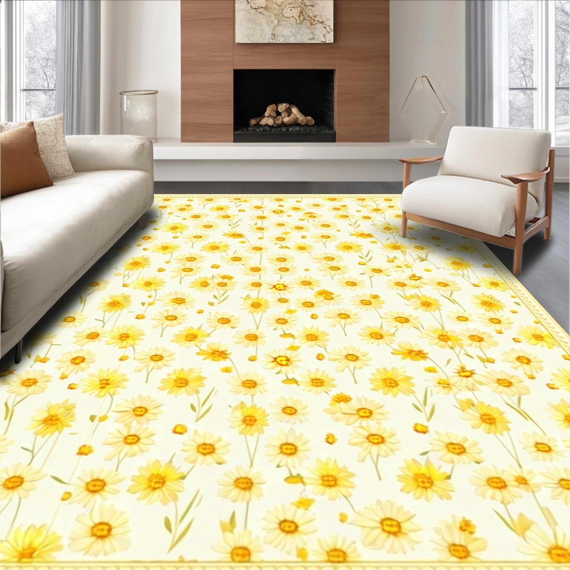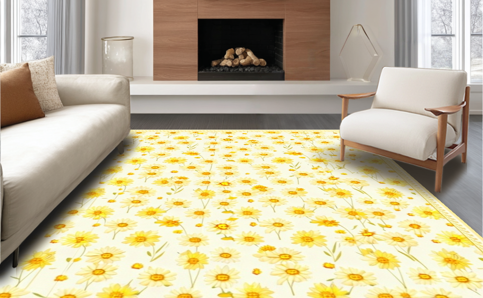 Ultra Soft Area Rug, Non Slip, Stain Resistant, Washable Area Rugs for Living Room, Bedroom, Playful White Yellow Flower Motif(Beige) Overview: