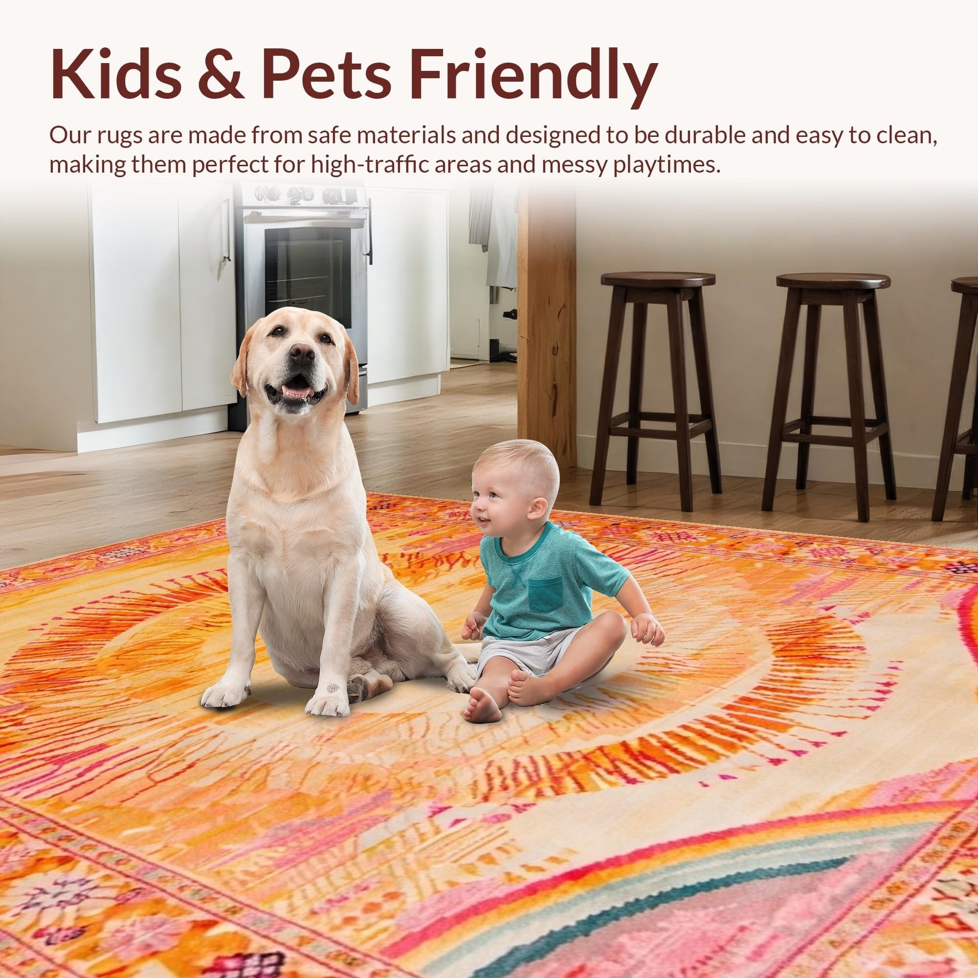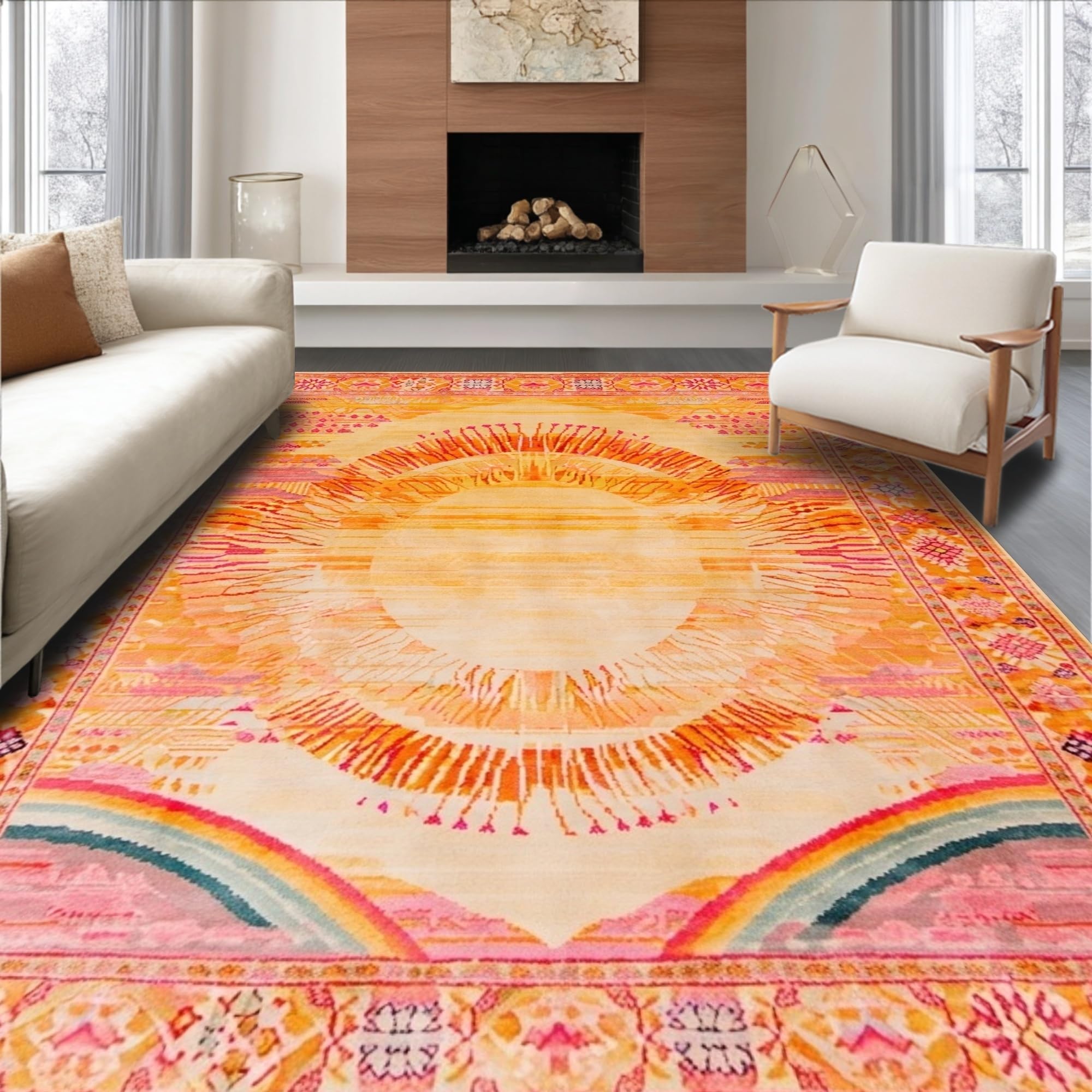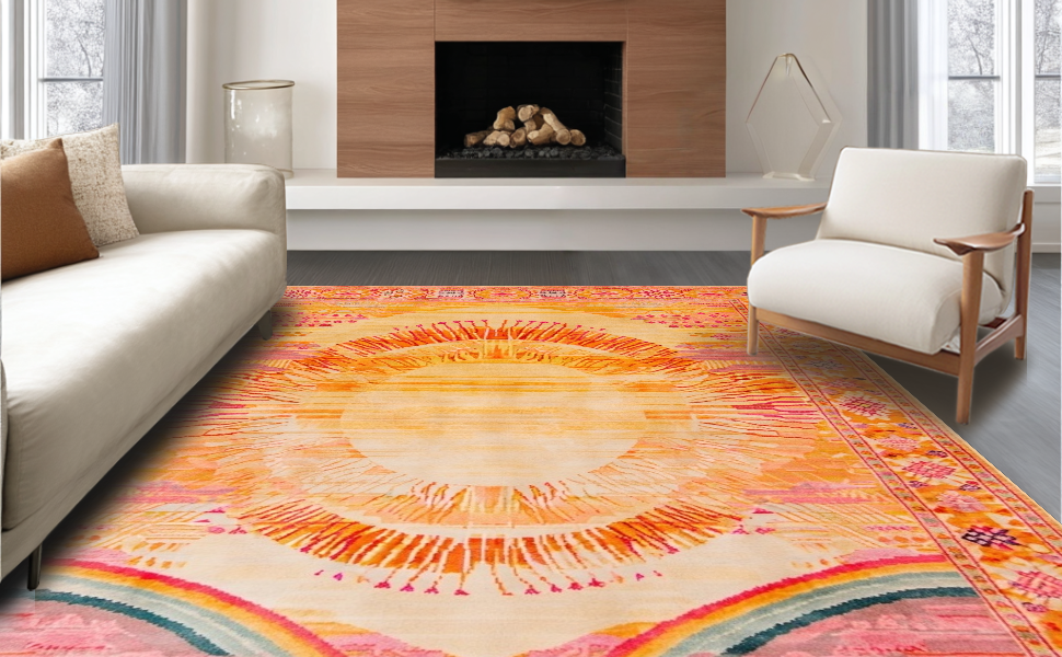 Ultra Soft Area Rug, Non Slip, Stain Resistant, Washable Area Rugs for Living Room, Bedroom, Radiant Sunburst Circular Aesthetic(Gold) Overview: