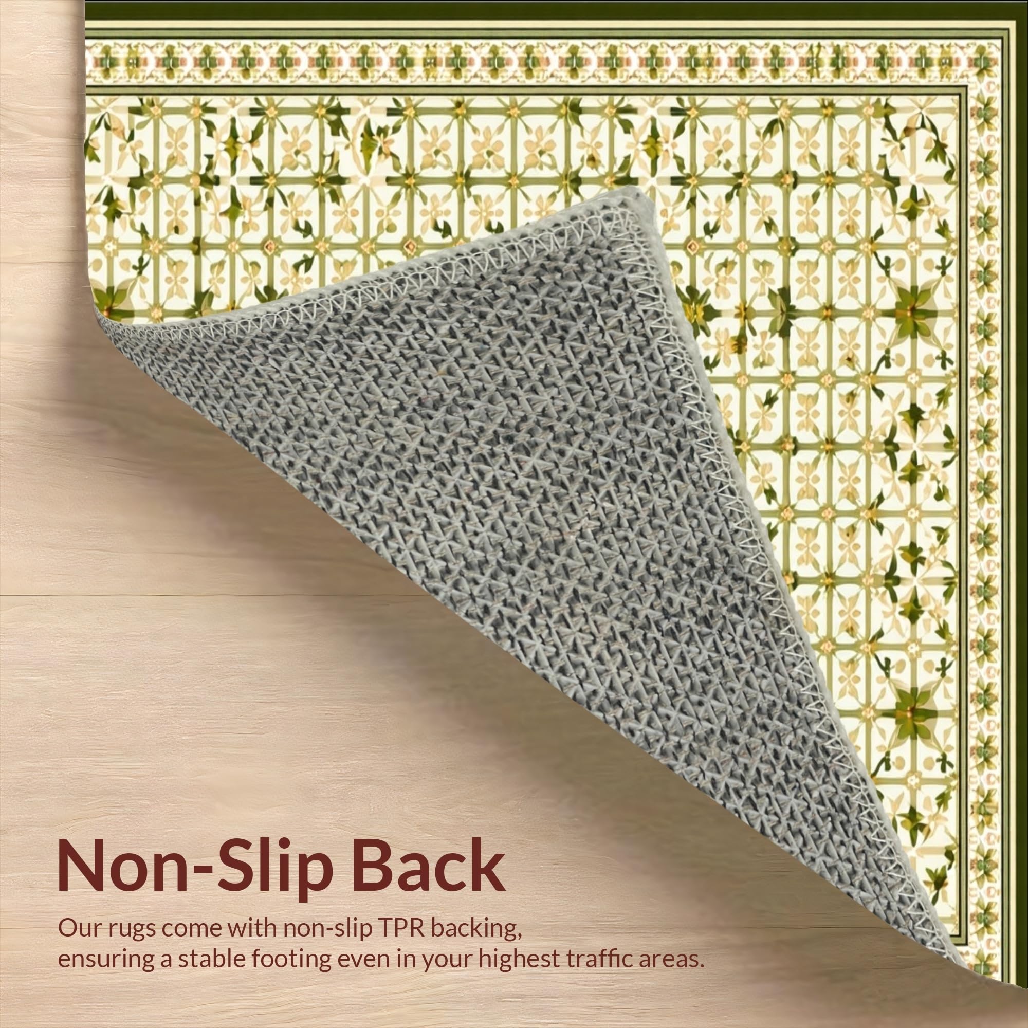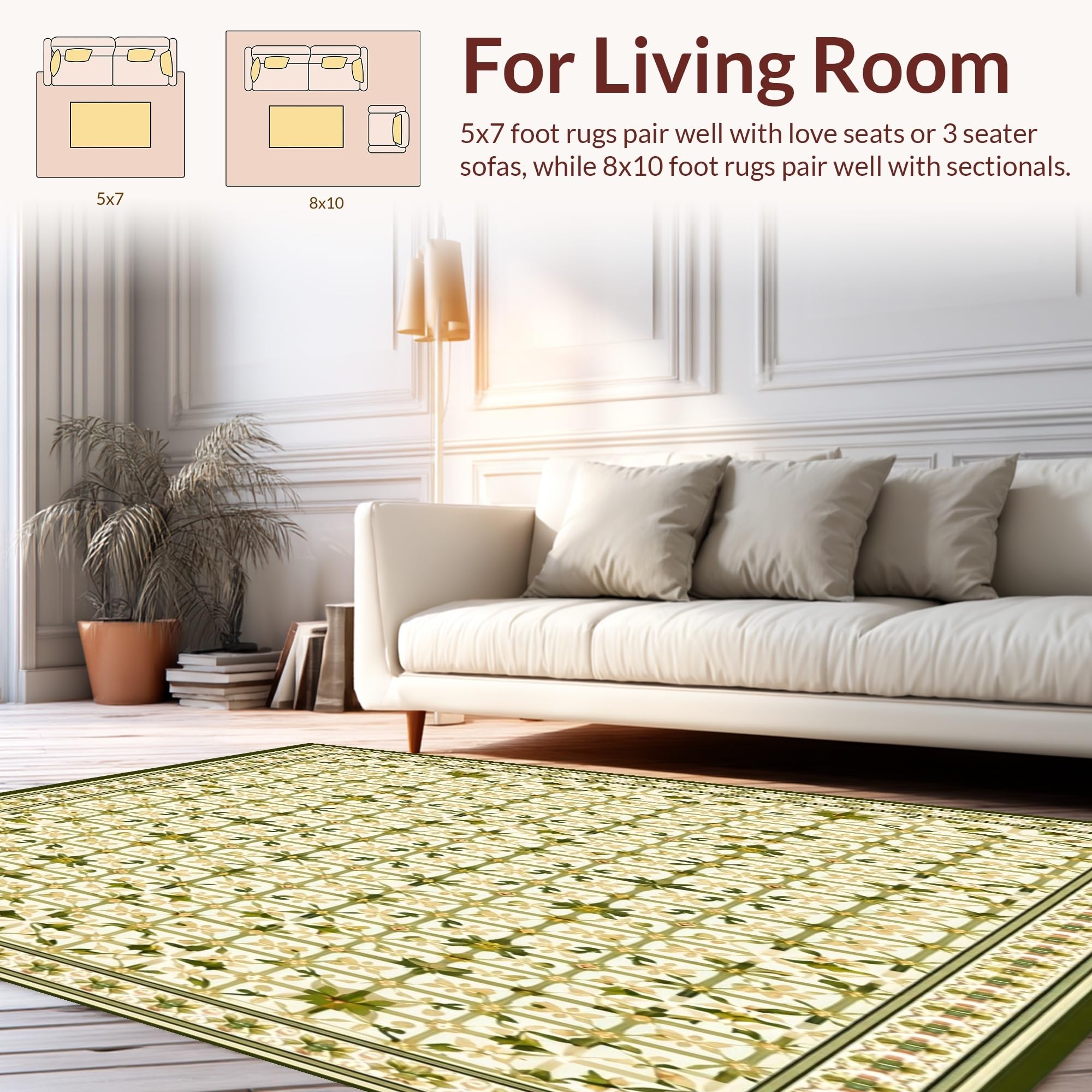 Ultra Soft Area Rug, Non Slip, Stain Resistant, Washable Area Rugs for Living Room, Bedroom, Refined Olive Wool Runner with Intricate Lattice and Floral Embellishments(Beige) Overview: