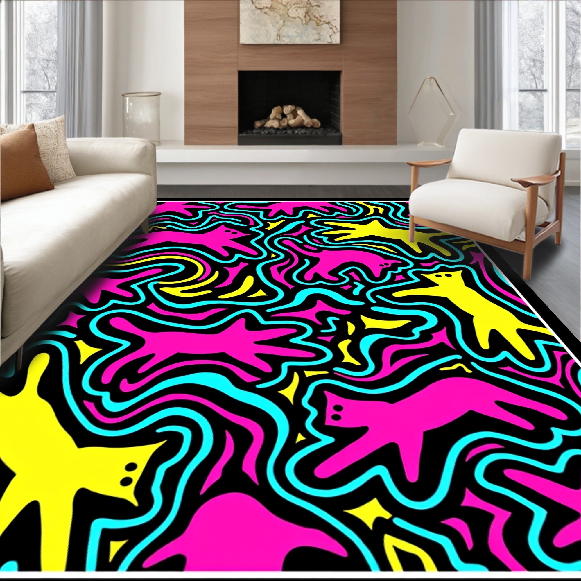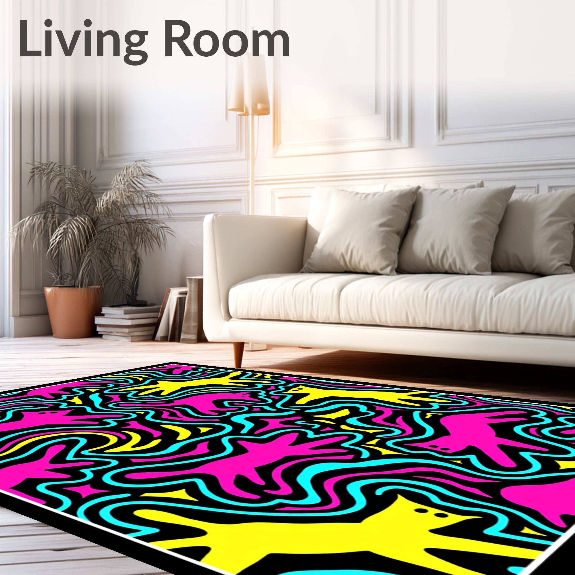 Ultra Soft Area Rug, Non Slip, Stain Resistant, Washable Area Rugs for Living Room, Bedroom, Retro Pop Art Cat Carnival Vibrant Feline Silhouettes with Festive Light Trails(Pink) Overview: