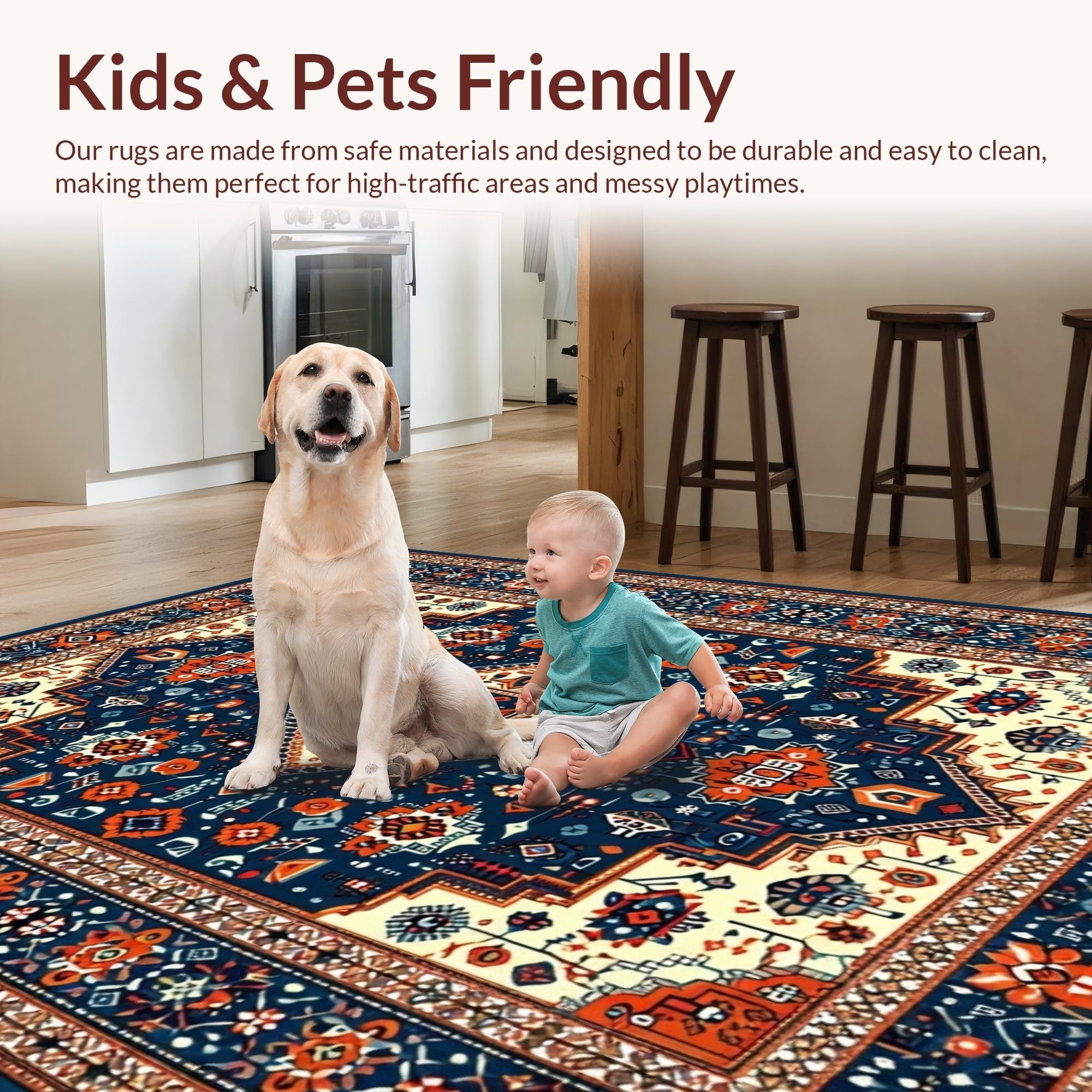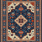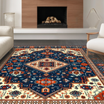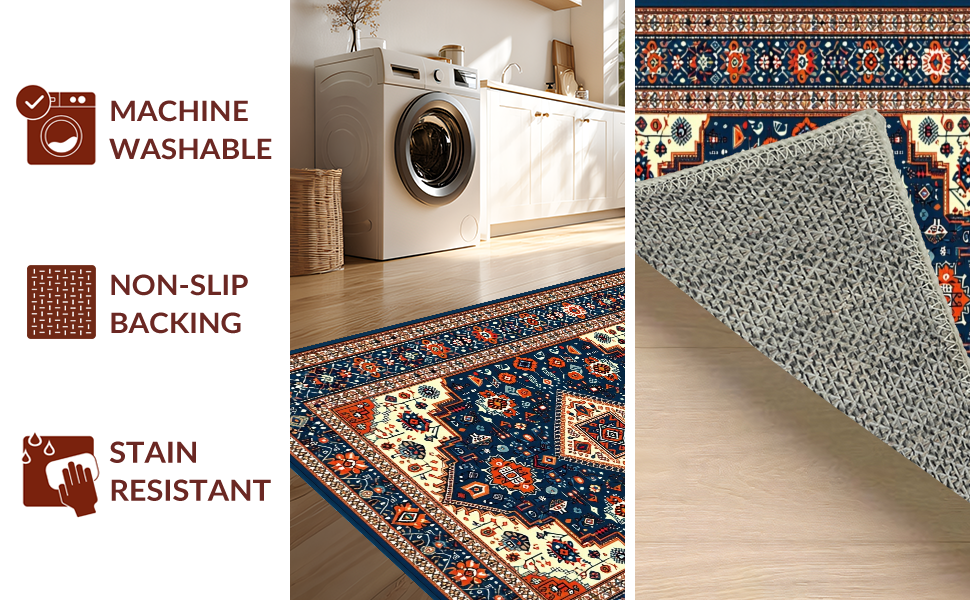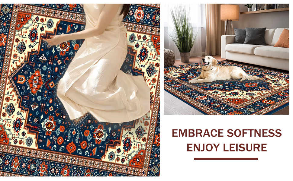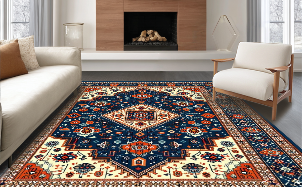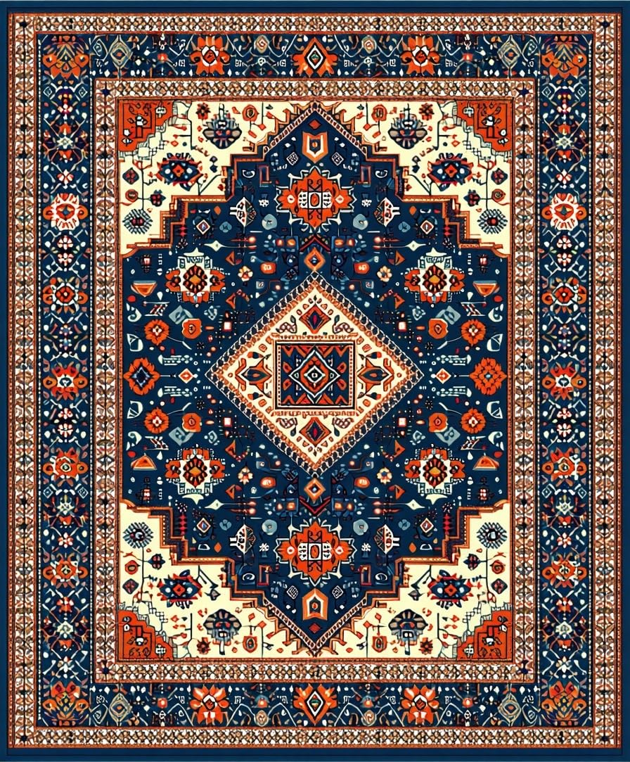 Ultra Soft Area Rug, Non Slip, Stain Resistant, Washable Area Rugs for Living Room, Bedroom, Rustic Blue Orange Medallion Style(Blue) Overview: