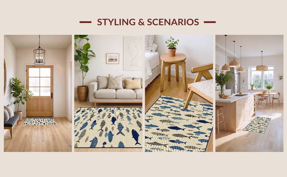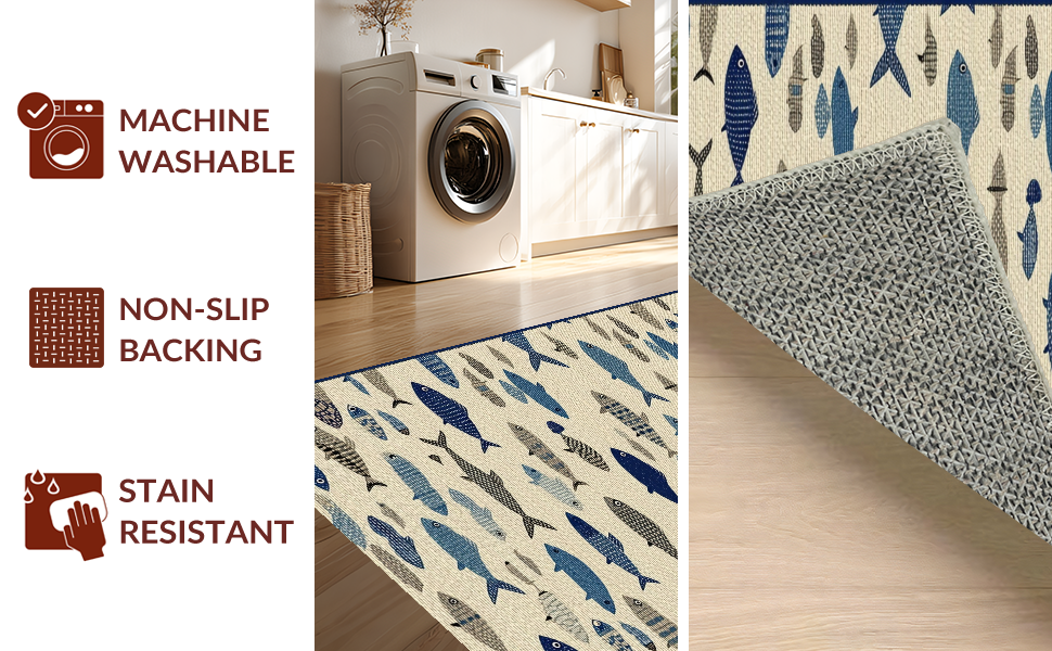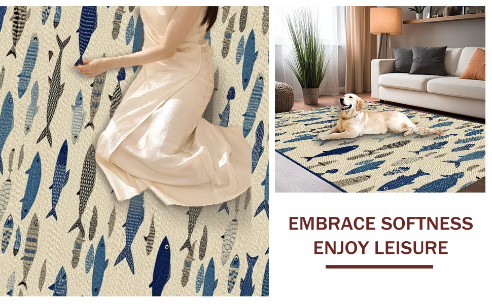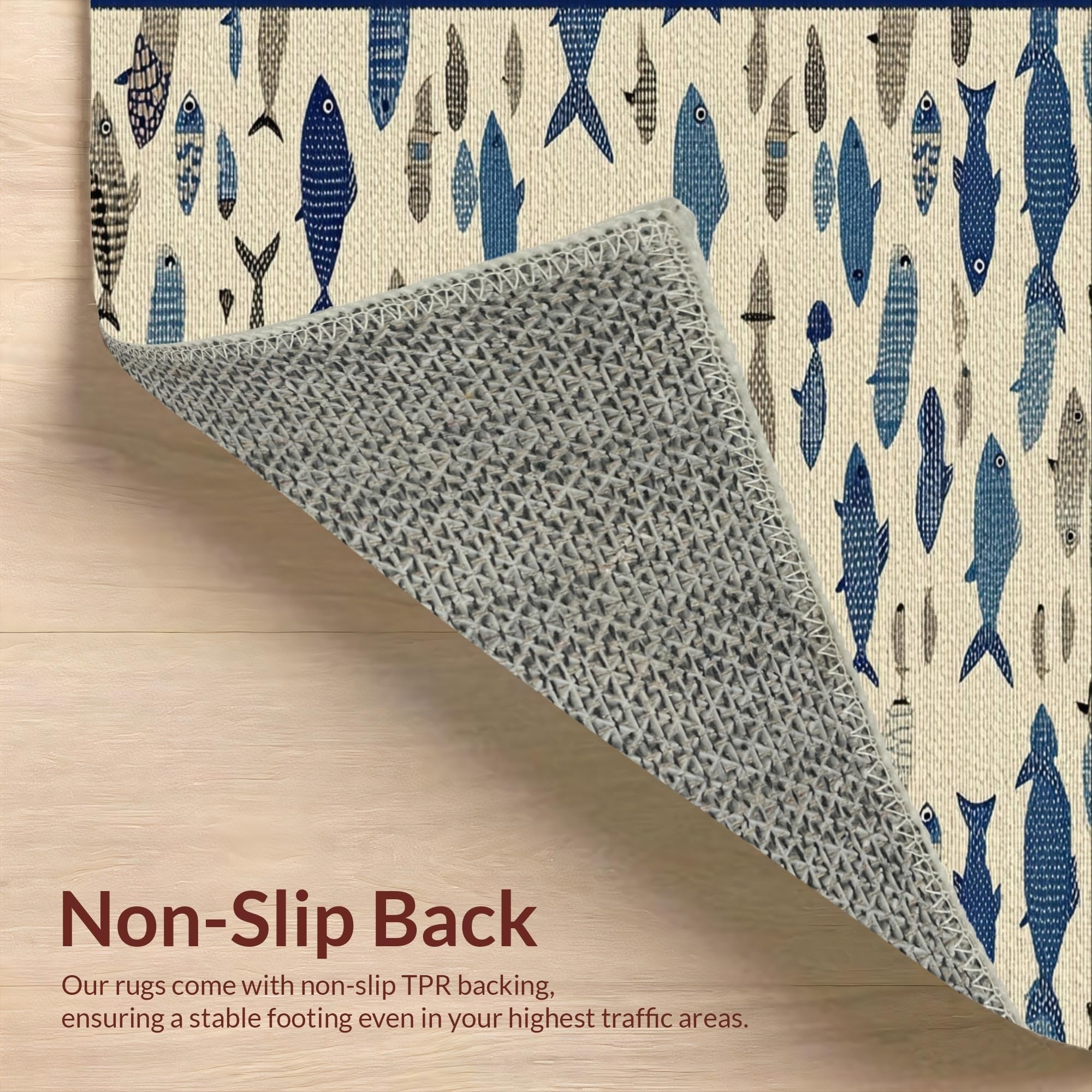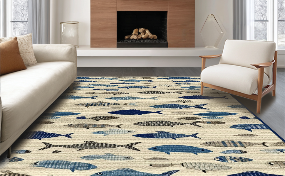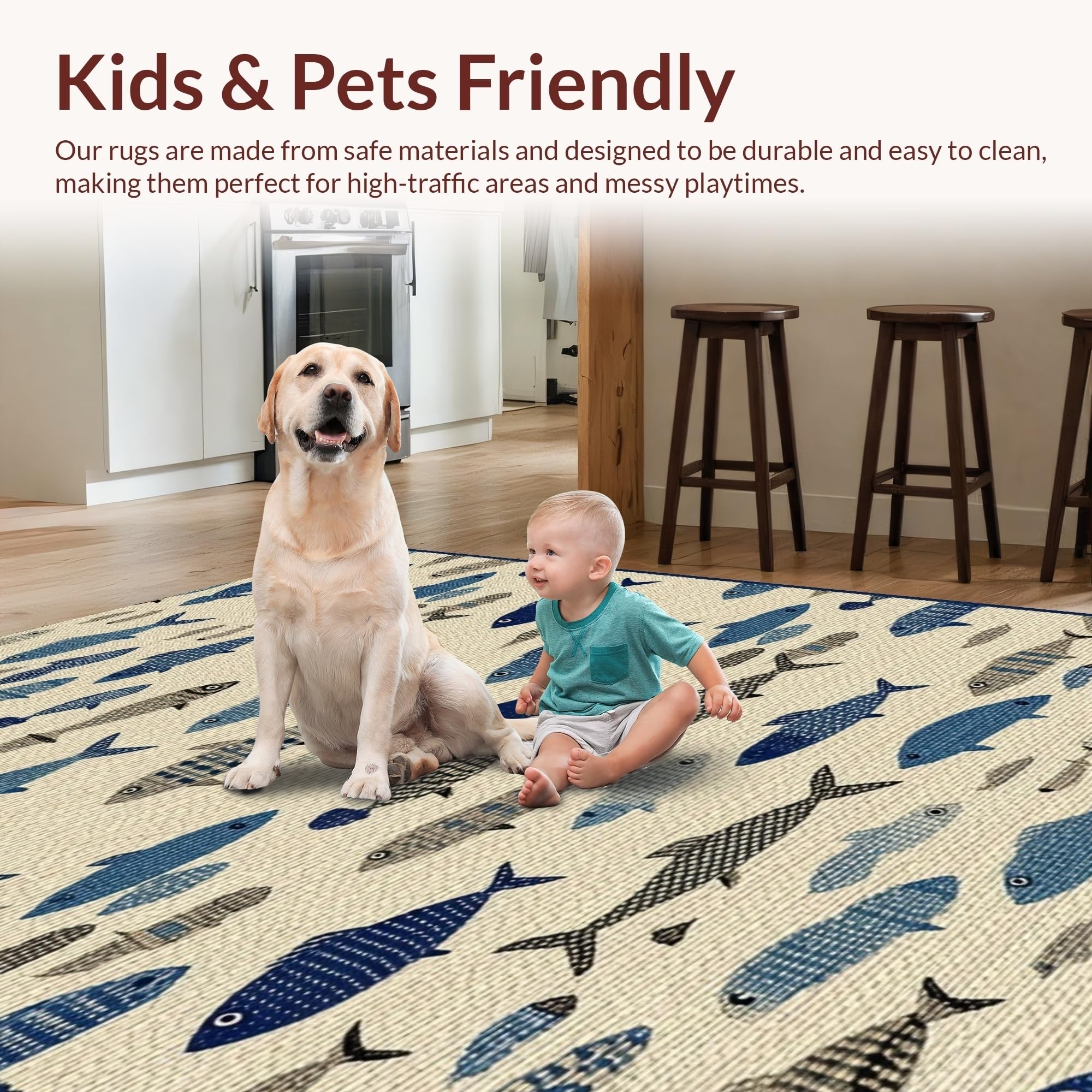 Ultra Soft Area Rug, Non Slip, Stain Resistant, Washable Area Rugs for Living Room, Bedroom, Rustic Earthy Fish Imagery(Beige) Overview: