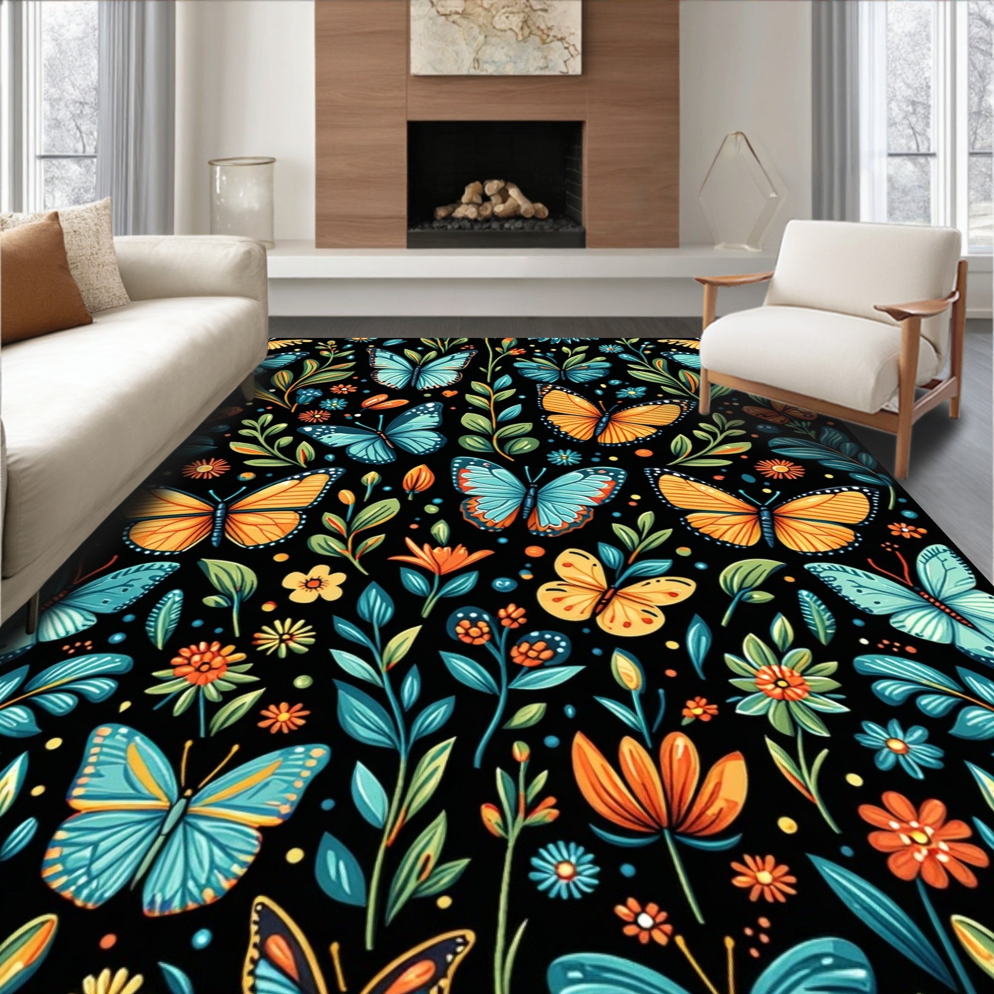 Flatwoven High Traffic Area Rug, Rustic Garden Vibe with Butterflies, Non Slip, Stain Resistant, Washable Area Rugs for Living Room, Bedroom (Blue) Overview: