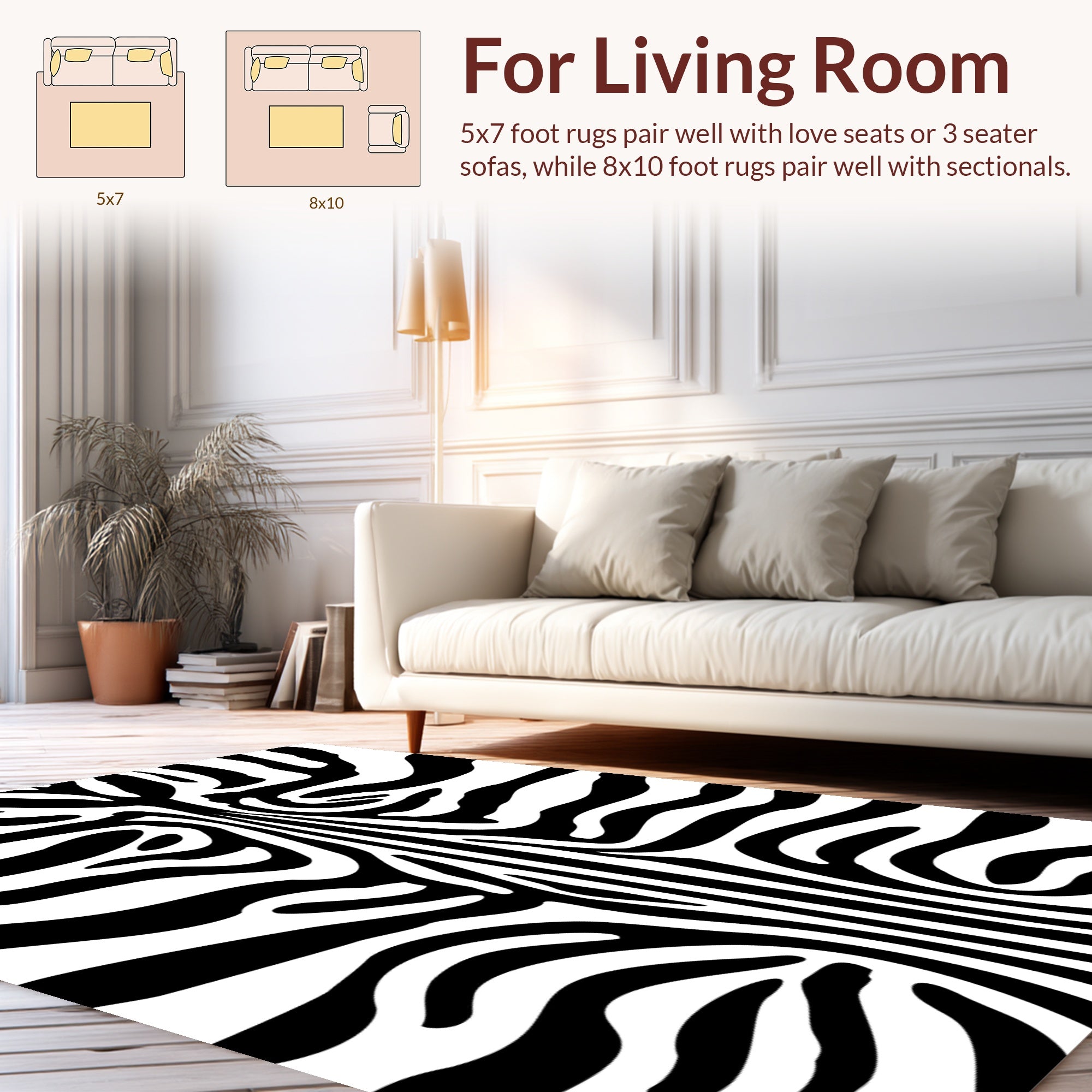 Flatwoven High Traffic Area Rug, Safari Zebra Print Faux Suede Area, Non Slip, Stain Resistant, Washable Area Rugs for Living Room, Bedroom (Black) Overview: