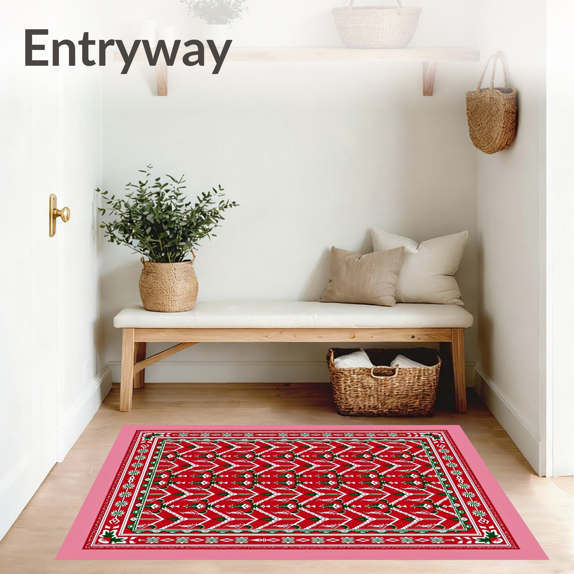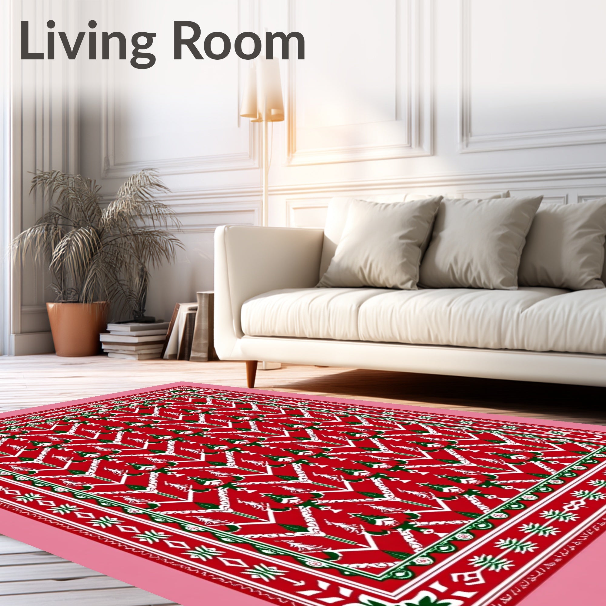 Ultra Soft Area Rug, Non Slip, Stain Resistant, Washable Area Rugs for Living Room, Bedroom, Scandinavian Fir Tree Interlocking Chevron Holiday Design(Red) Overview: