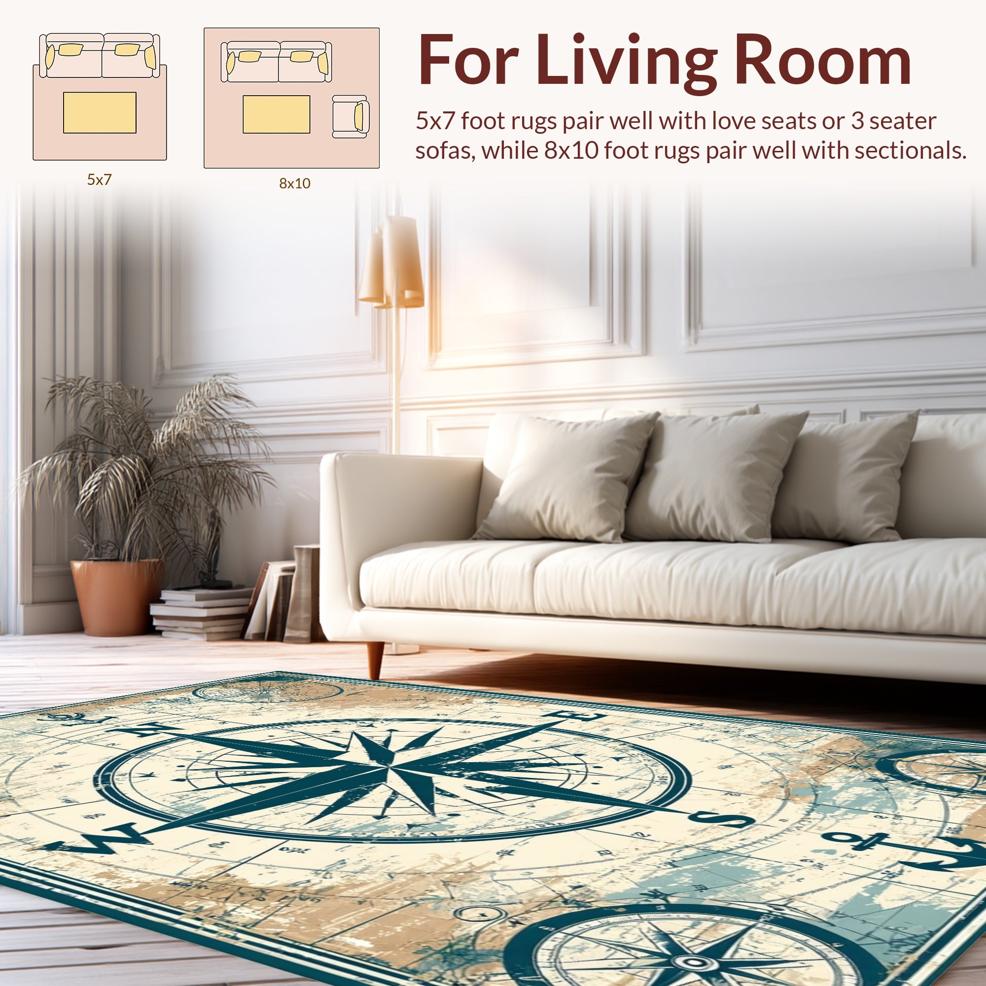 Flatwoven High Traffic Area Rug, Seaside Retreat Runner With Vintage Mariner Compass Design, Non Slip, Stain Resistant, Washable Area Rugs for Living Room, Bedroom (Blue) Overview: