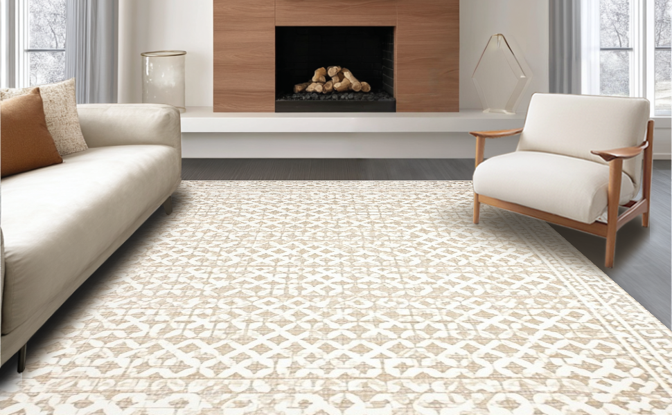 Ultra Soft Area Rug, Non Slip, Stain Resistant, Washable Area Rugs for Living Room, Bedroom, Sleek Minimalist Lattice Design(Beige) Overview: