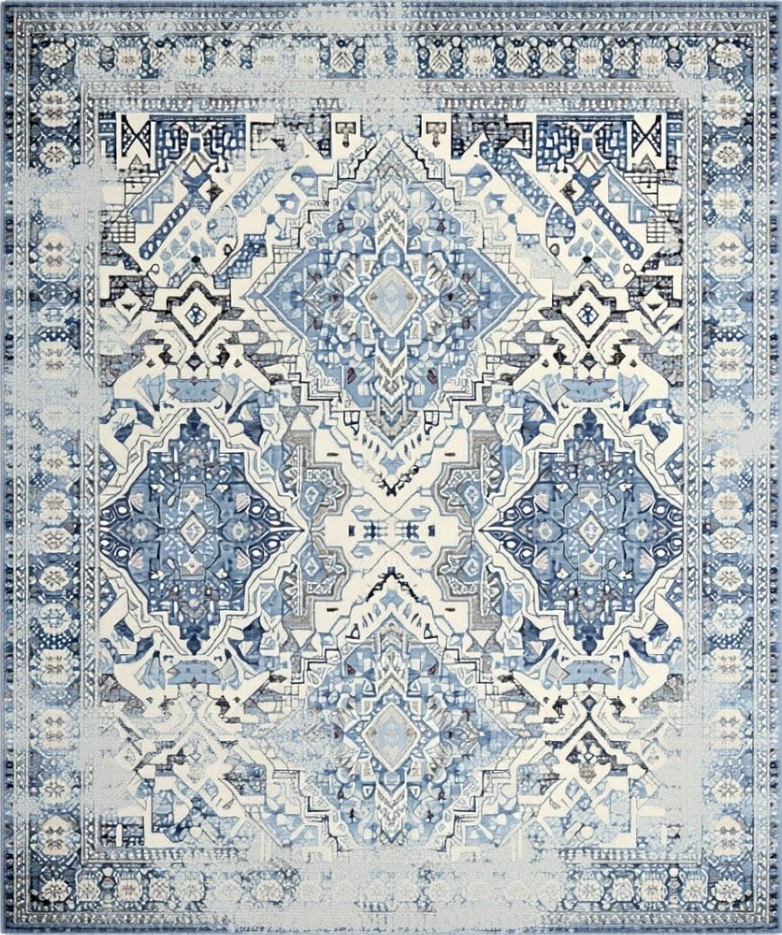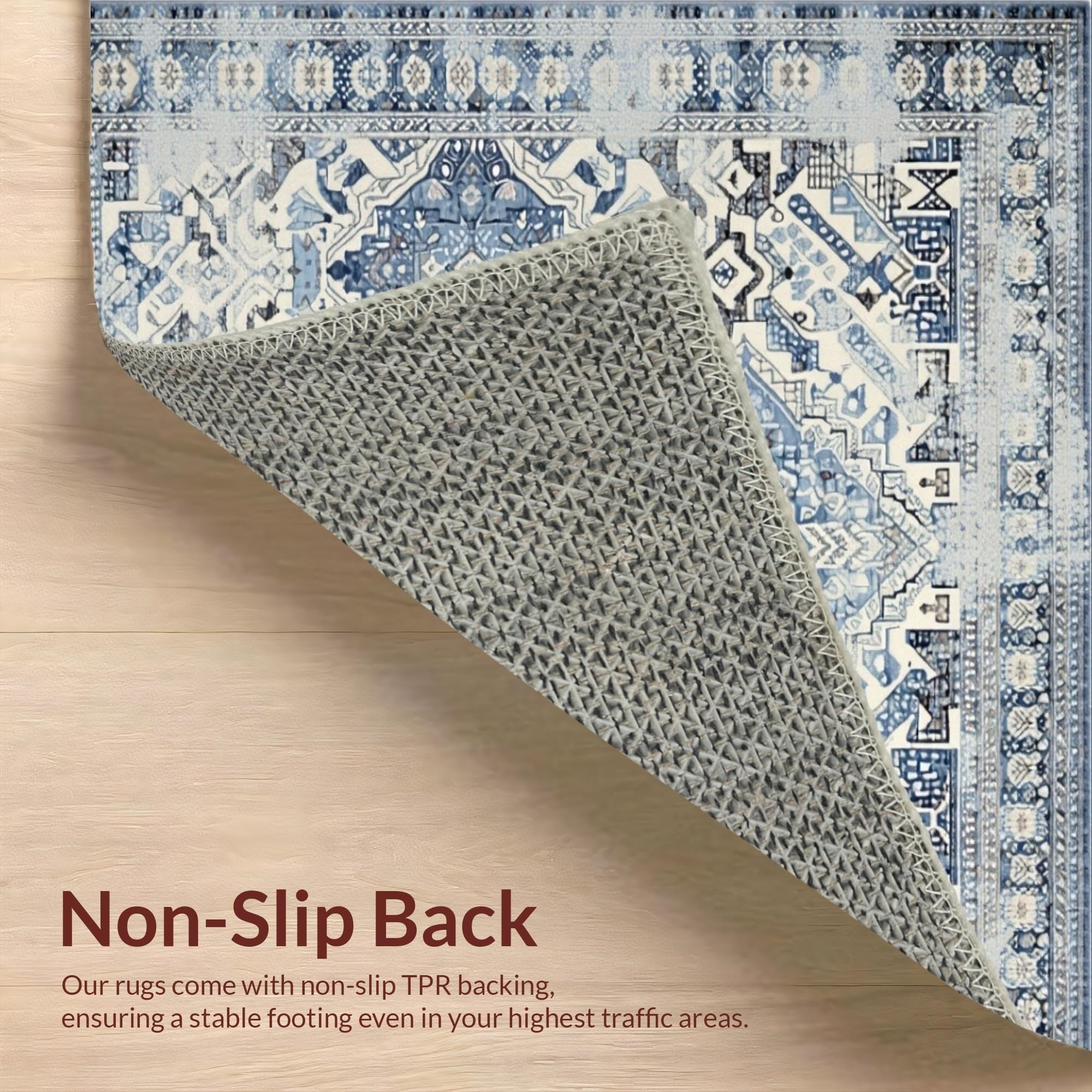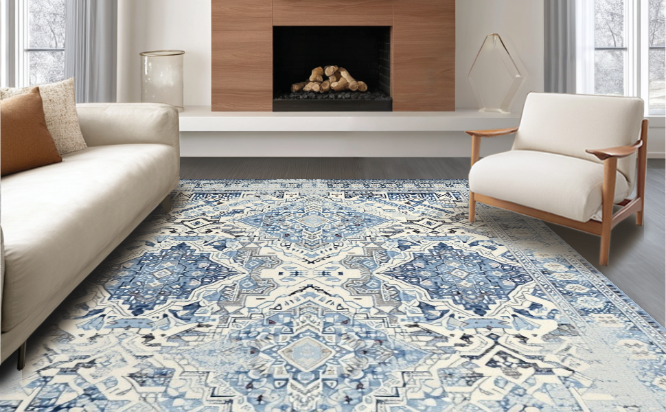 Ultra Soft Area Rug, Non Slip, Stain Resistant, Washable Area Rugs for Living Room, Bedroom, Soft Ivory Distressed Medallion(Blue) Overview: