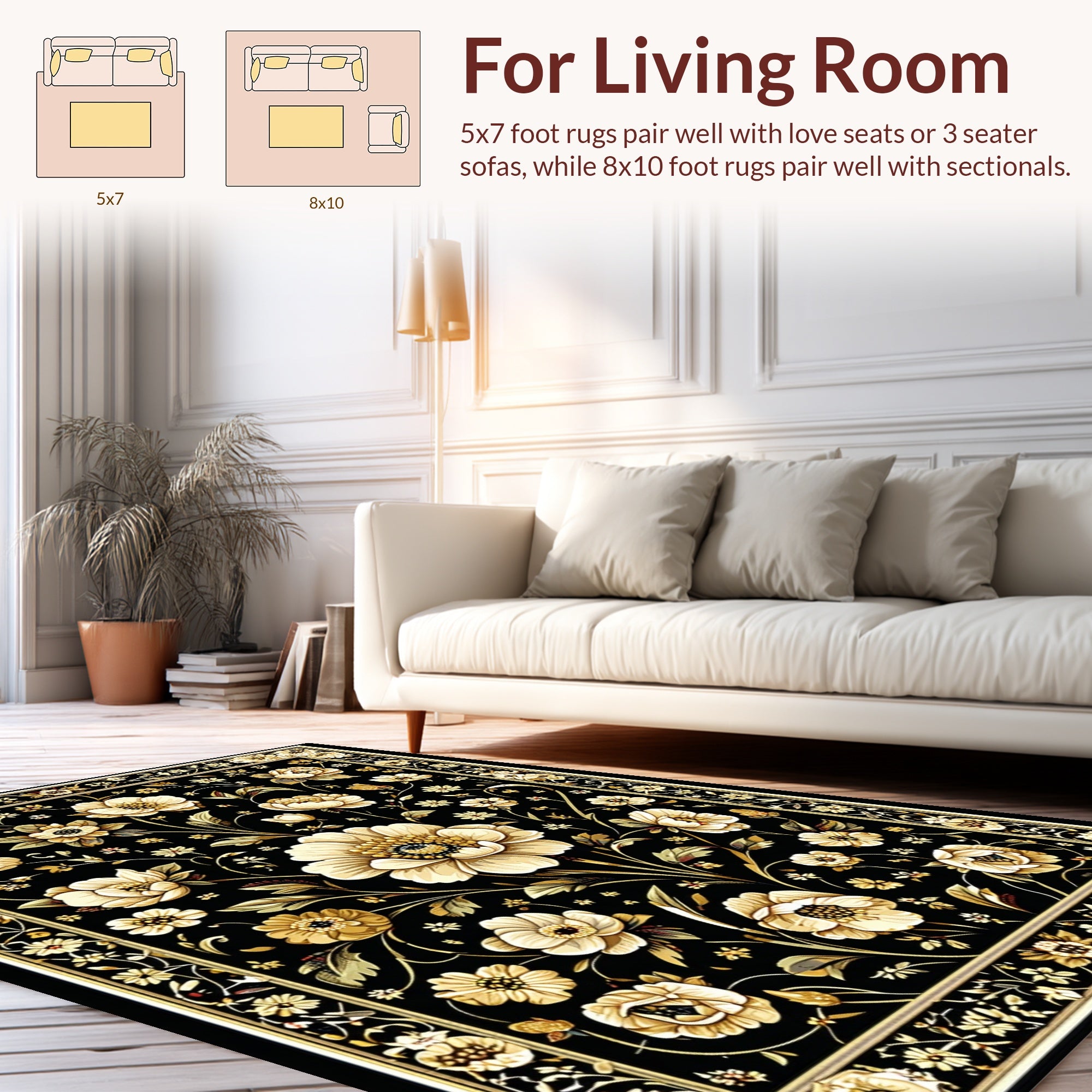 Flatwoven High Traffic Area Rug, Sophisticated Digital Floral Print, Non Slip, Stain Resistant, Washable Area Rugs for Living Room, Bedroom (Black) Overview: