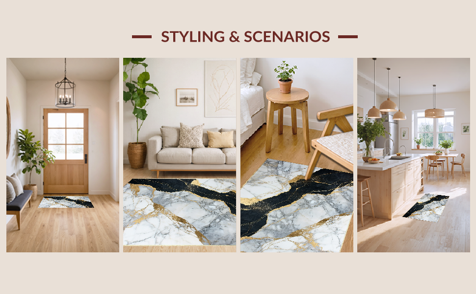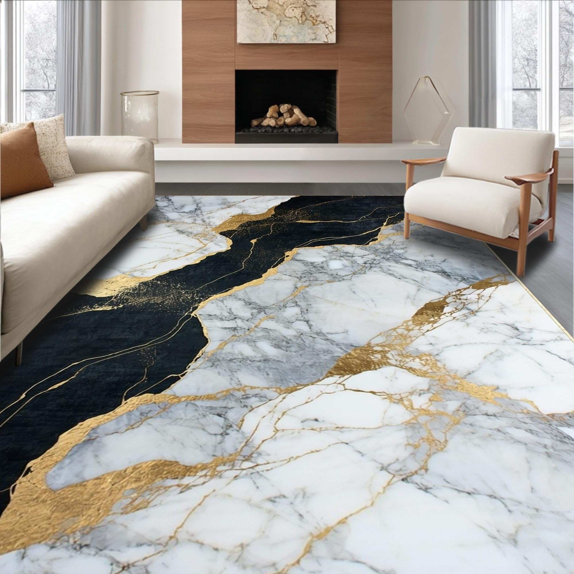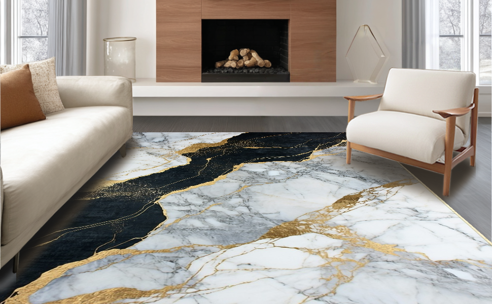 Ultra Soft Area Rug, Non Slip, Stain Resistant, Washable Area Rugs for Living Room, Bedroom, Sophisticated Geometric Gold Accents(White) Overview: