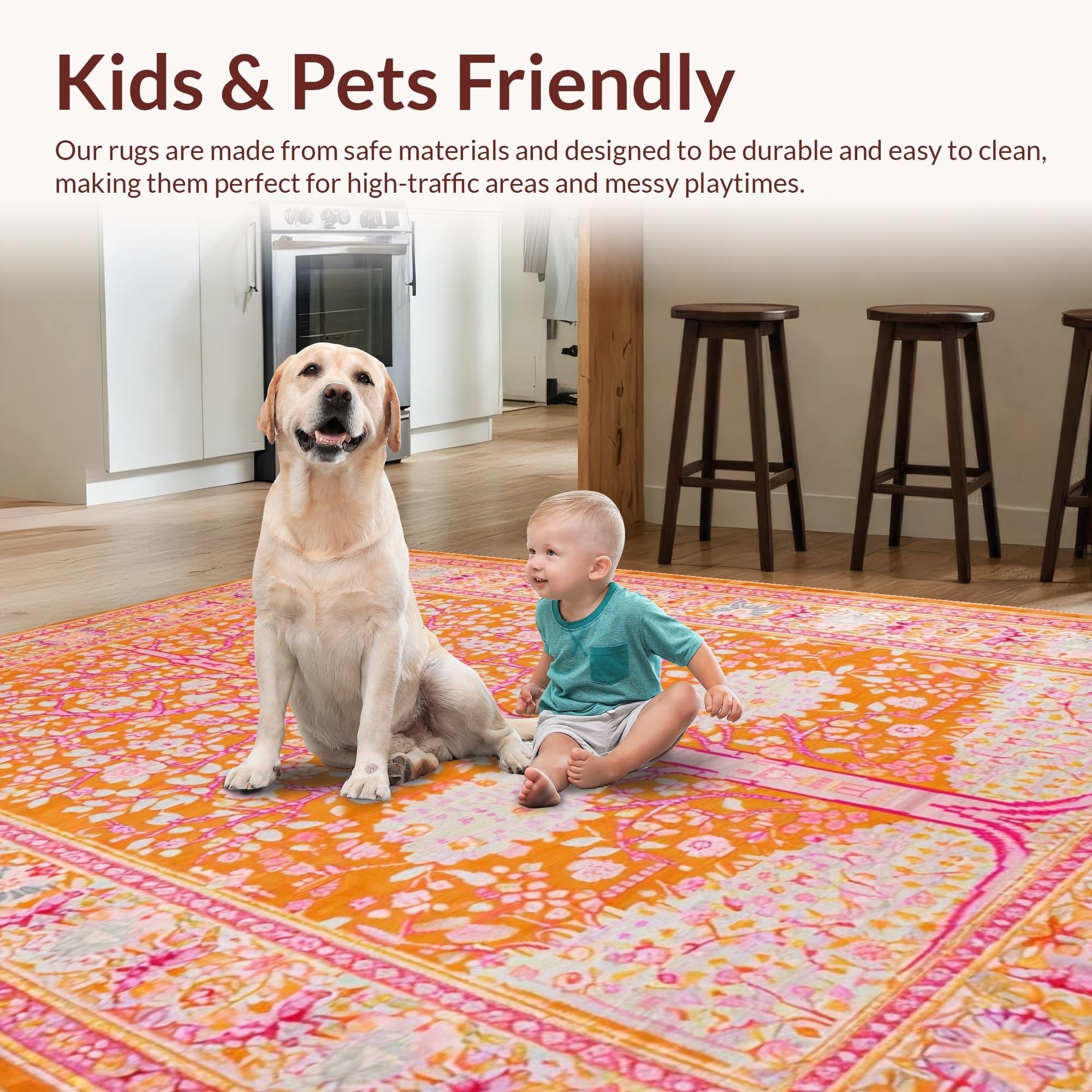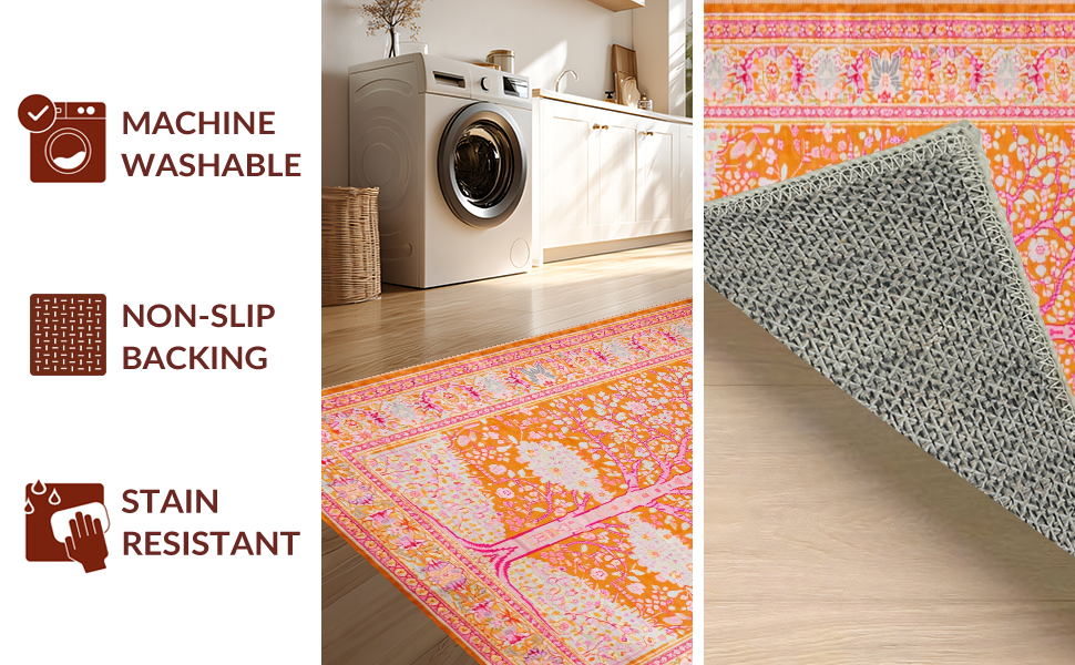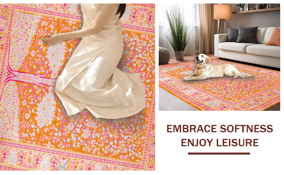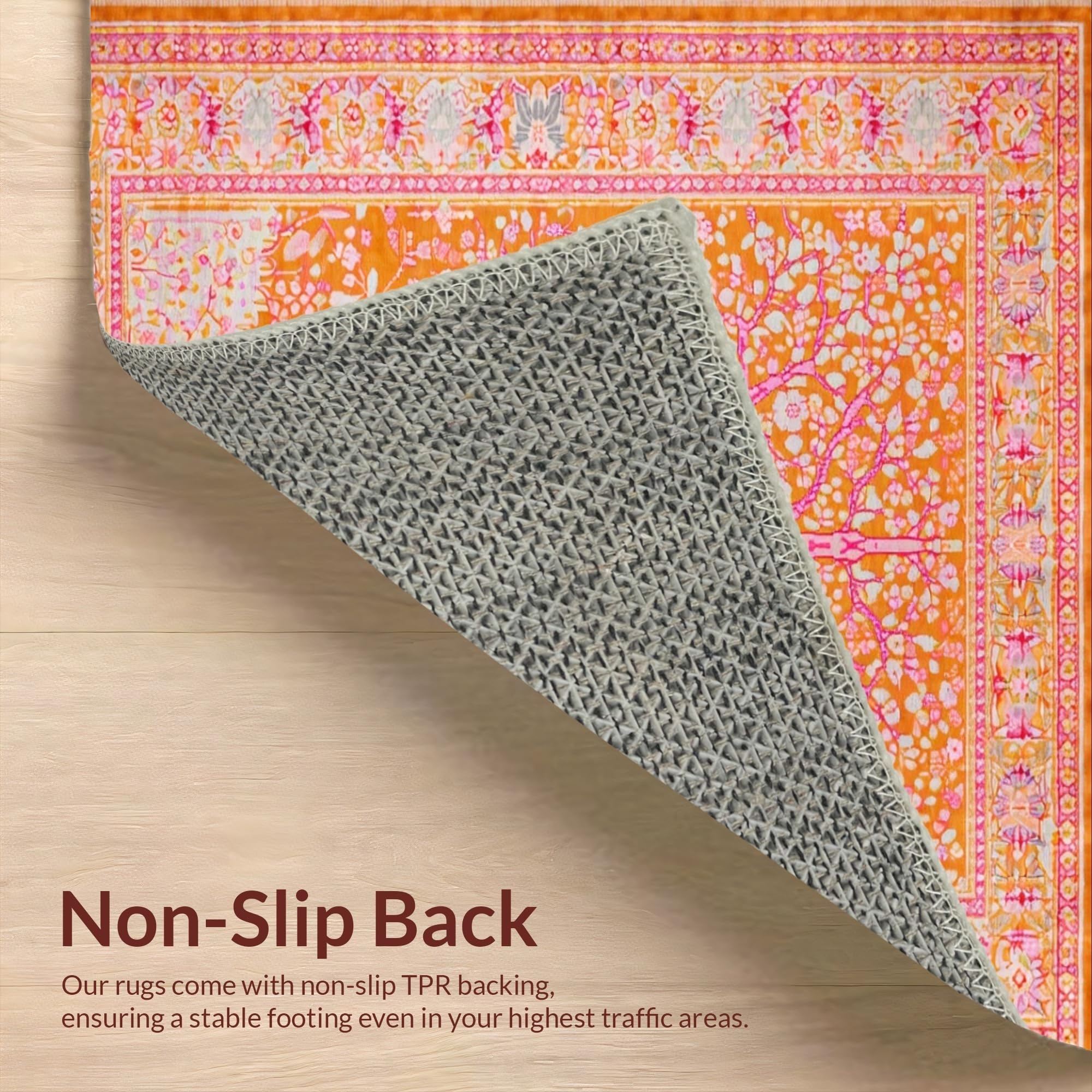 Ultra Soft Area Rug, Non Slip, Stain Resistant, Washable Area Rugs for Living Room, Bedroom, Sophisticated Retro Floral Composition(Orange) Overview: