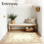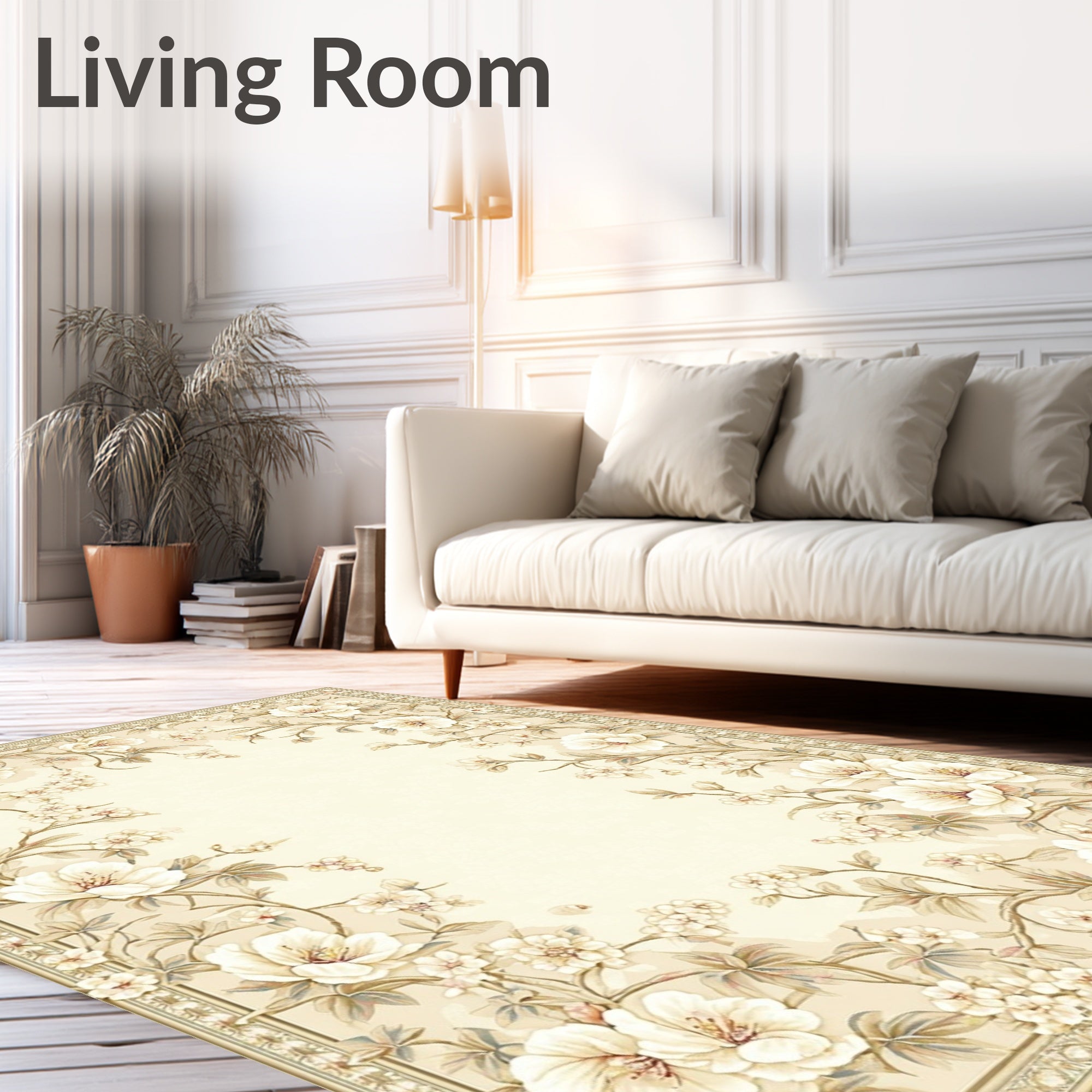 Flatwoven High Traffic Area Rug, Sophisticated Round with Timeless Ivory and Beige Floral Accents, Non Slip, Stain Resistant, Washable Area Rugs for Living Room, Bedroom (Beige) Overview: