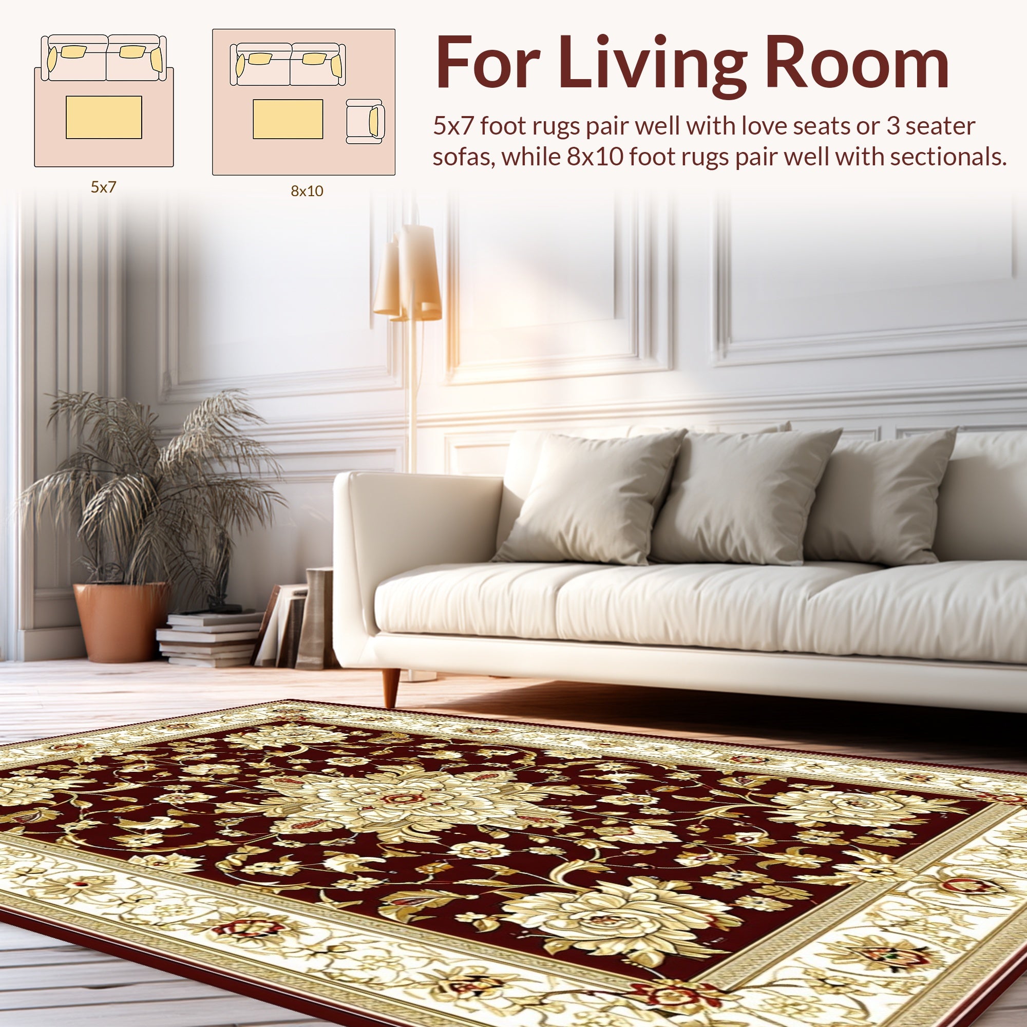 Flatwoven High Traffic Area Rug, Sophisticated Timeless Botanical Design, Non Slip, Stain Resistant, Washable Area Rugs for Living Room, Bedroom (Red) Overview: