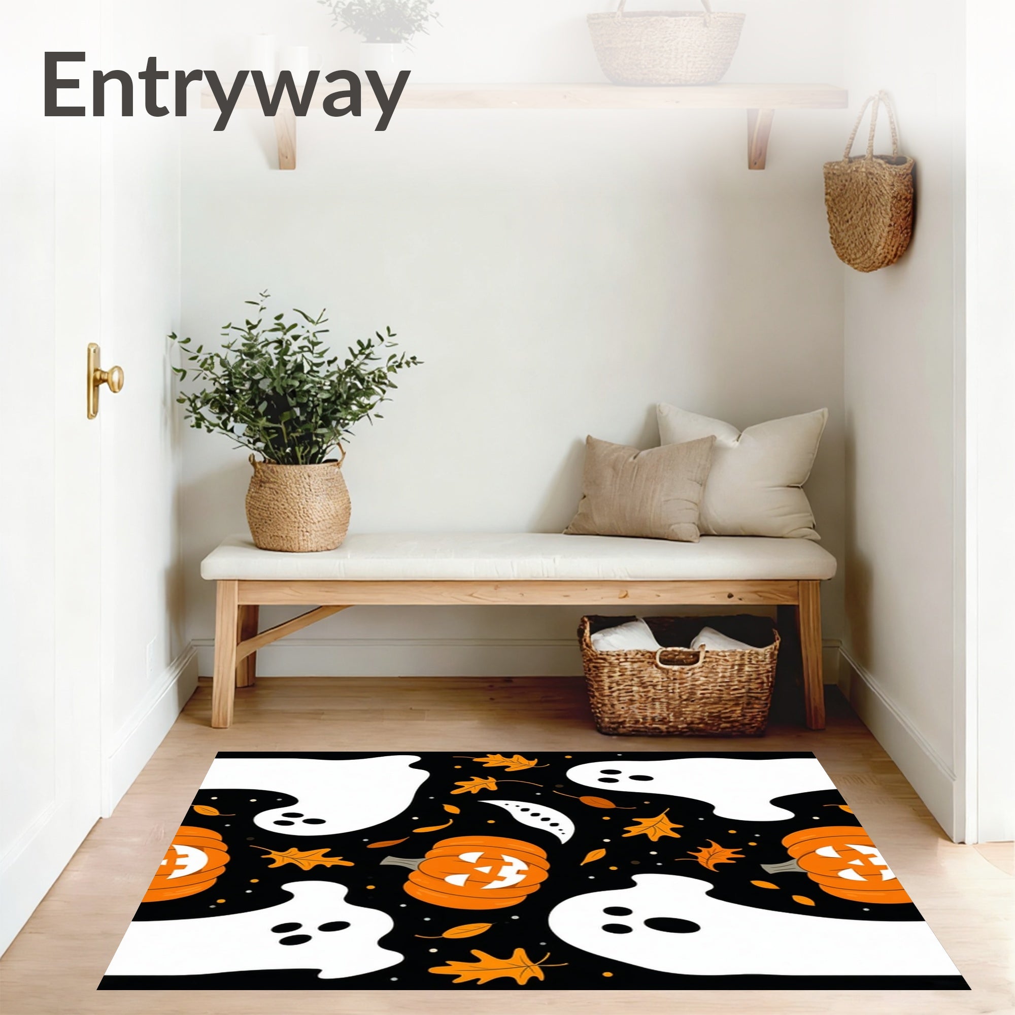Flatwoven High Traffic Area Rug, Spooky Ghosts Welcome for Autumn Halloween, Non Slip, Stain Resistant, Washable Area Rugs for Living Room, Bedroom (Black) Overview: