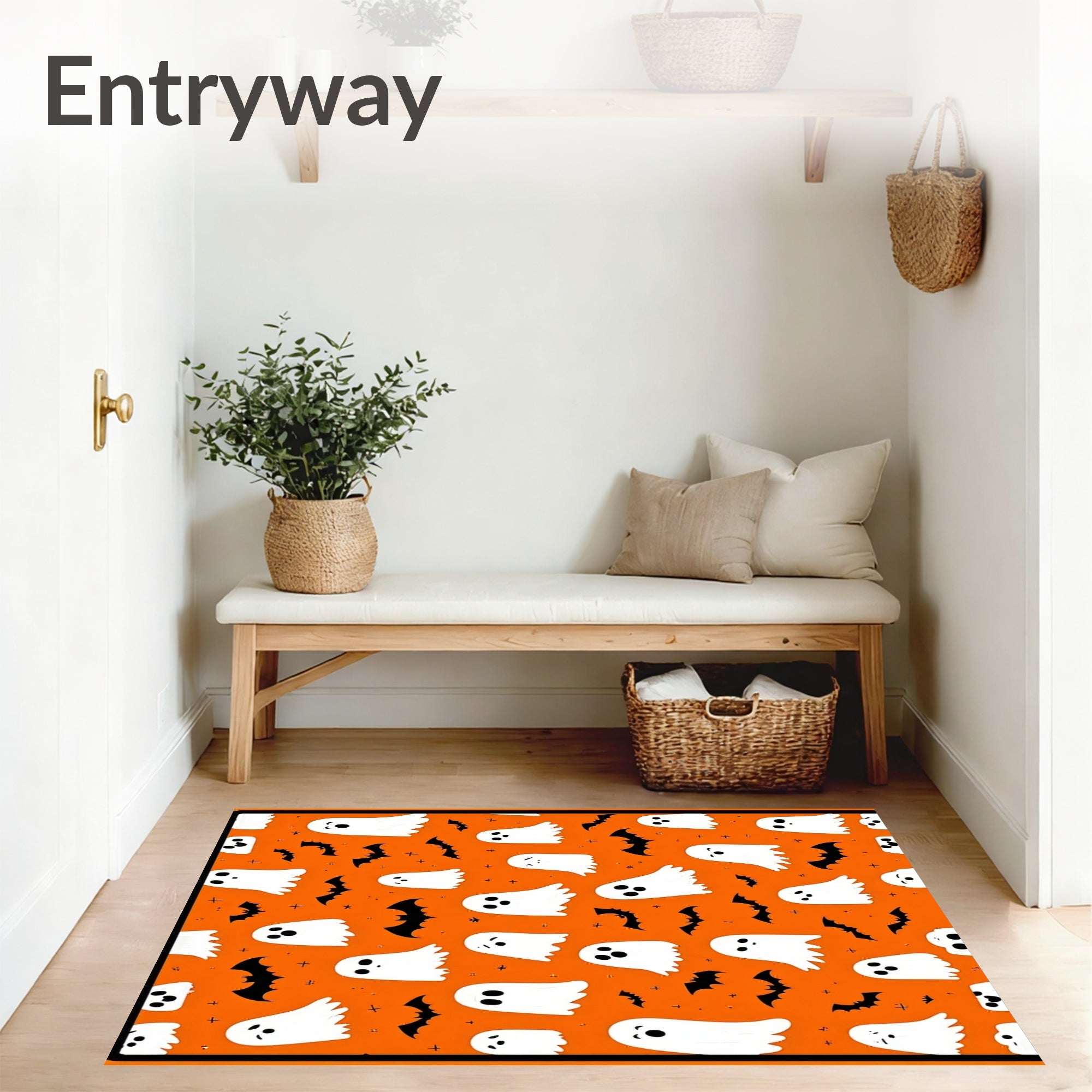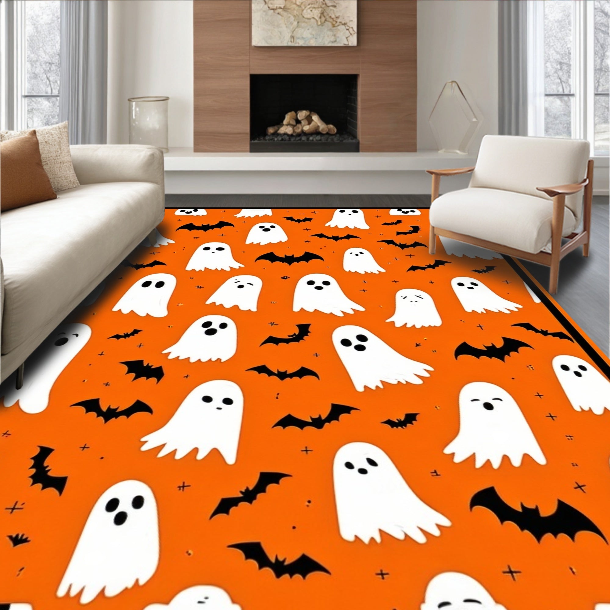 Flatwoven High Traffic Area Rug, Spooky Halloween Ghostly Entrance, Non Slip, Stain Resistant, Washable Area Rugs for Living Room, Bedroom (White) Overview: