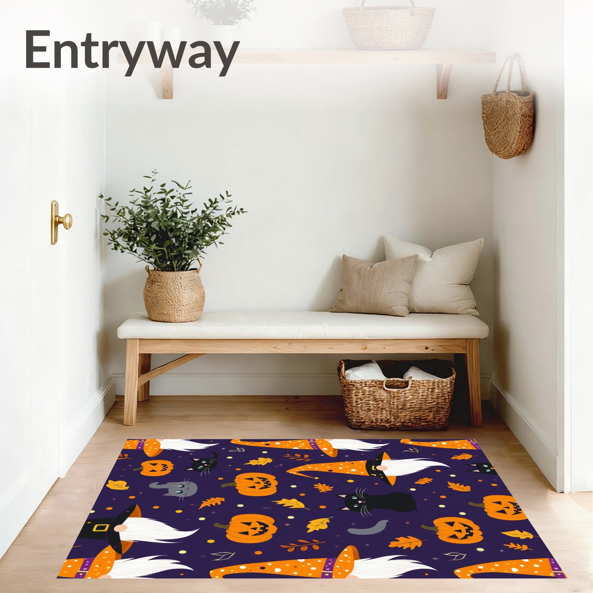 Flatwoven High Traffic Area Rug, Spooky Harvest Festive Cat Gnome Entrance Autumn, Non Slip, Stain Resistant, Washable Area Rugs for Living Room, Bedroom (Purple) Overview: