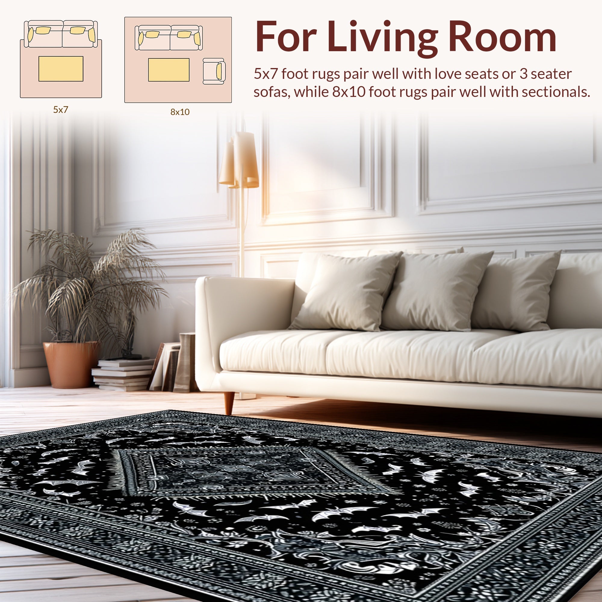 Flatwoven High Traffic Area Rug, Striking Gothic Charm Theme, Non Slip, Stain Resistant, Washable Area Rugs for Living Room, Bedroom (Black) Overview: