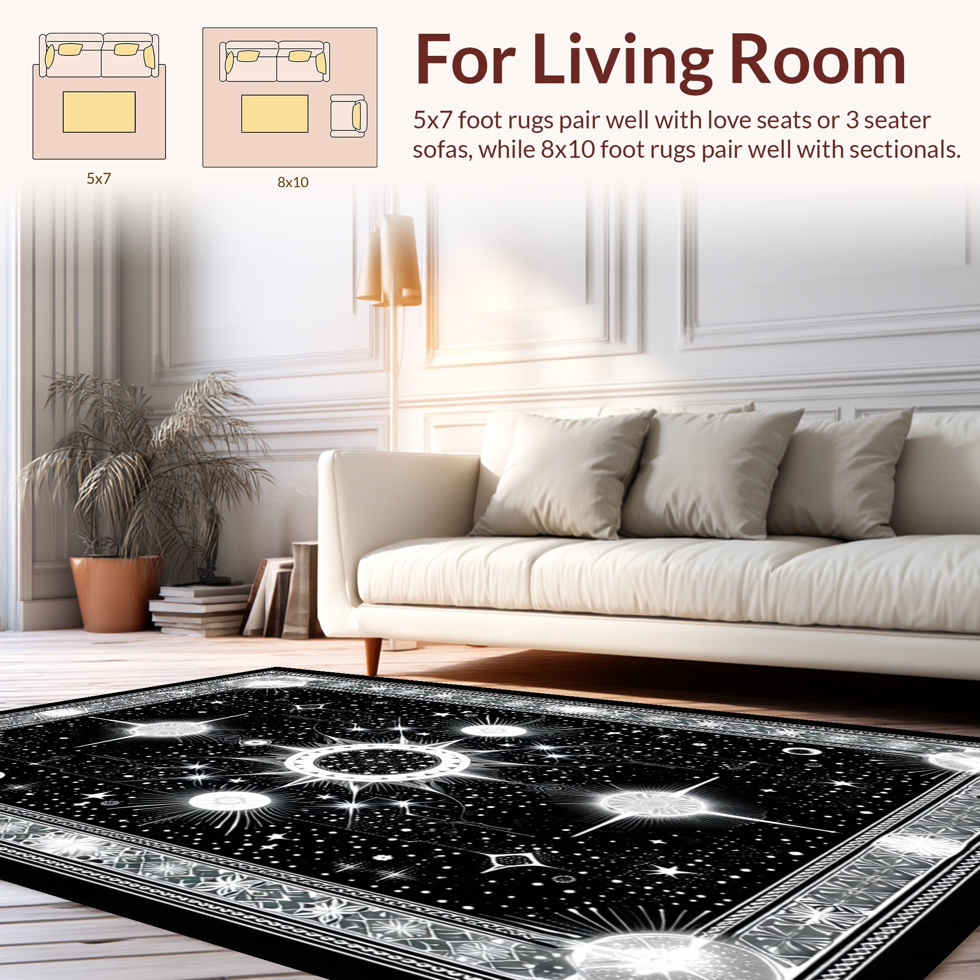 Flatwoven High Traffic Area Rug, Striking Sun and Moon Abstract Theme, Non Slip, Stain Resistant, Washable Area Rugs for Living Room, Bedroom (Black) Overview: