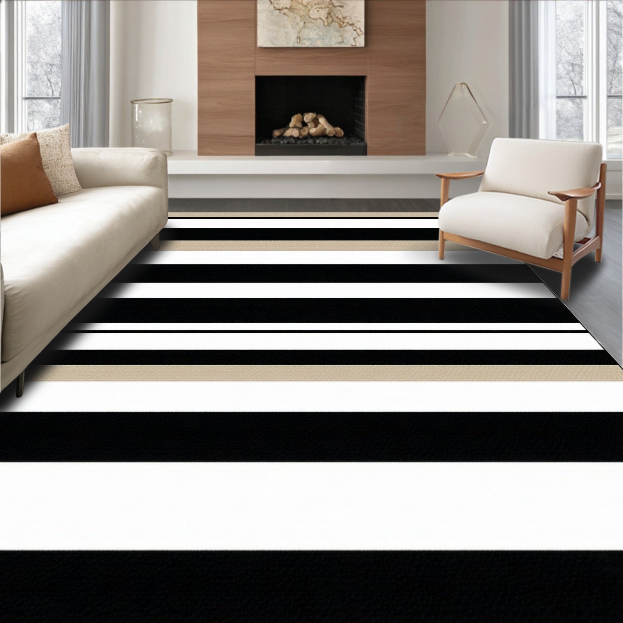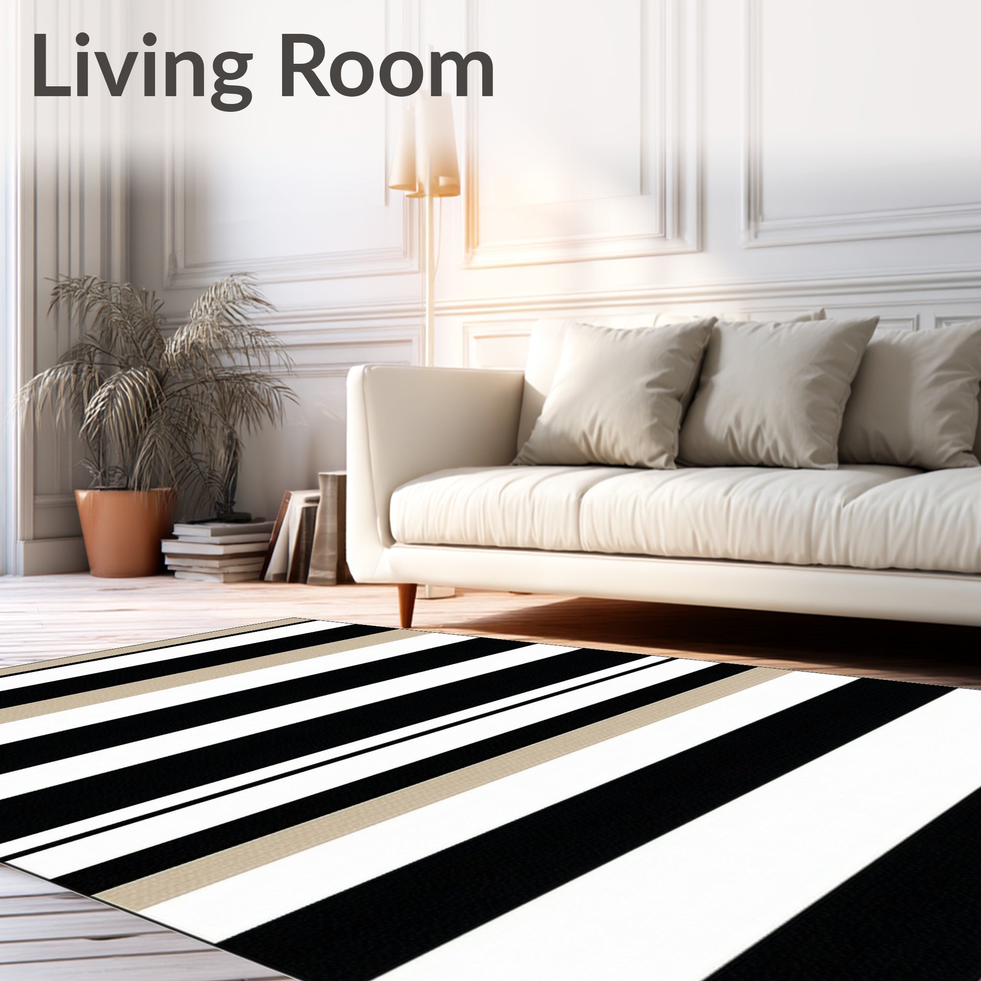Flatwoven High Traffic Area Rug, Striped Black and Beige Waterproof Patio, Non Slip, Stain Resistant, Washable Area Rugs for Living Room, Bedroom (Beige) Overview: