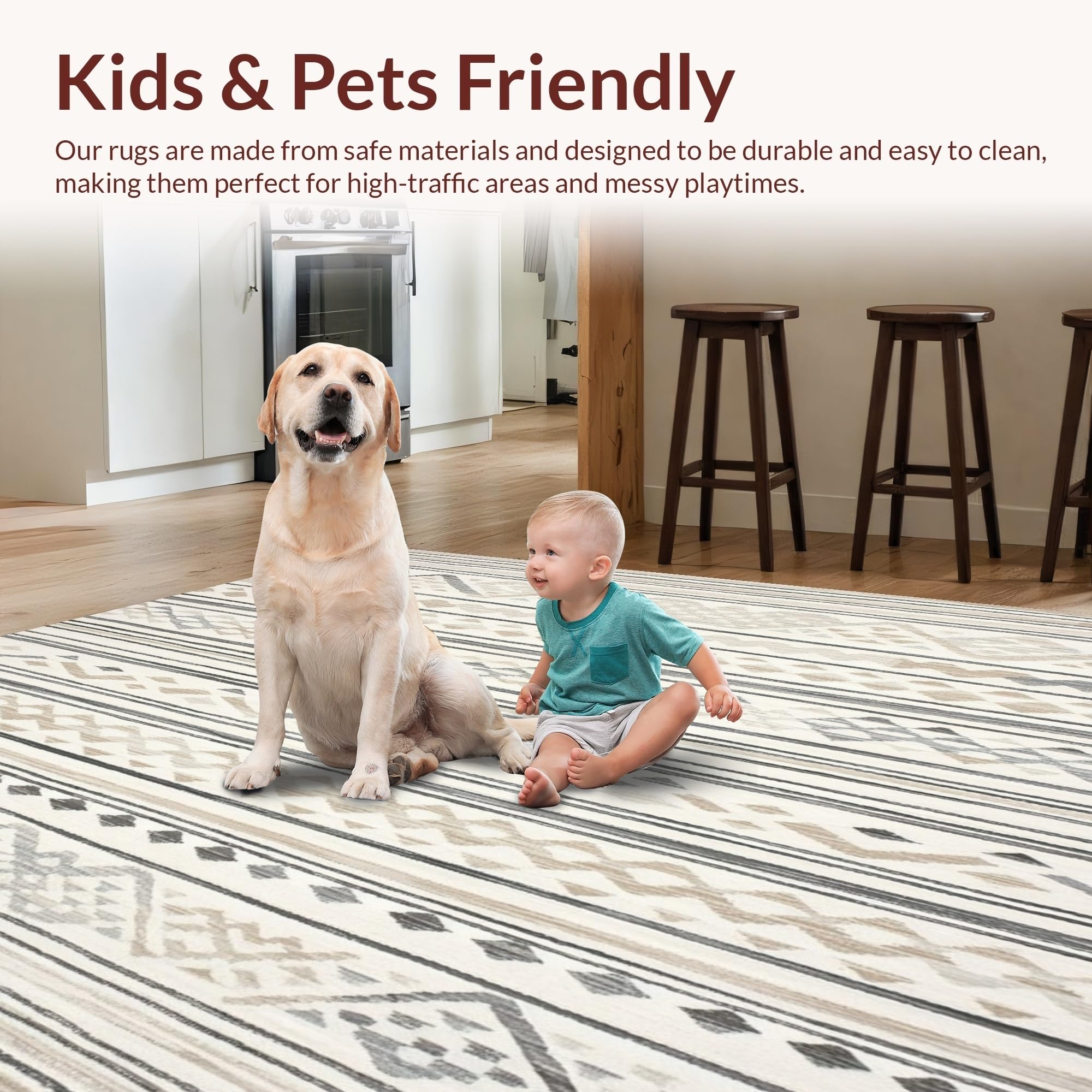 Ultra Soft Area Rug, Non Slip, Stain Resistant, Washable Area Rugs for Living Room, Bedroom, Striped Geometric Fusion Area with Casual Boho Diamond(Beige) Overview: