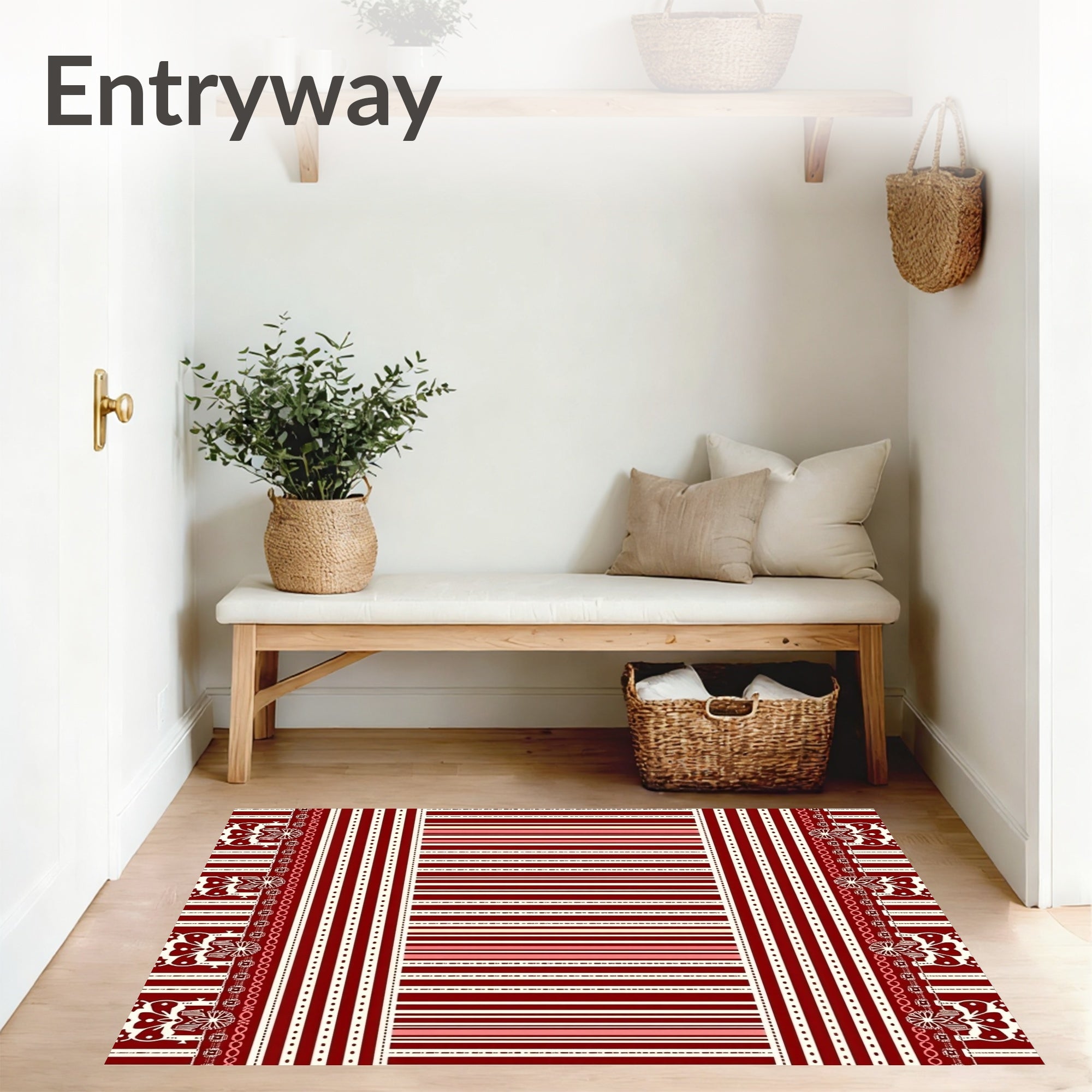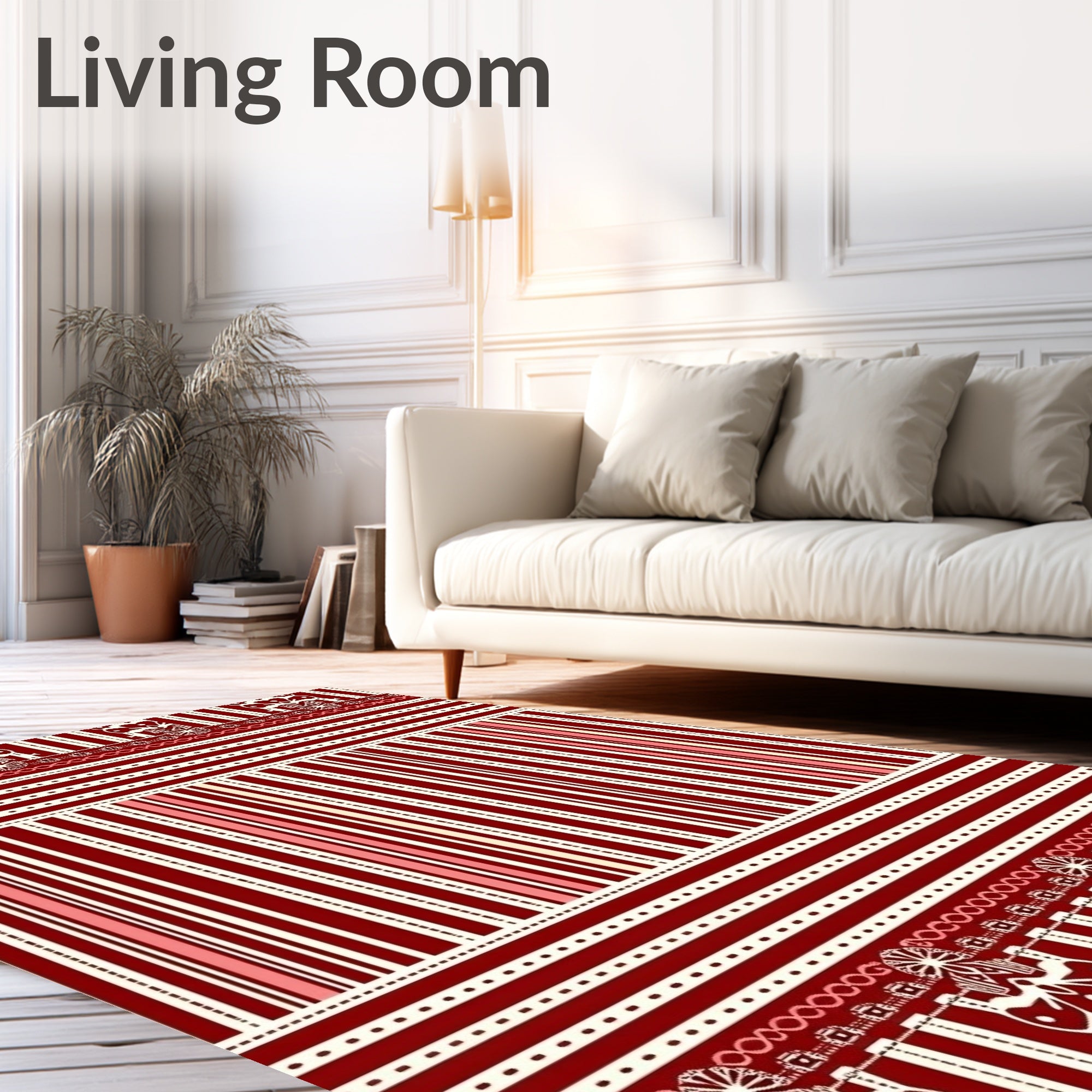 Ultra Soft Area Rug, Non Slip, Stain Resistant, Washable Area Rugs for Living Room, Bedroom, Striped Ribbon Bands with Polka Dot Embellishments and Festooned Bows(Red) Overview: