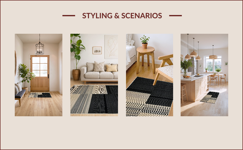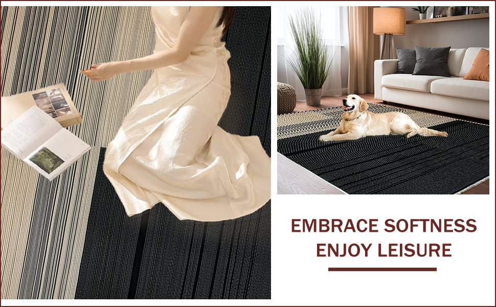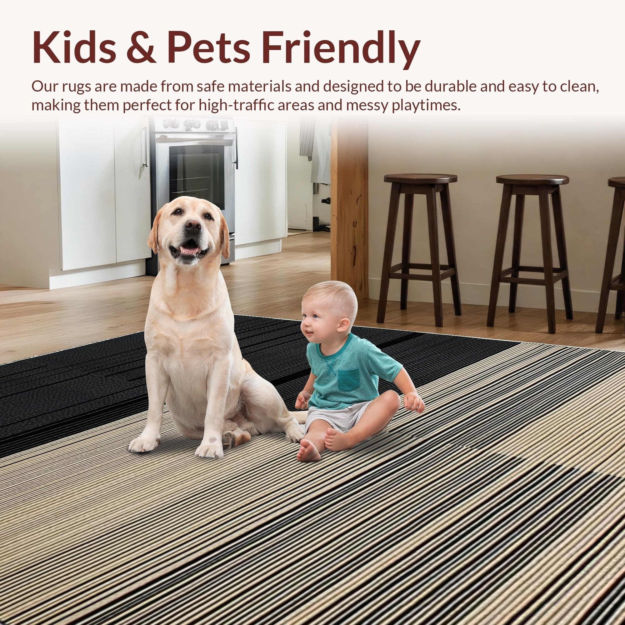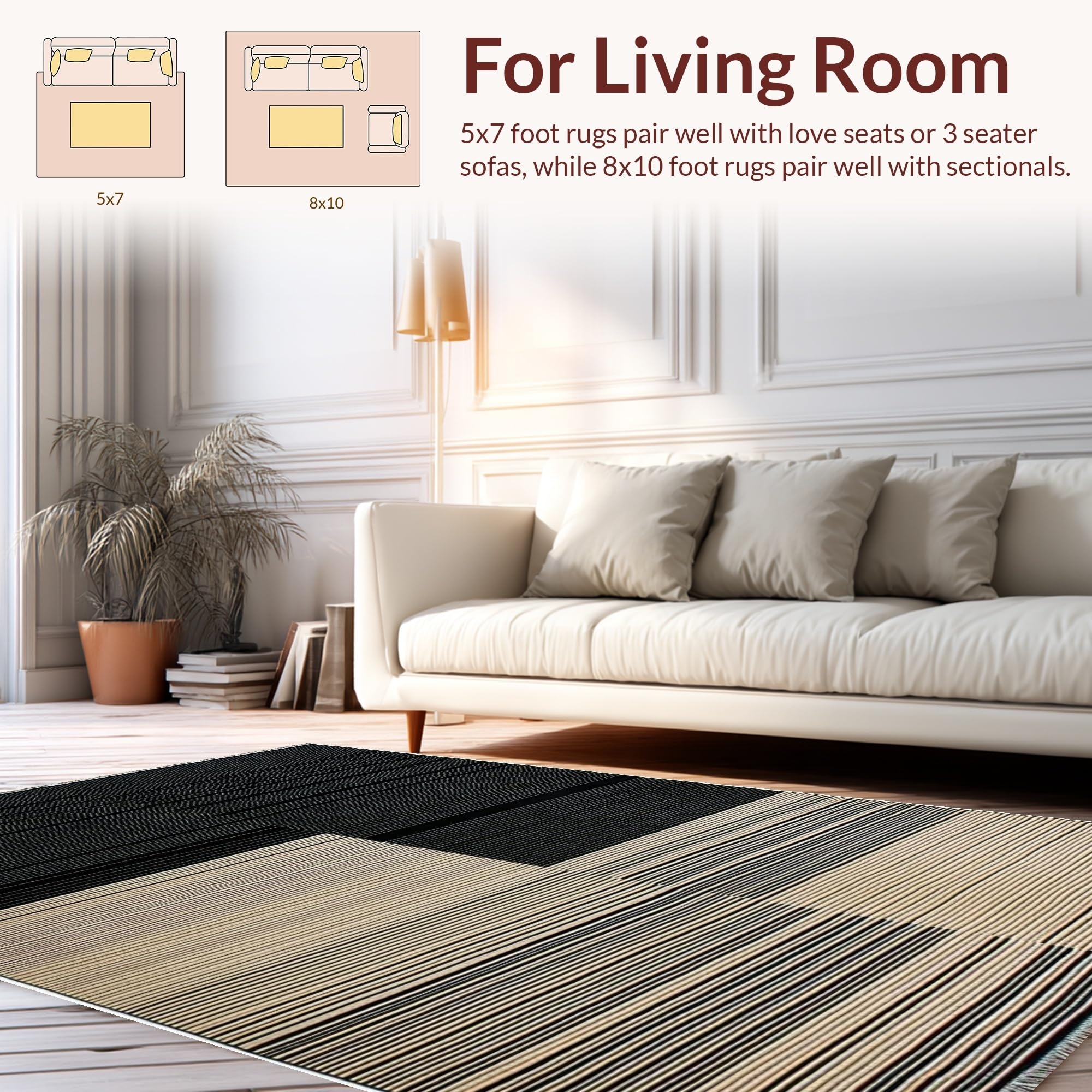 Ultra Soft Area Rug, Non Slip, Stain Resistant, Washable Area Rugs for Living Room, Bedroom, Stylish Primitive Linear Composition(Black) Overview: